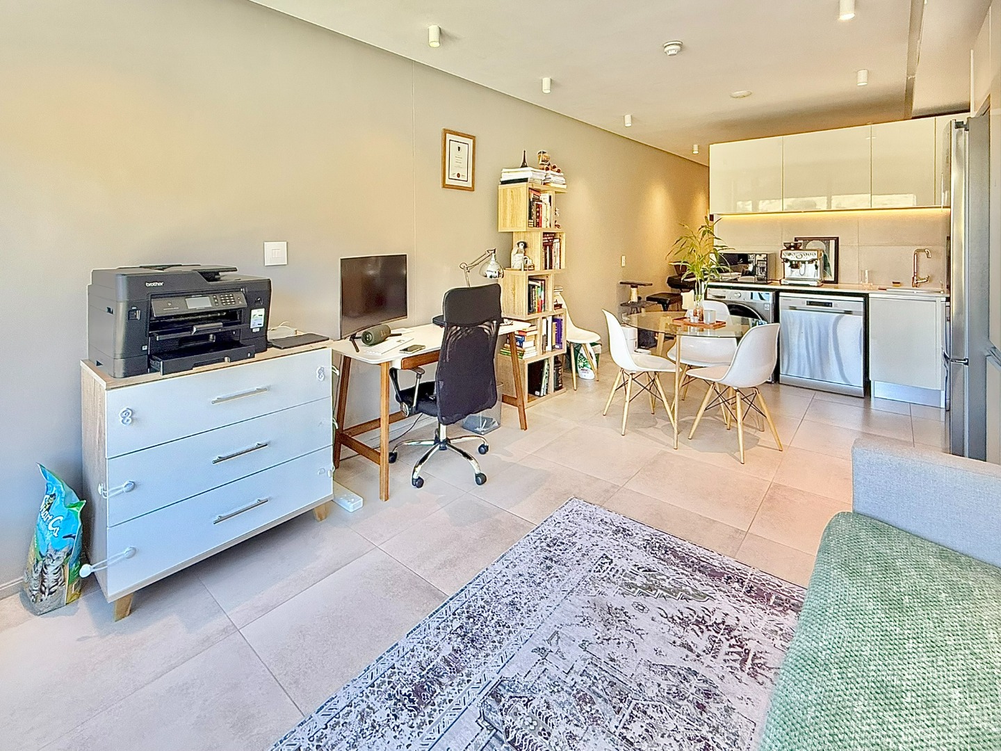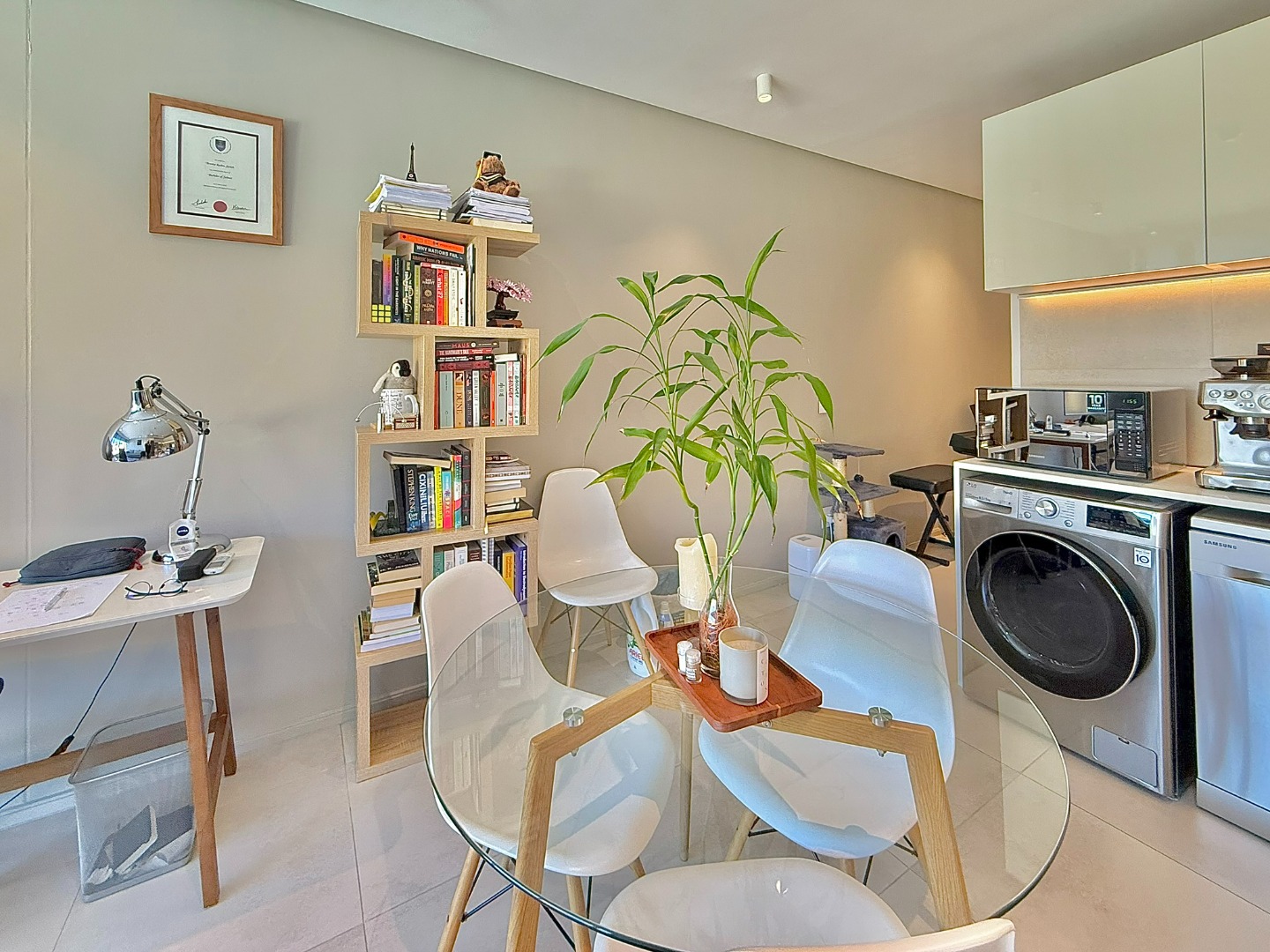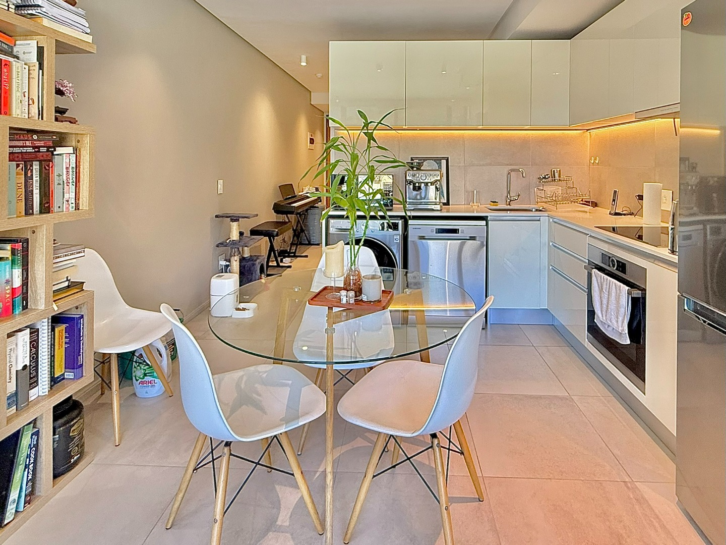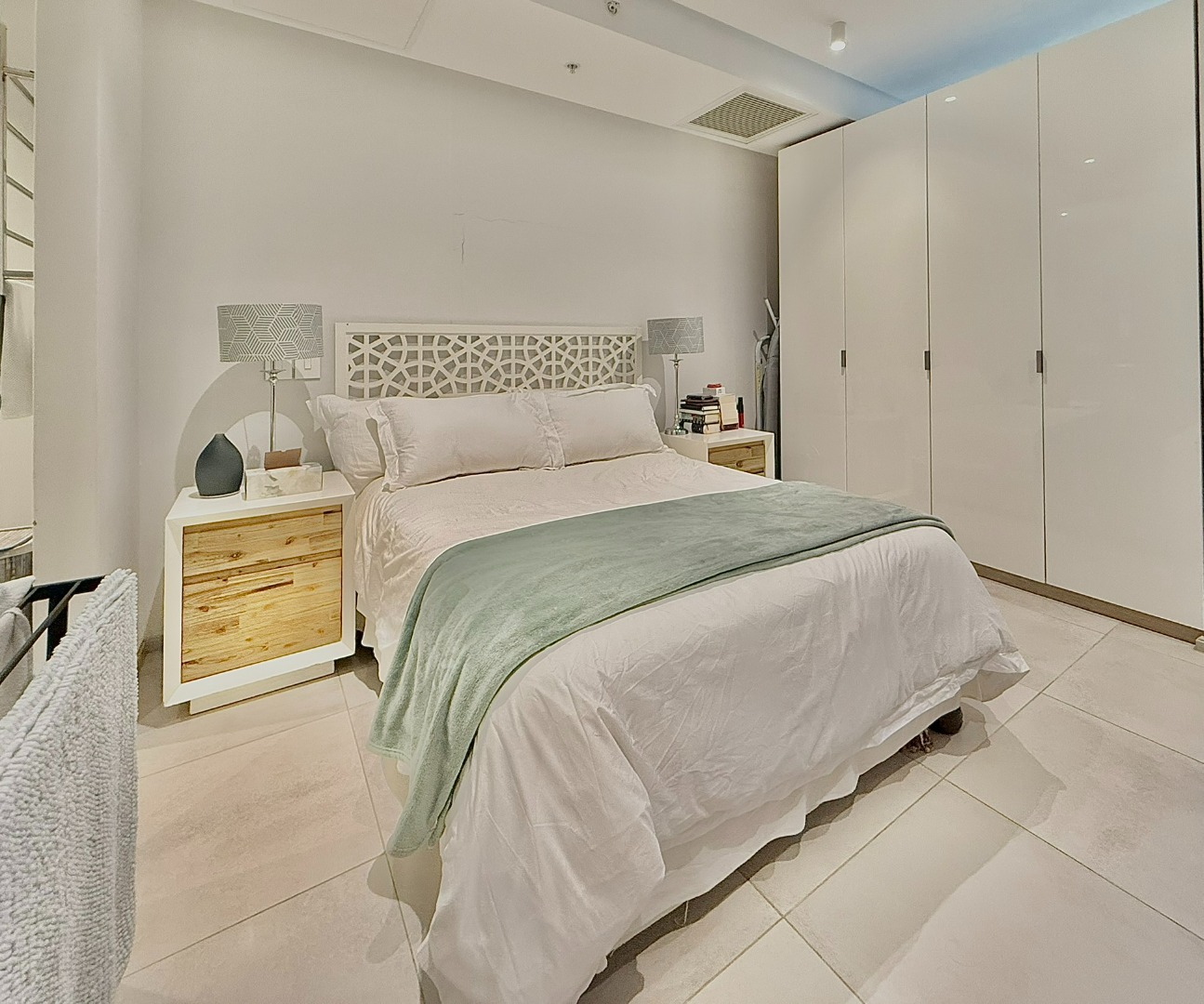 This studio apartment in 117 on Strand offers modern city living in a secure and central location. The open-plan layout includes a sleek, modern kitchen with an electric hob and stove, two water points for a washing machine and dishwasher, and LED lighting under the cabinets. Built-in cupboards create a subtle separation between the kitchen and living space. A large window fills the apartment with natural light and offers partial ocean views.