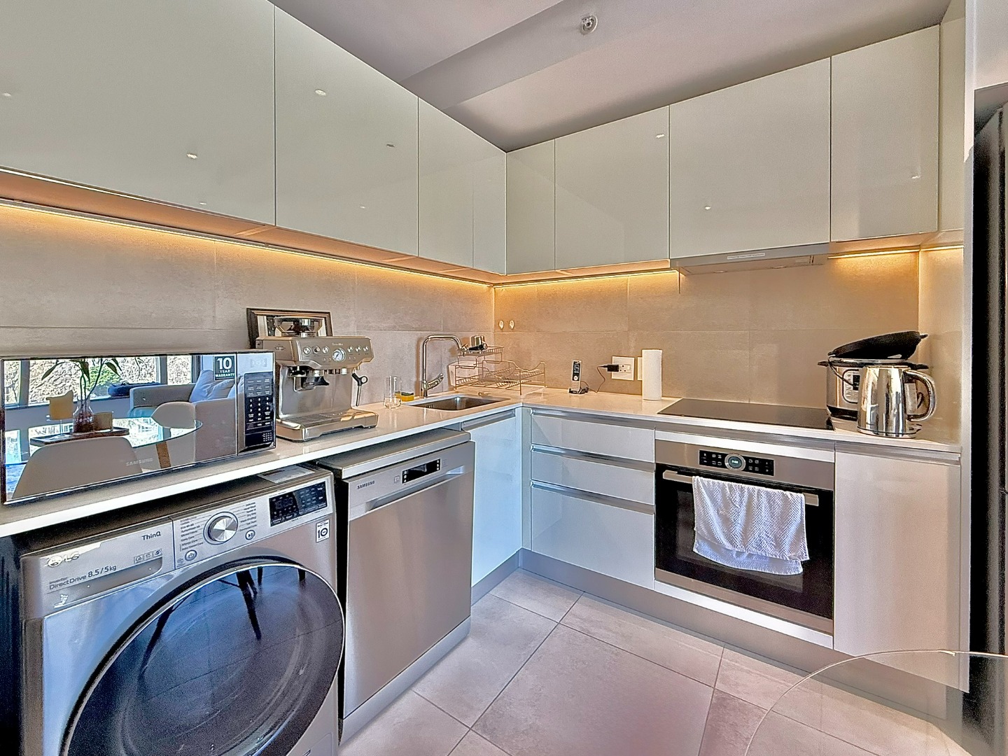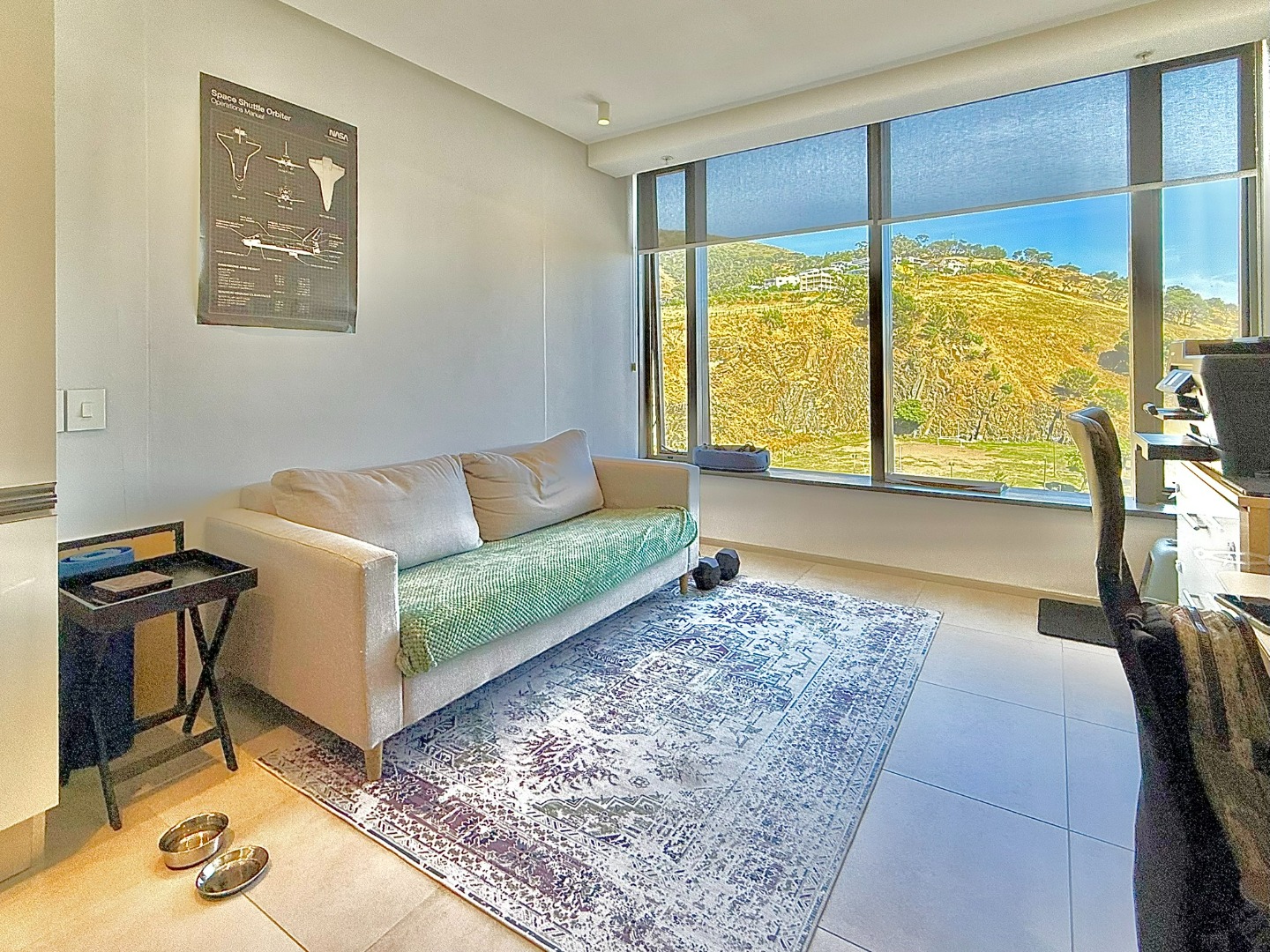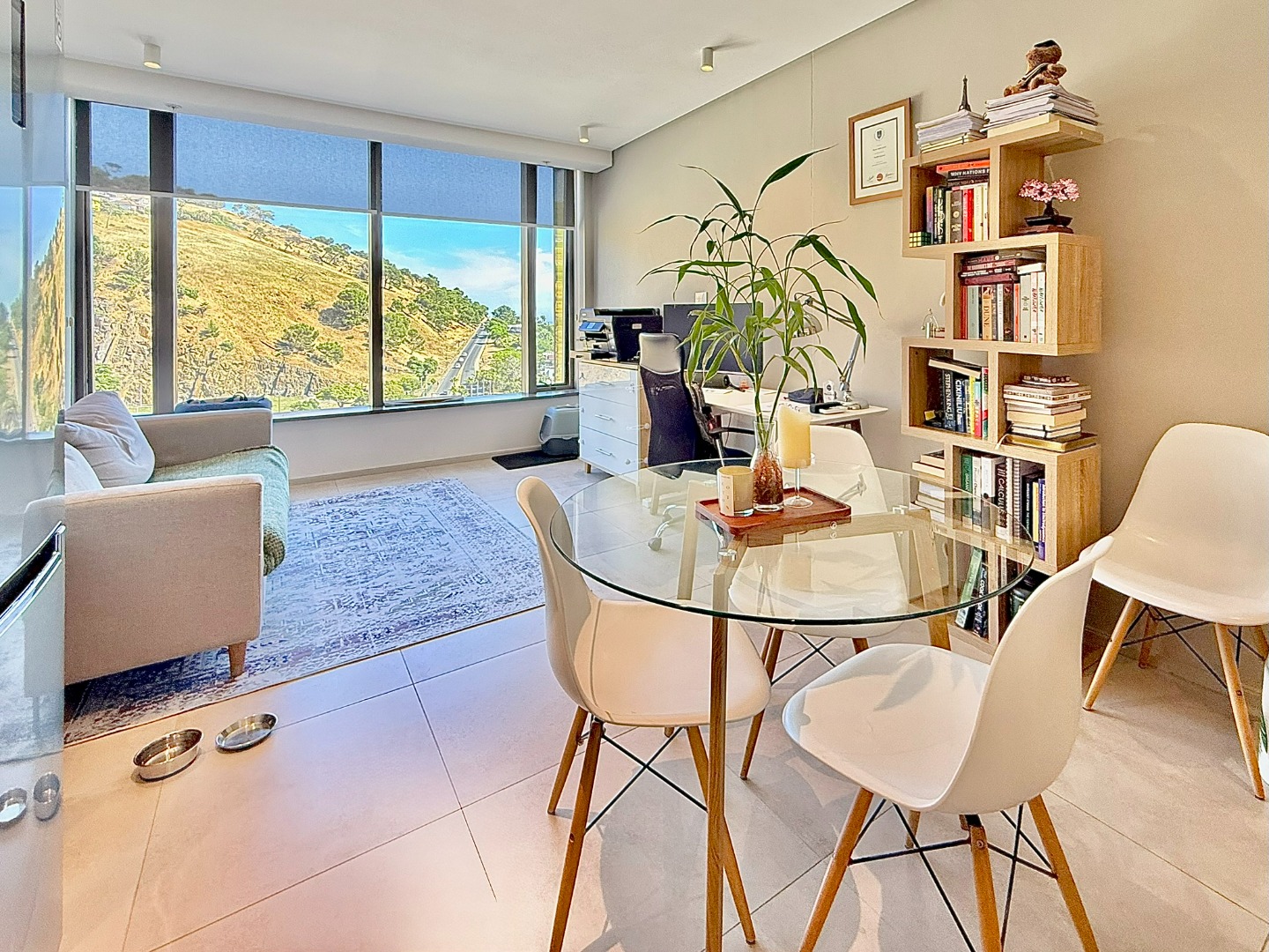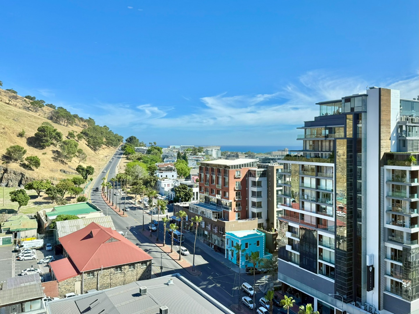 This studio apartment in 117 on Strand offers modern city living in a secure and central location. The open-plan layout includes a sleek, modern kitchen with an electric hob and stove, two water points for a washing machine and dishwasher, and LED lighting under the cabinets. Built-in cupboards create a subtle separation between the kitchen and living space. A large window fills the apartment with natural light and offers partial ocean views.