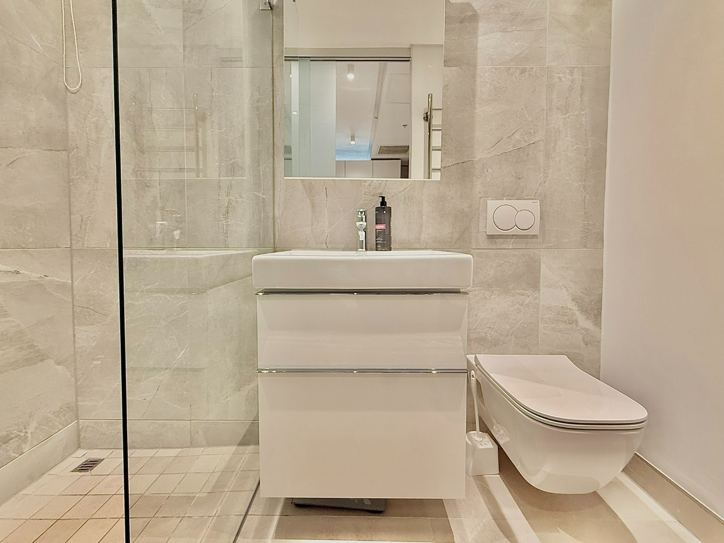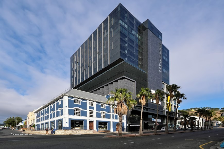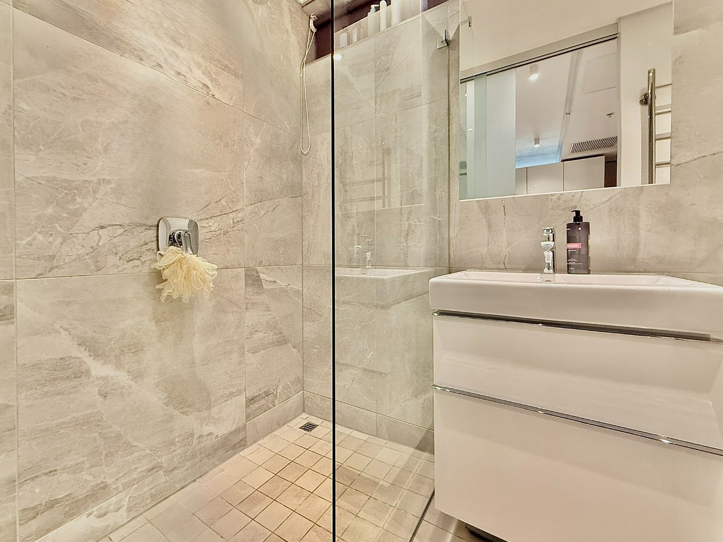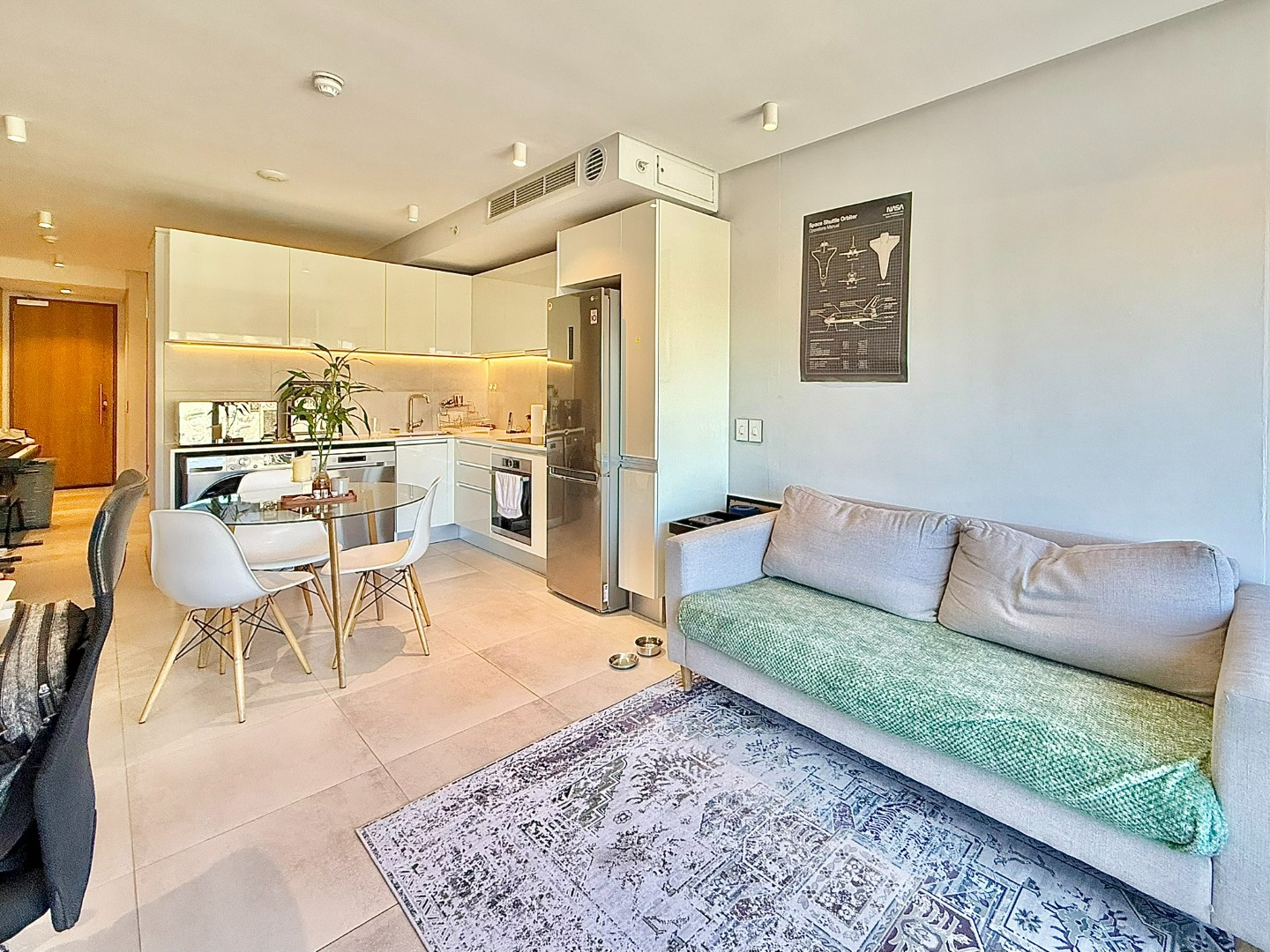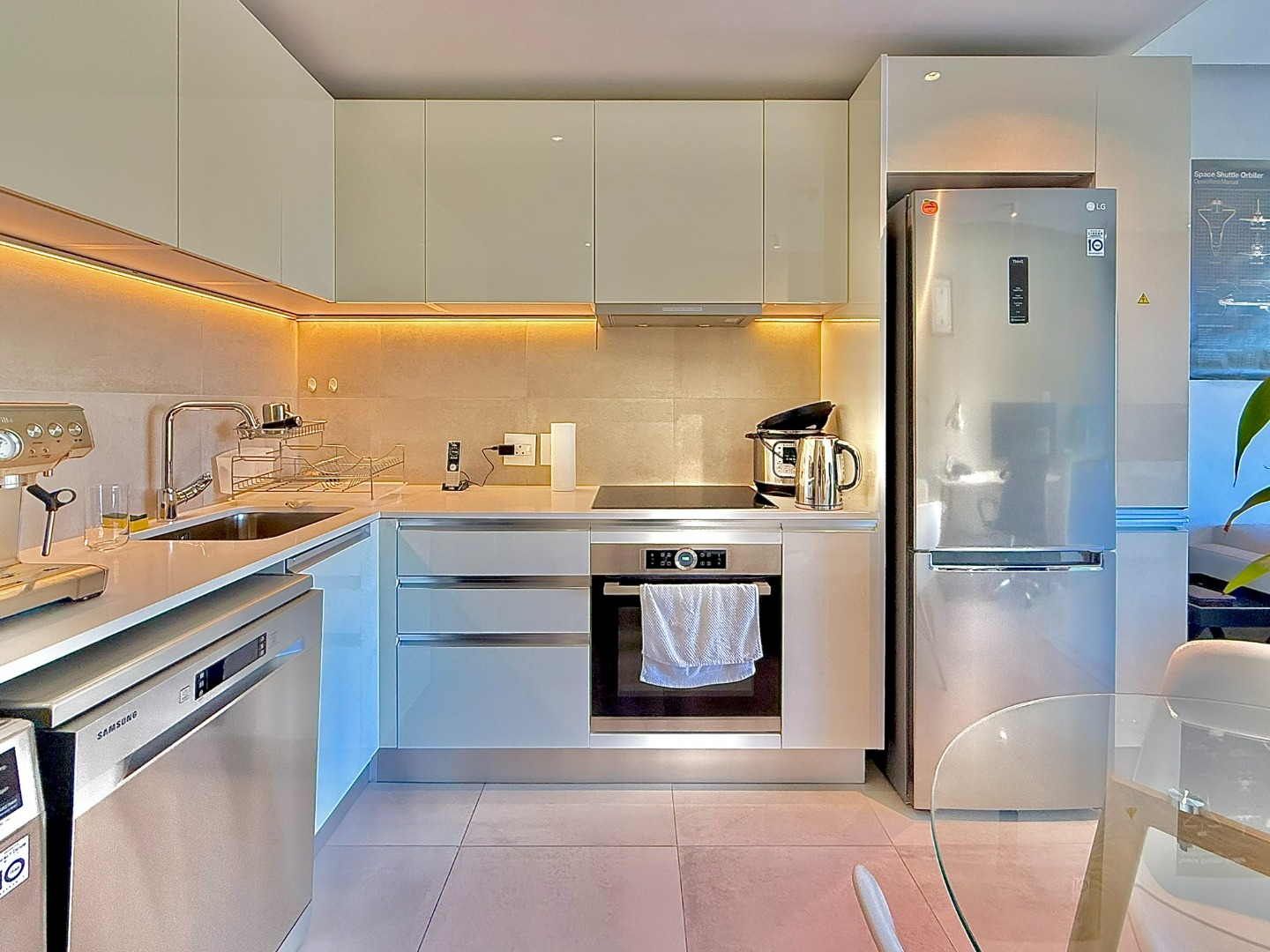 This studio apartment in 117 on Strand offers modern city living in a secure and central location. The open-plan layout includes a sleek, modern kitchen with an electric hob and stove, two water points for a washing machine and dishwasher, and LED lighting under the cabinets. Built-in cupboards create a subtle separation between the kitchen and living space. A large window fills the apartment with natural light and offers partial ocean views.