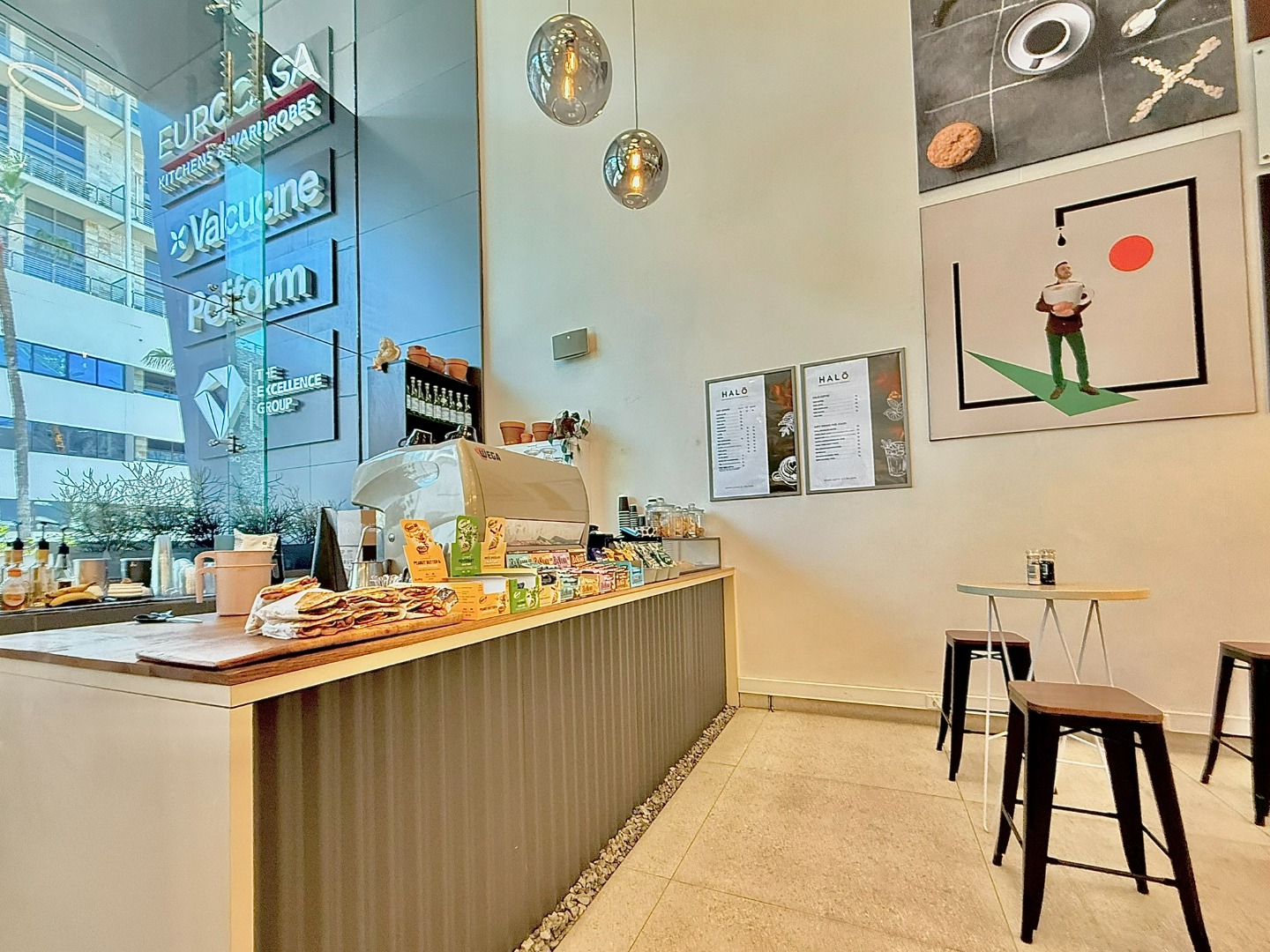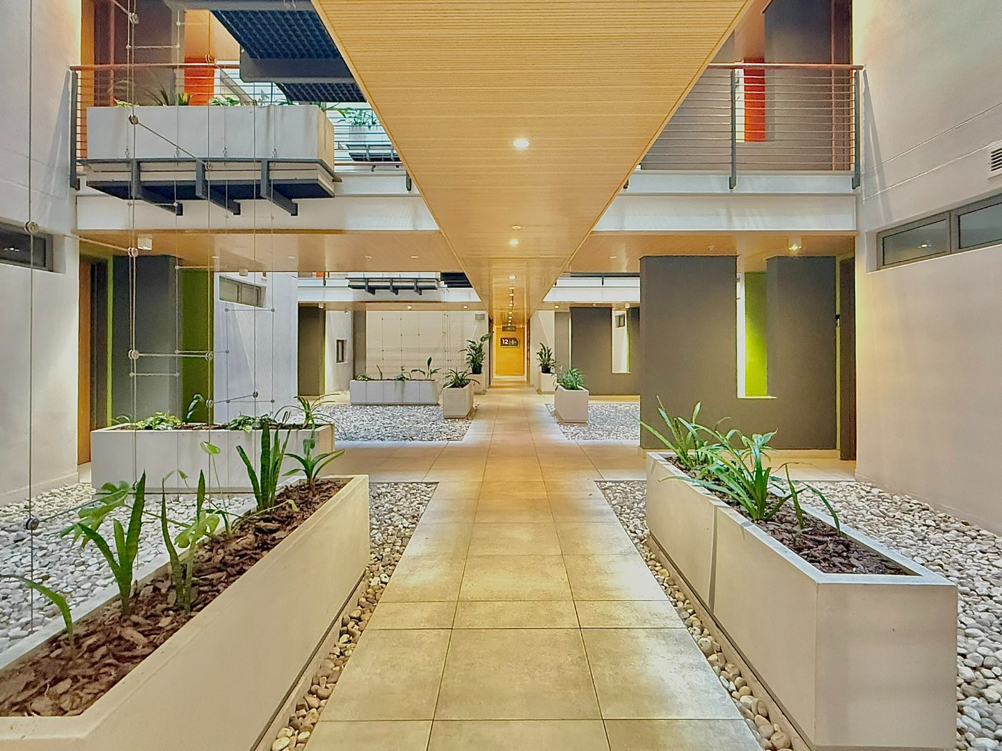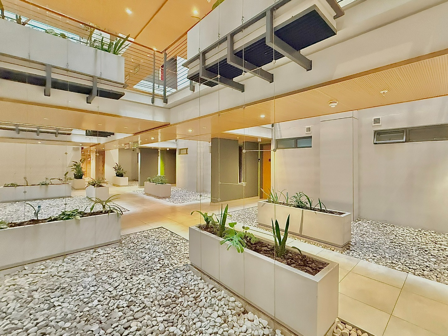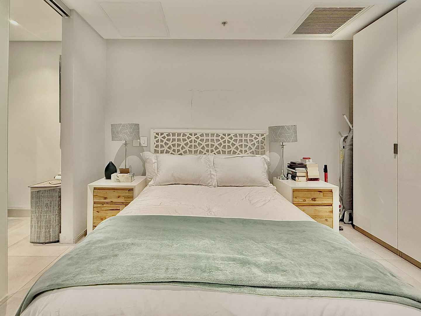 The bathroom features a walk-in shower, toilet, and basin. One secure, covered parking bay is included. The building provides 24-hour security with a controlled reception and private access to elevators. Residents benefit from the convenience of on-site facilities such as Planet Fitness, Pick n Pay, and the Halo coffee shop, all located within the same building. Pet-friendly with body corporate approval.