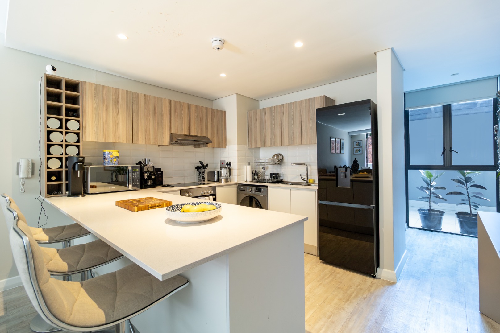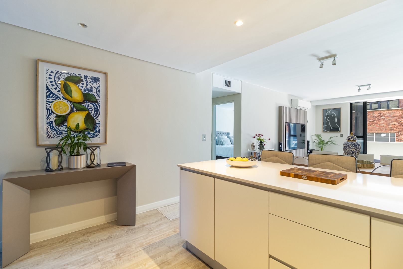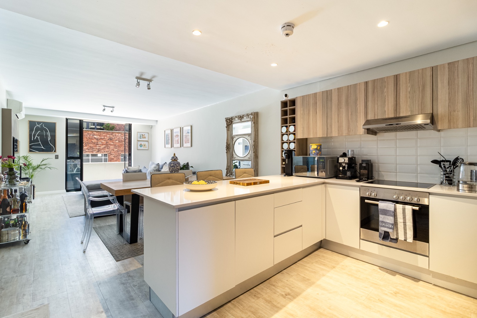 Open plan living layout, featuring a sleek modern kitchen with bar/ breakfast counter, flowing into a spacious dining and lounge area with vinyl flooring throughout. The large entertainment balcony is perfect for entertaining guests. Both bedrooms are generously sized with high ceilings and ample built in cabinetry.