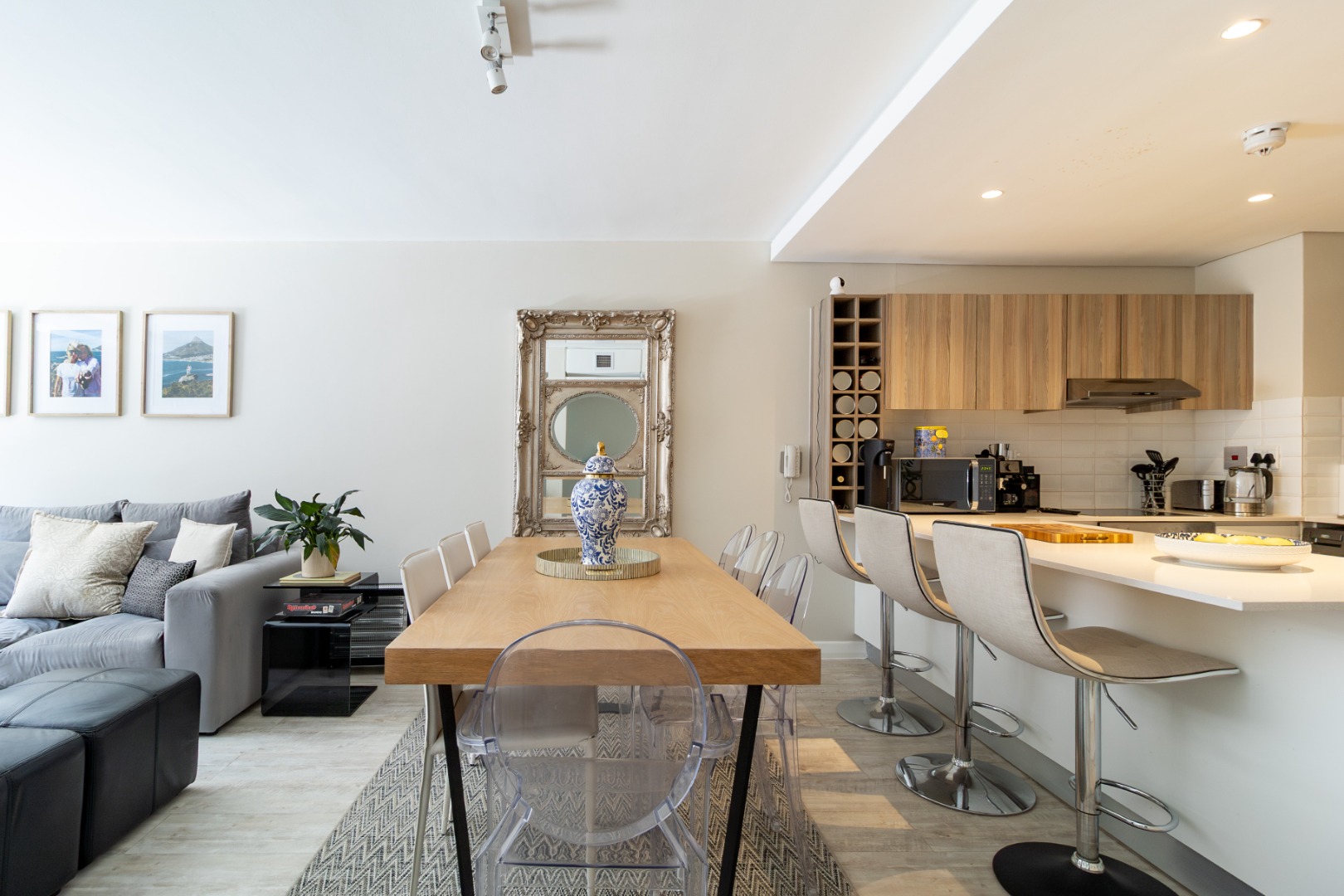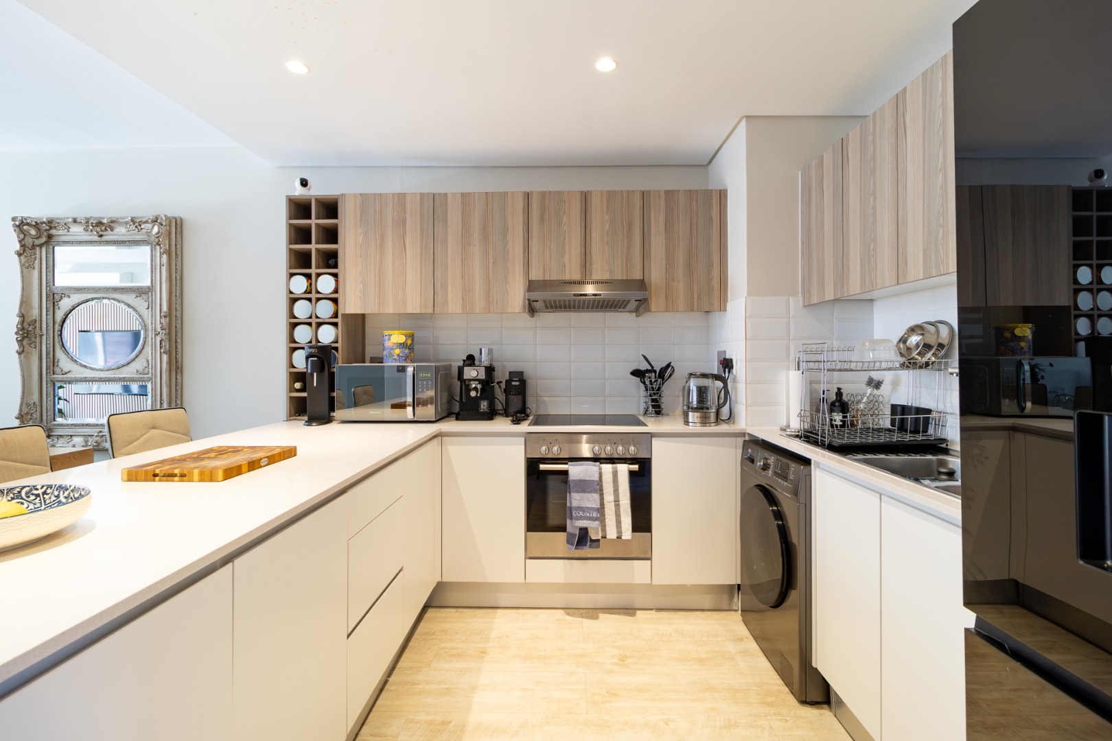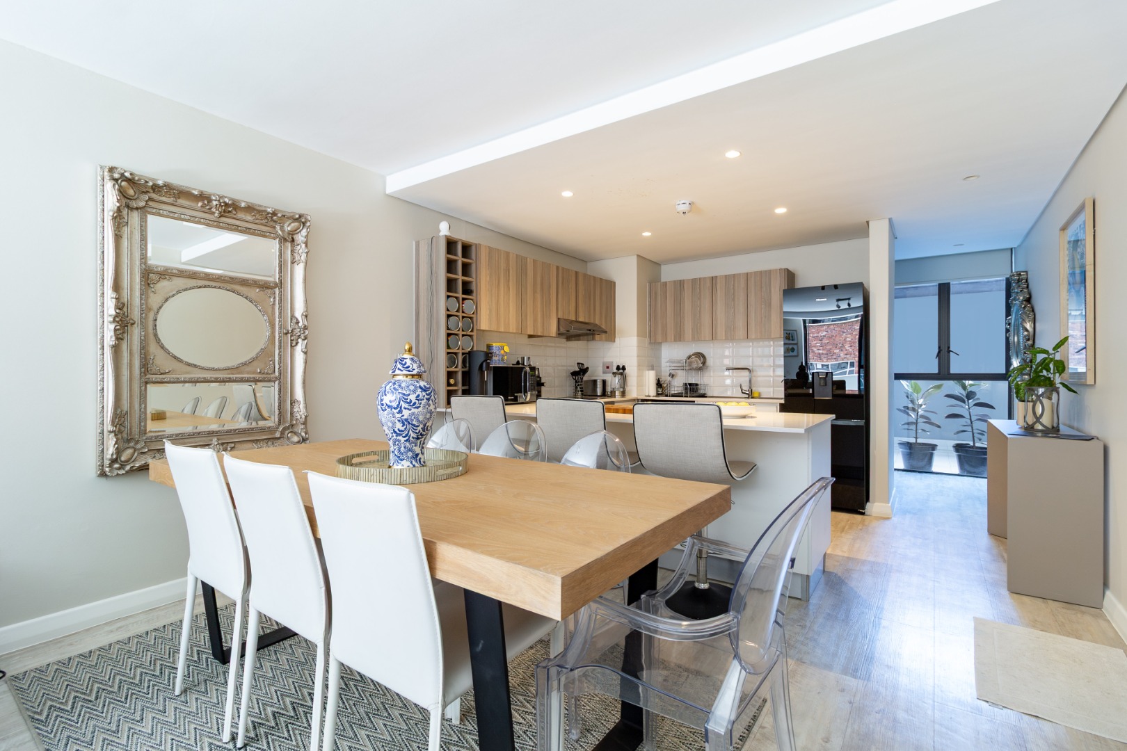 Open plan living layout, featuring a sleek modern kitchen with bar/ breakfast counter, flowing into a spacious dining and lounge area with vinyl flooring throughout. The large entertainment balcony is perfect for entertaining guests. Both bedrooms are generously sized with high ceilings and ample built in cabinetry.
