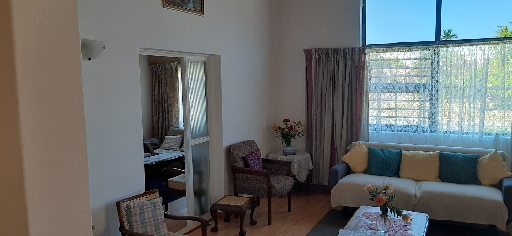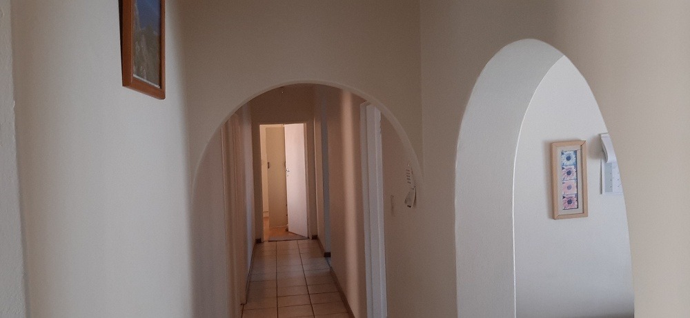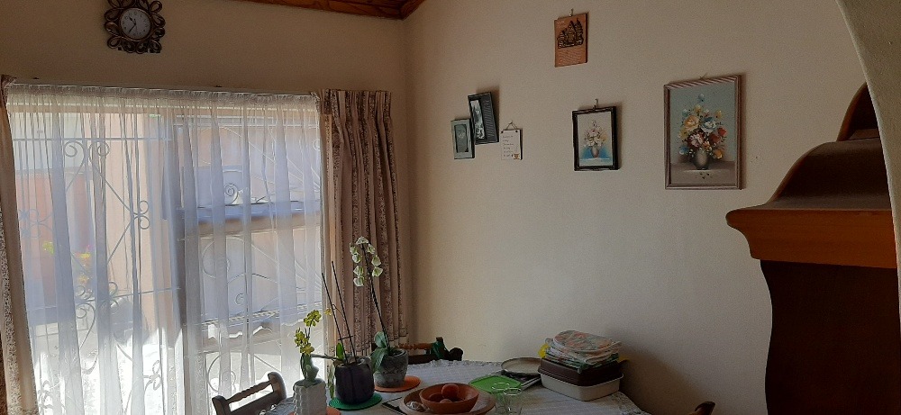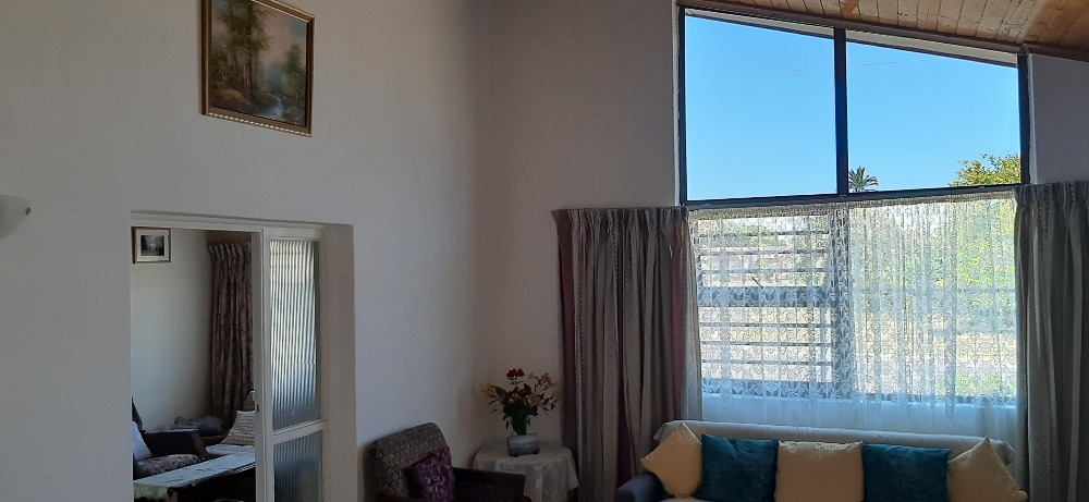 Neat well maintained property ready to move in. Enclosed patio leads into entrance hall and large lounge with high wooden ceiling and fire-place.