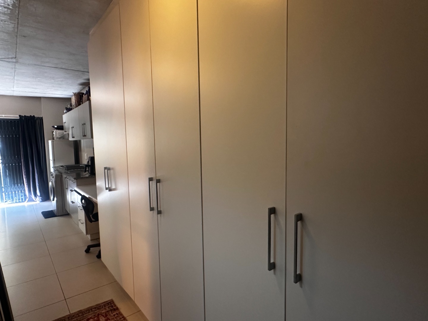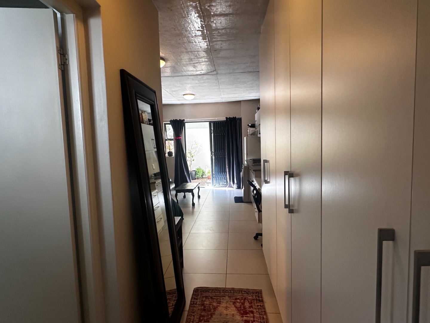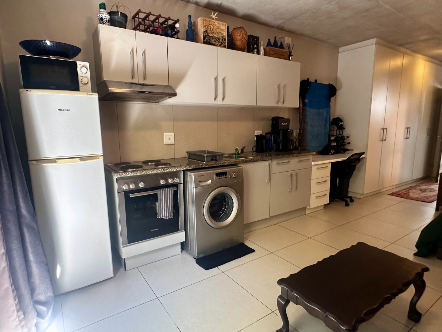 The interior boasts a sleek, open-plan design with modern, high-end finishes throughout. The kitchen is stylishly equipped with an oven, stove, and a plumbing point for convenience, while the bathroom features a chic glass walk-in shower. With ample built-in cupboards throughout the hallway, you’ll have no shortage of storage space. The property also offers one, secure and covered parking bay.