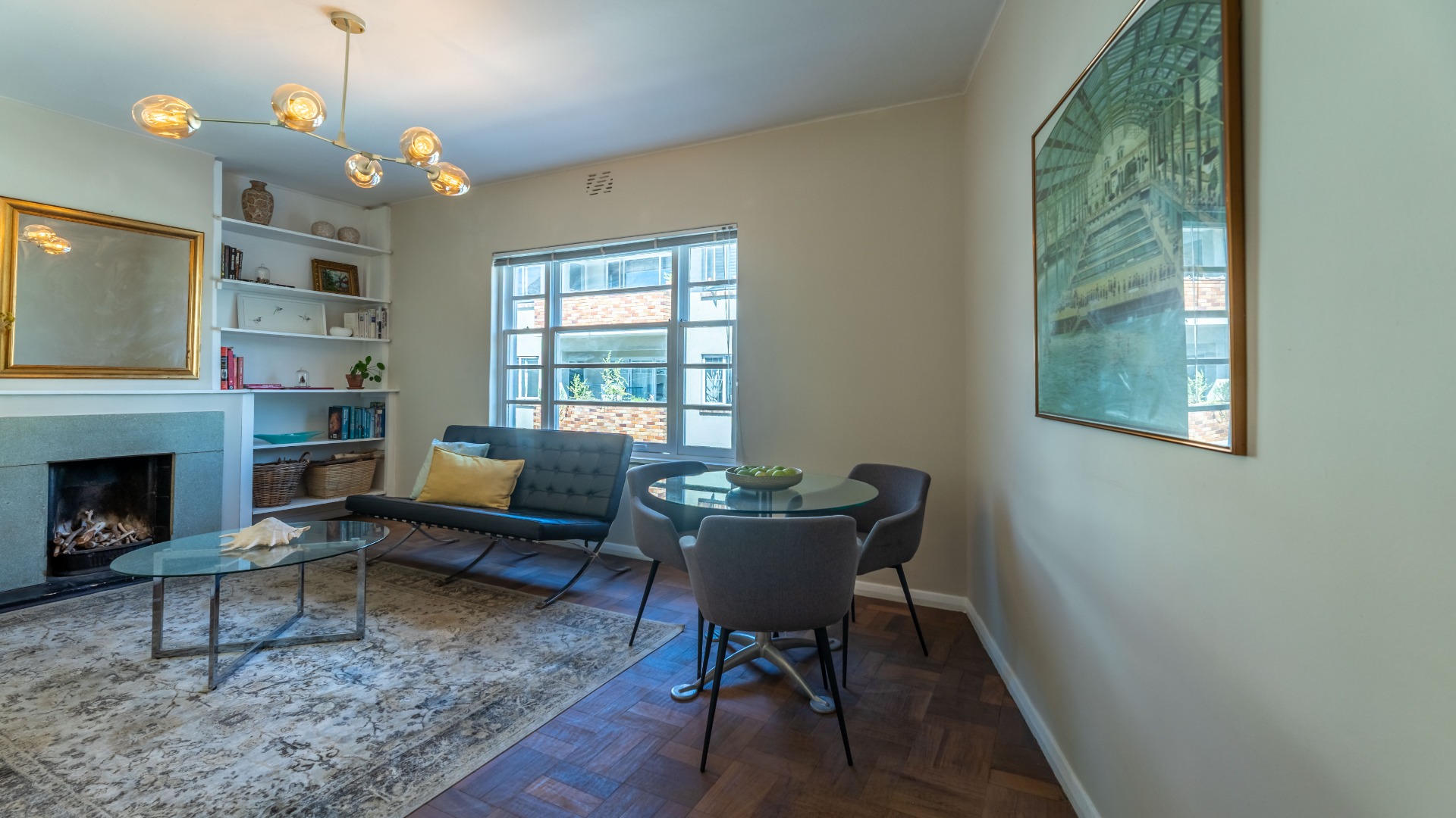 The corner position provides excellent natural light and added privacy. The sunny west-facing lounge centres around a working fireplace. Original parquet floors run throughout, and the apartment is freshly painted.