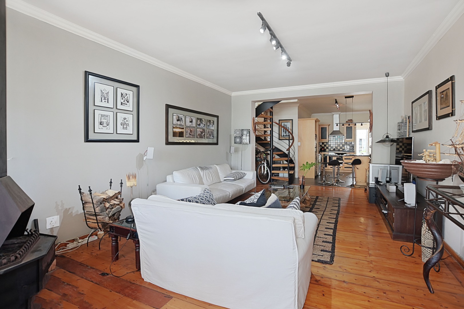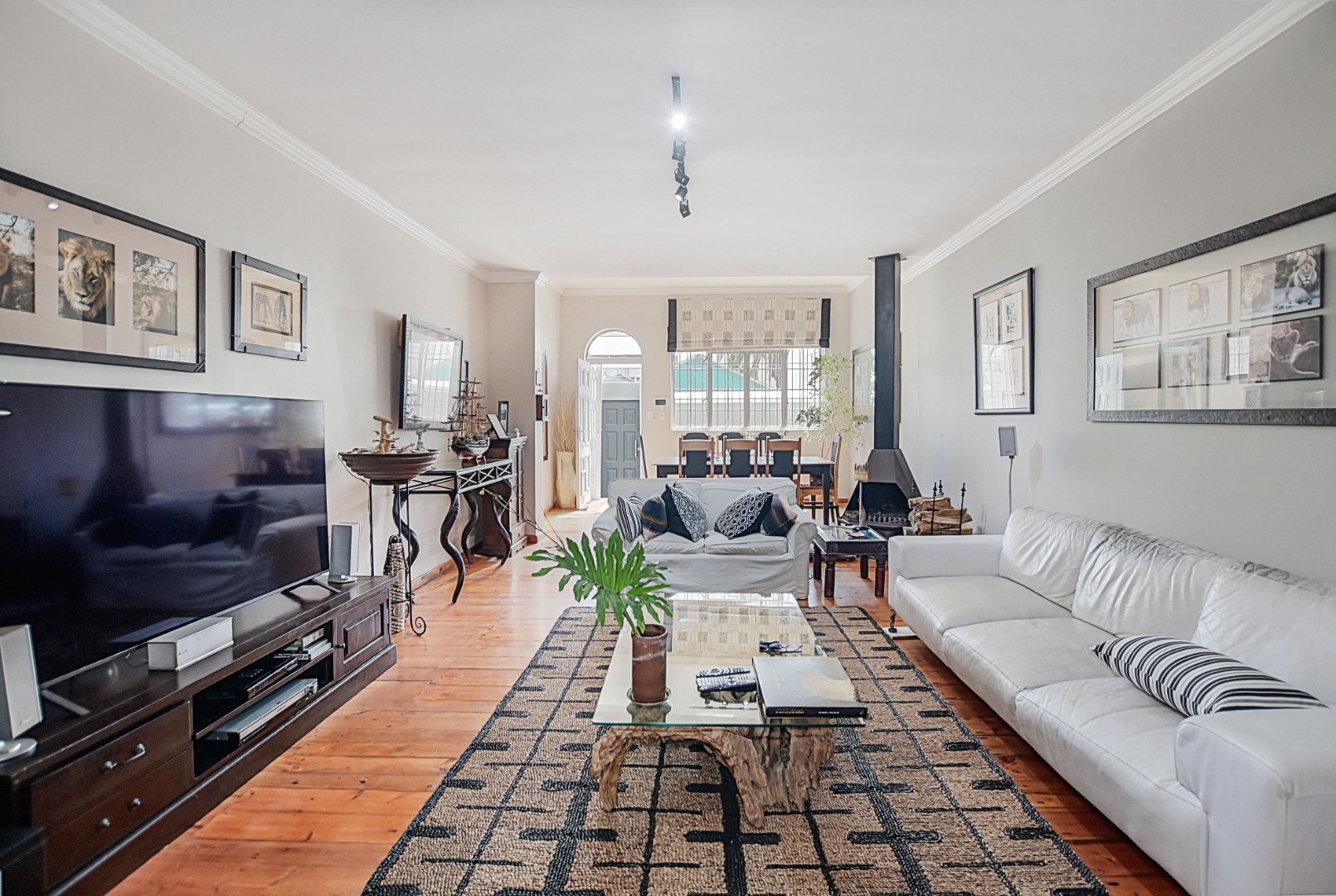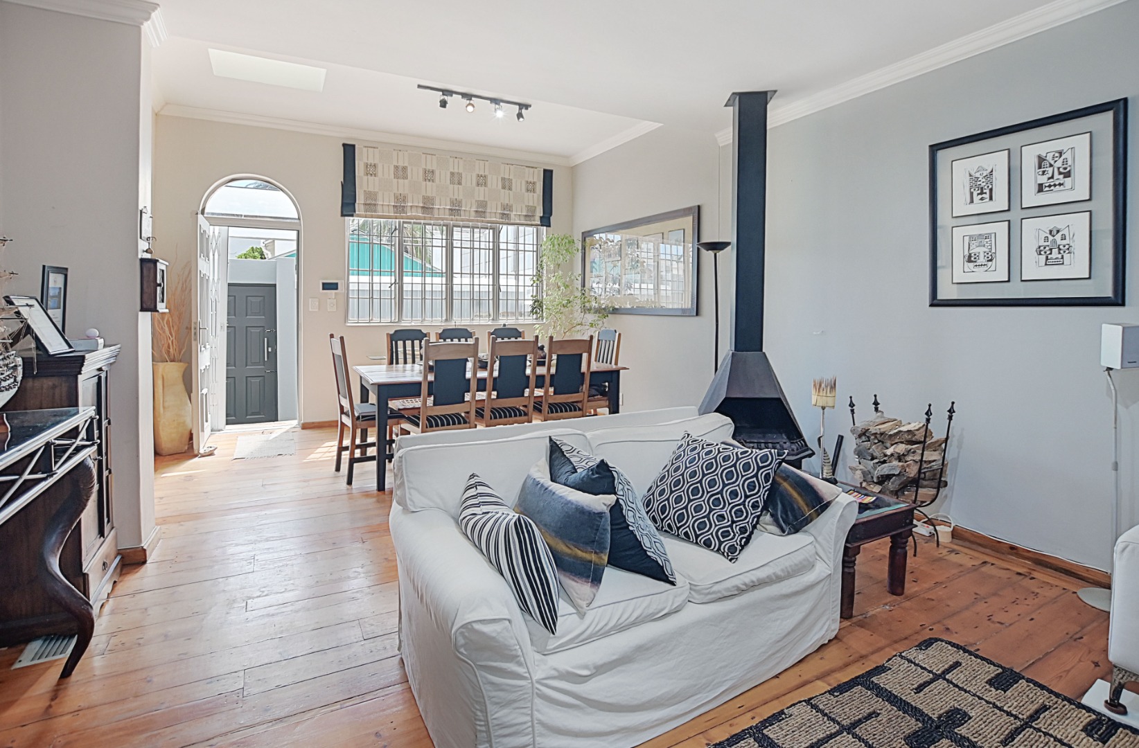 Step into the welcoming lounge featuring the original Oregon Pine flooring, rich in character and beautifully preserved. A feature fireplace adds warmth and atmosphere, making this the perfect spot to unwind on cool Cape Town evenings.