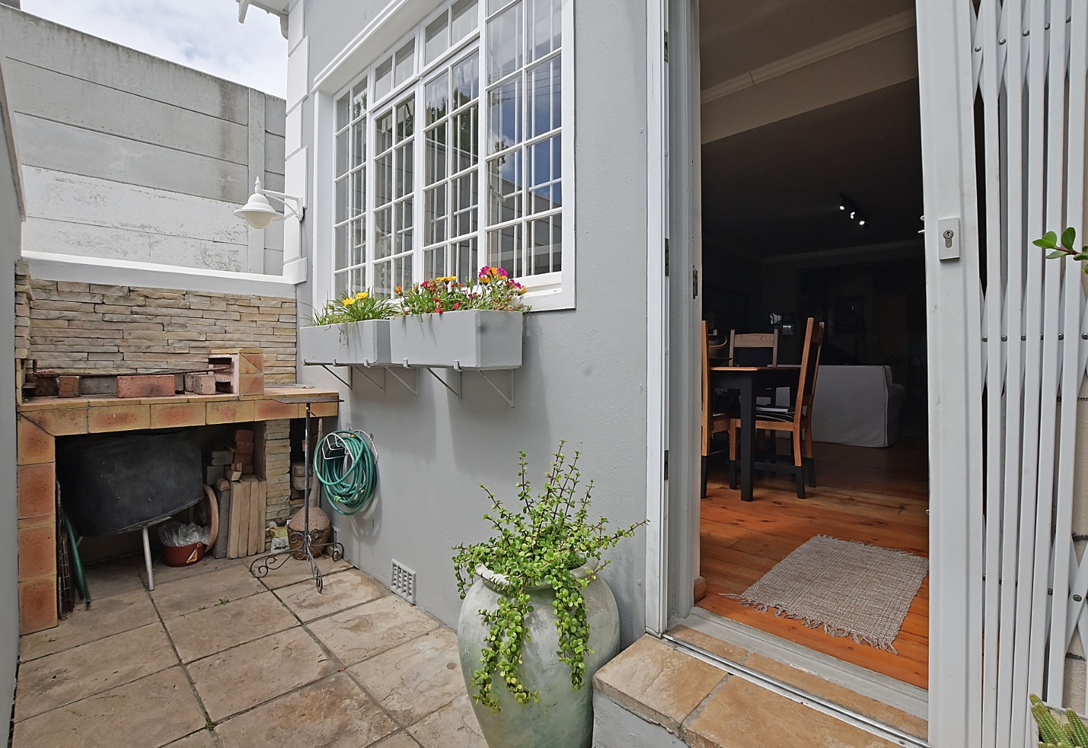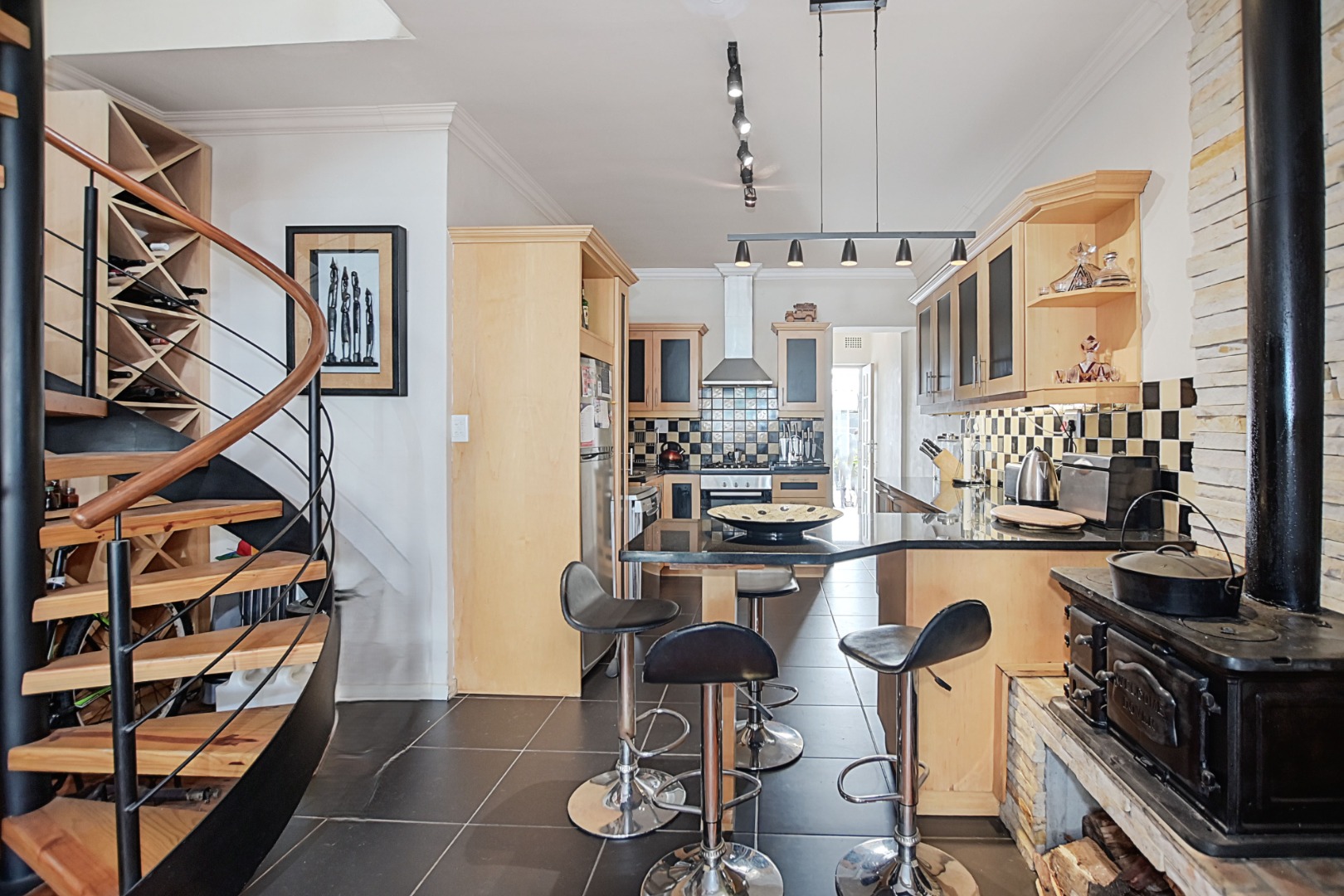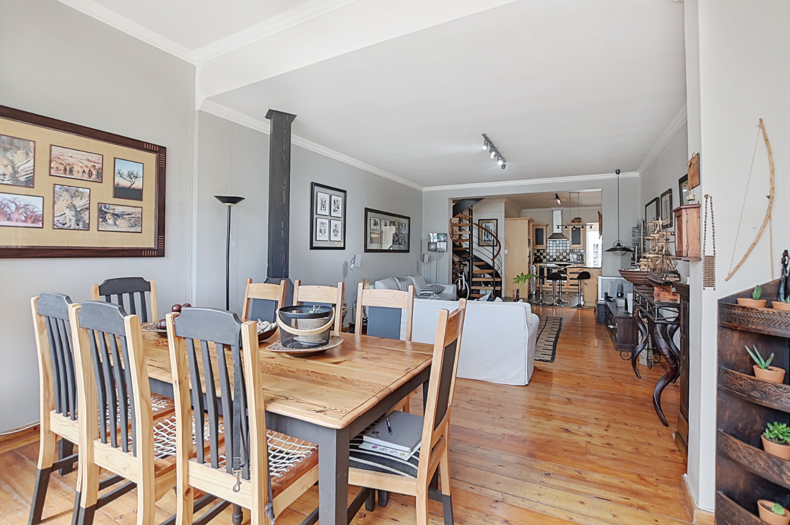 Step into the welcoming lounge featuring the original Oregon Pine flooring, rich in character and beautifully preserved. A feature fireplace adds warmth and atmosphere, making this the perfect spot to unwind on cool Cape Town evenings.