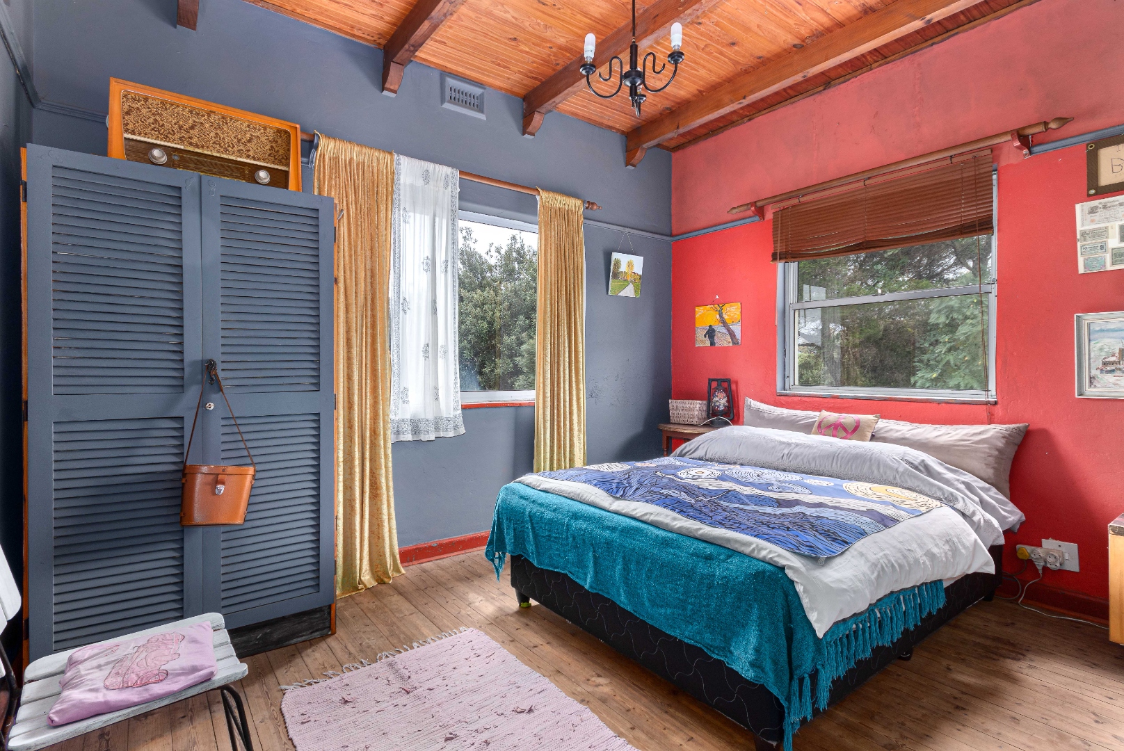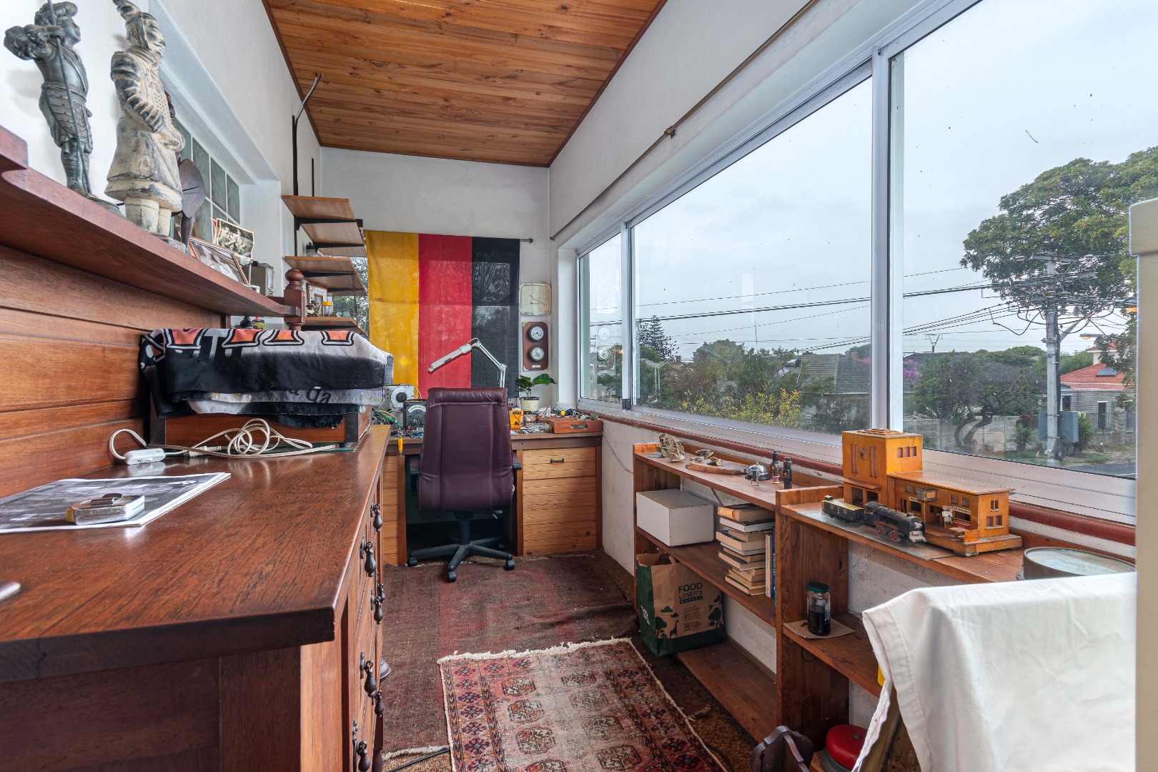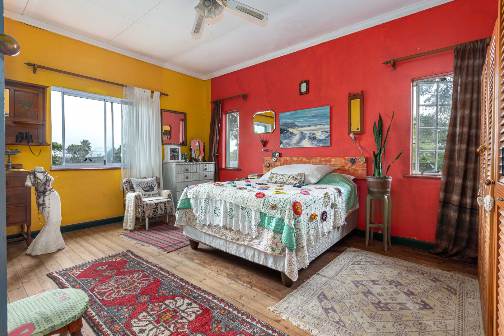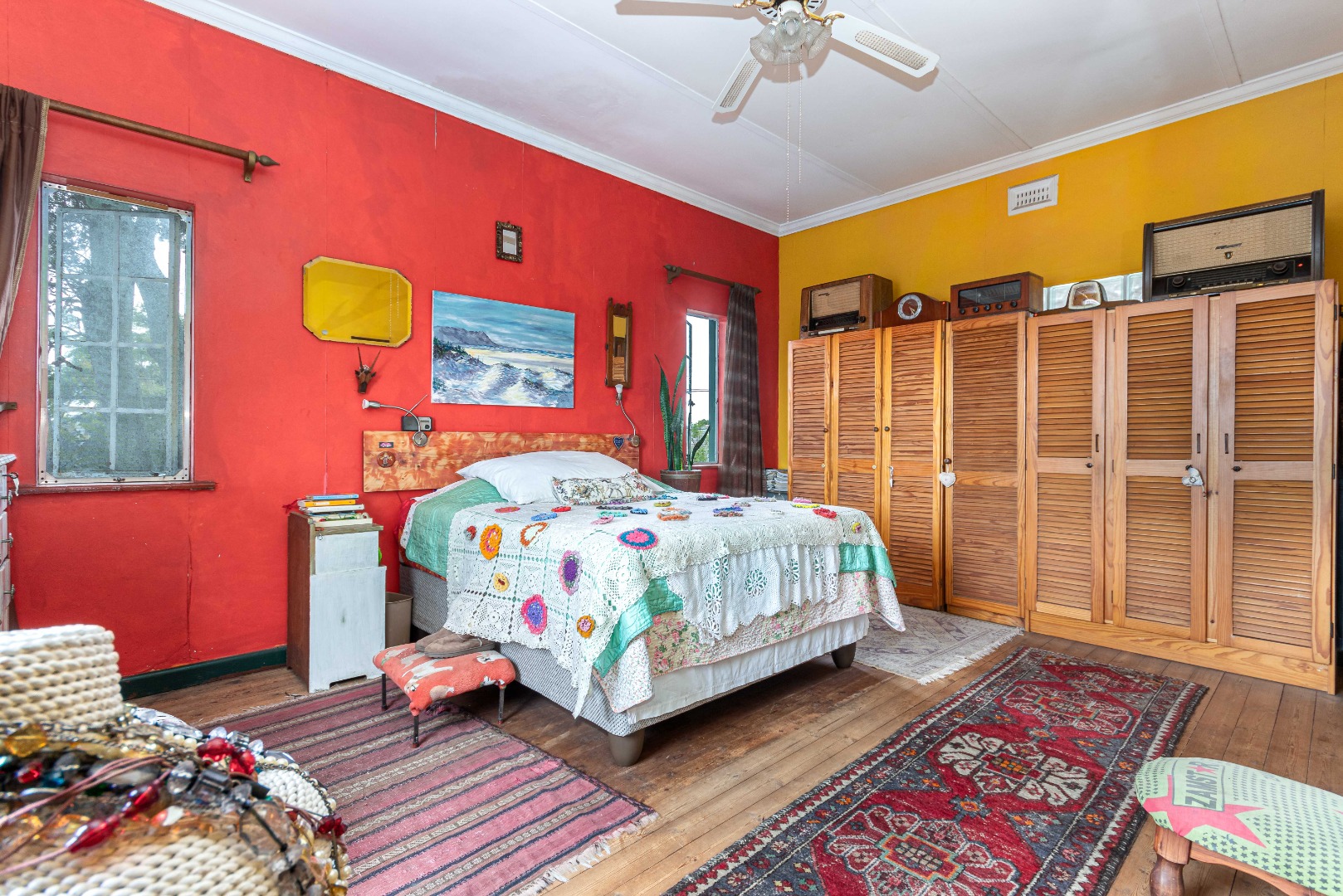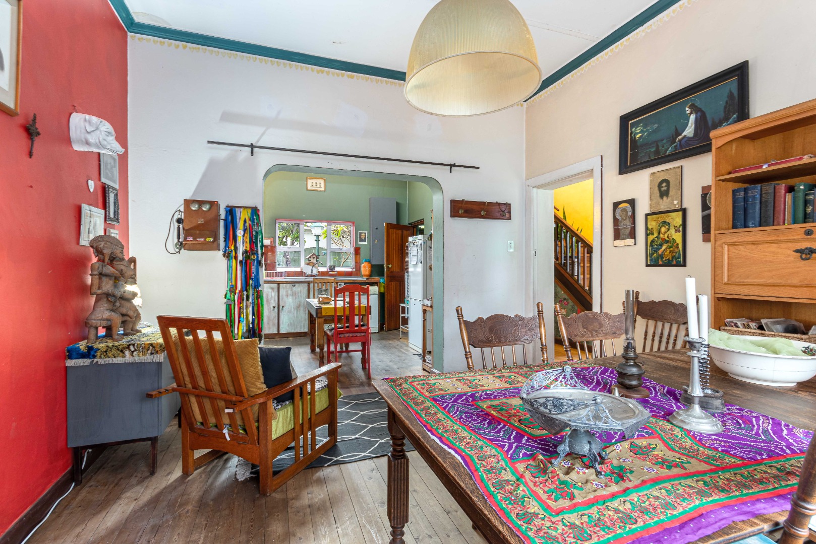 Currently eclectic and art-filled, this house can easily be converted to a contemporary