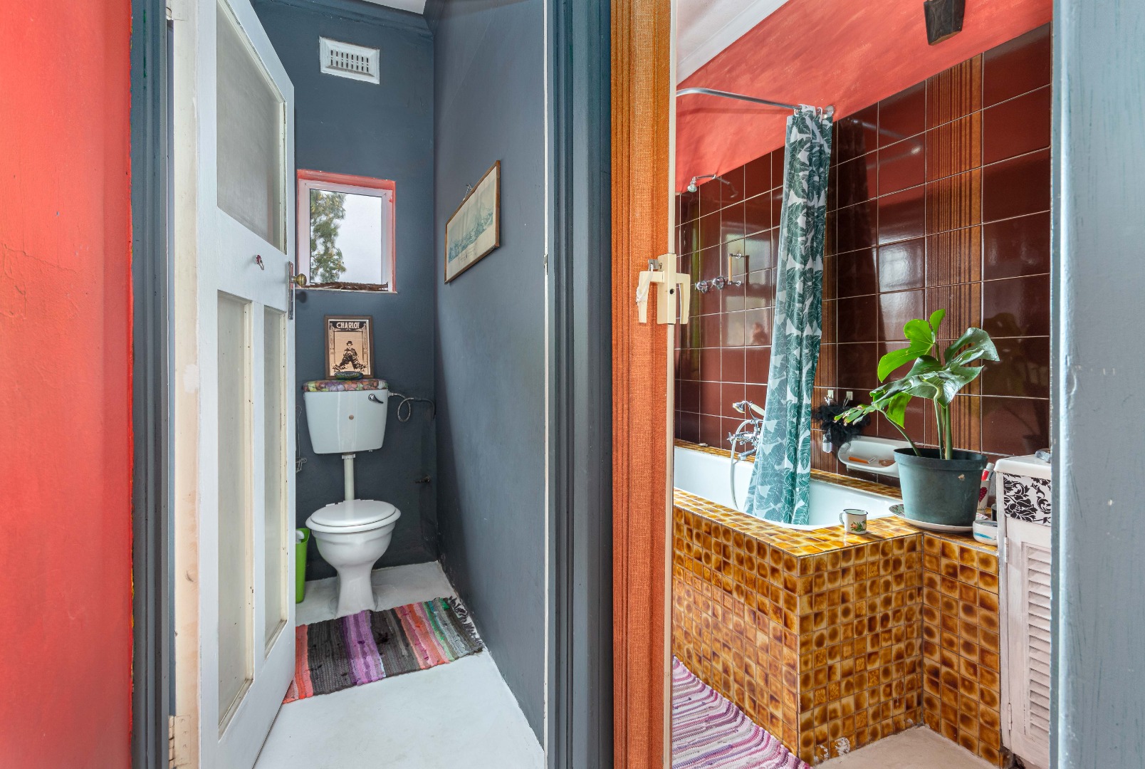 There is a mid-century style family bathroom with a shower over the bath and a basin with a separate toilet.