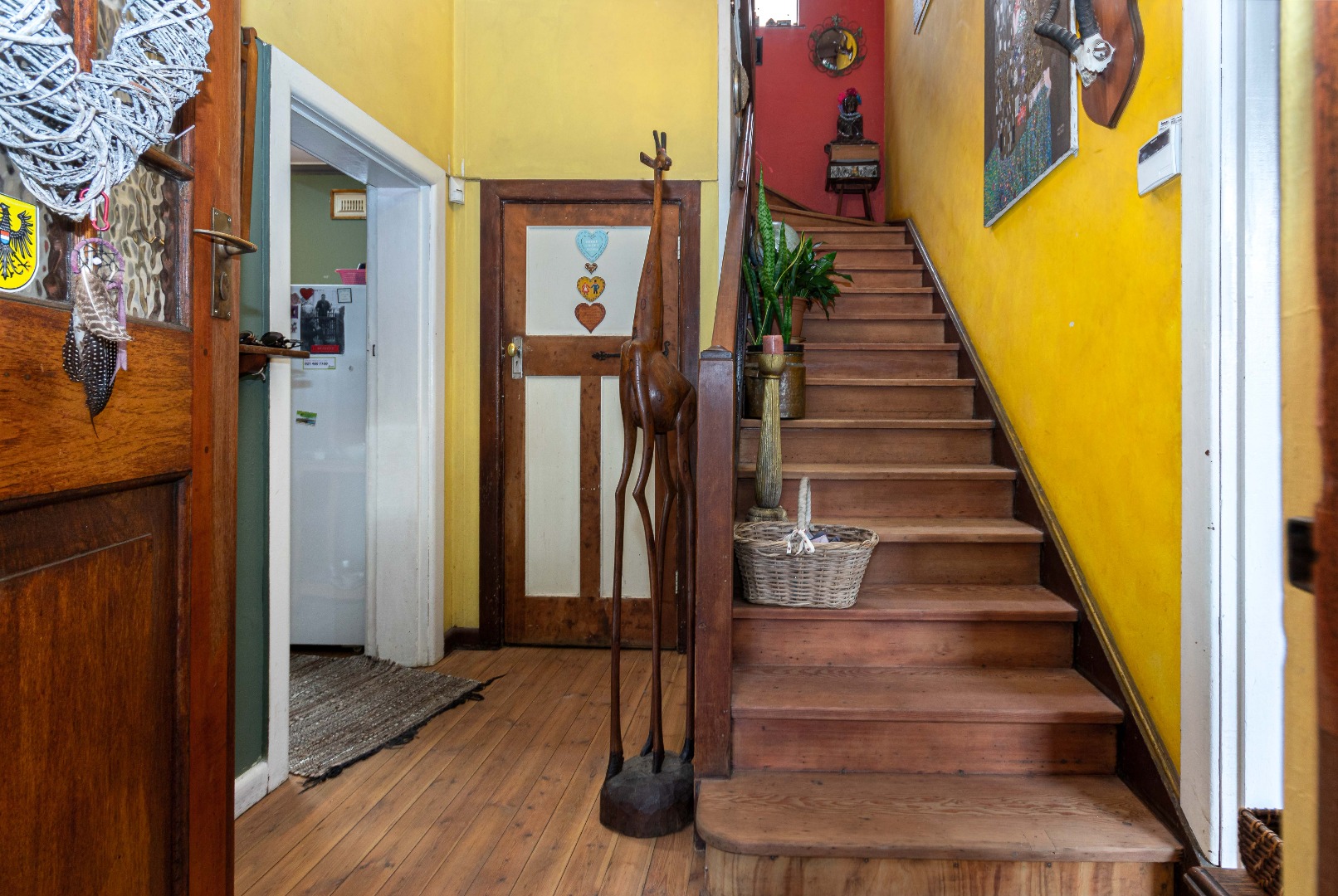 of the high ceilings, original wooden floors, a wide staircase, and wooden doors, which are features throughout.
