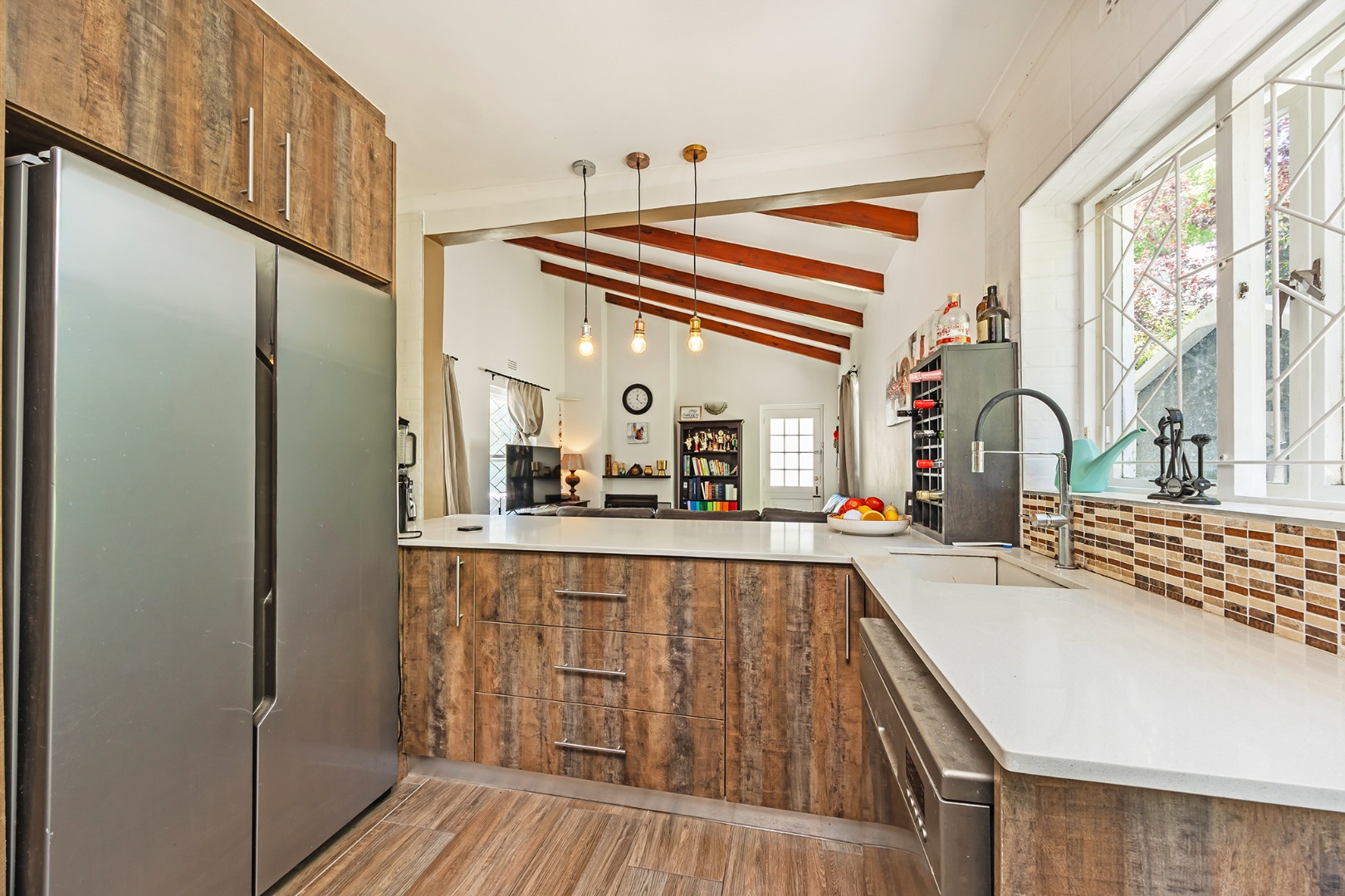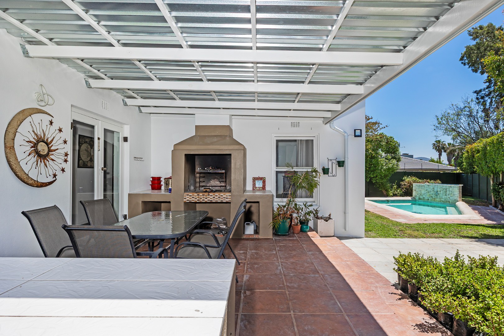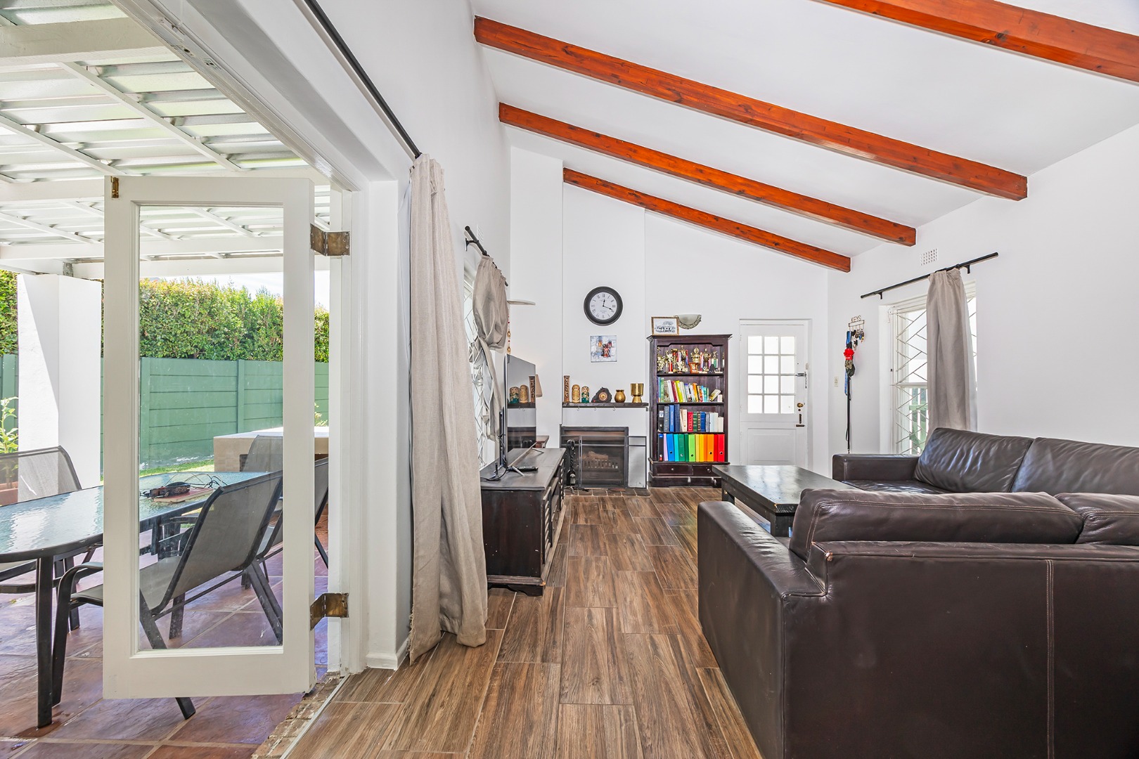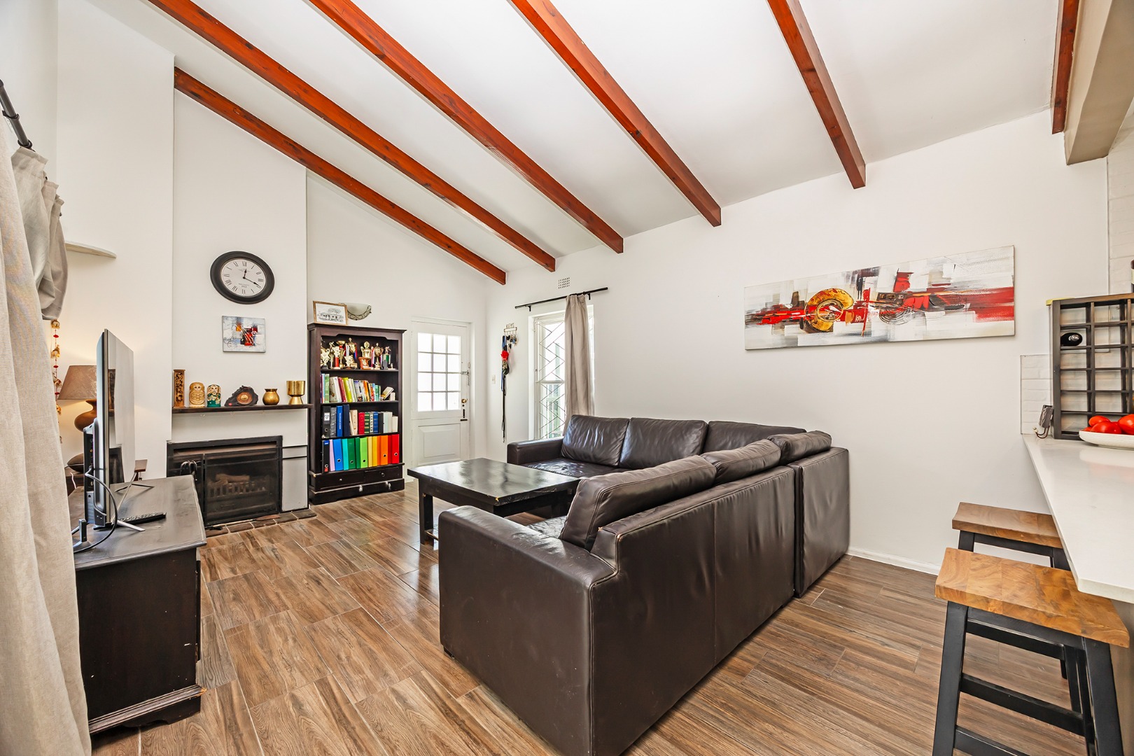 There are three spacious bedrooms, beautifully tiled throughout. The main bedroom has an en-suite bathroom and opens onto a covered patio overlooking the garden. The kitchen features luxurious Caesar Stone countertops, ample cabinetry, a breakfast nook, and fittings for modern appliances—designed for the home chef who values both style and practicality. The open-plan lounge and dining area, with striking exposed wooden beams and a built-in fireplace, add warmth and character. Double doors open onto a covered entertainment patio with a built-in braai, creating seamless indoor-outdoor flow perfect for weekend gatherings or quiet evenings at home. A beautifully maintained garden and a sparkling pool with a water feature complete this inviting retreat.