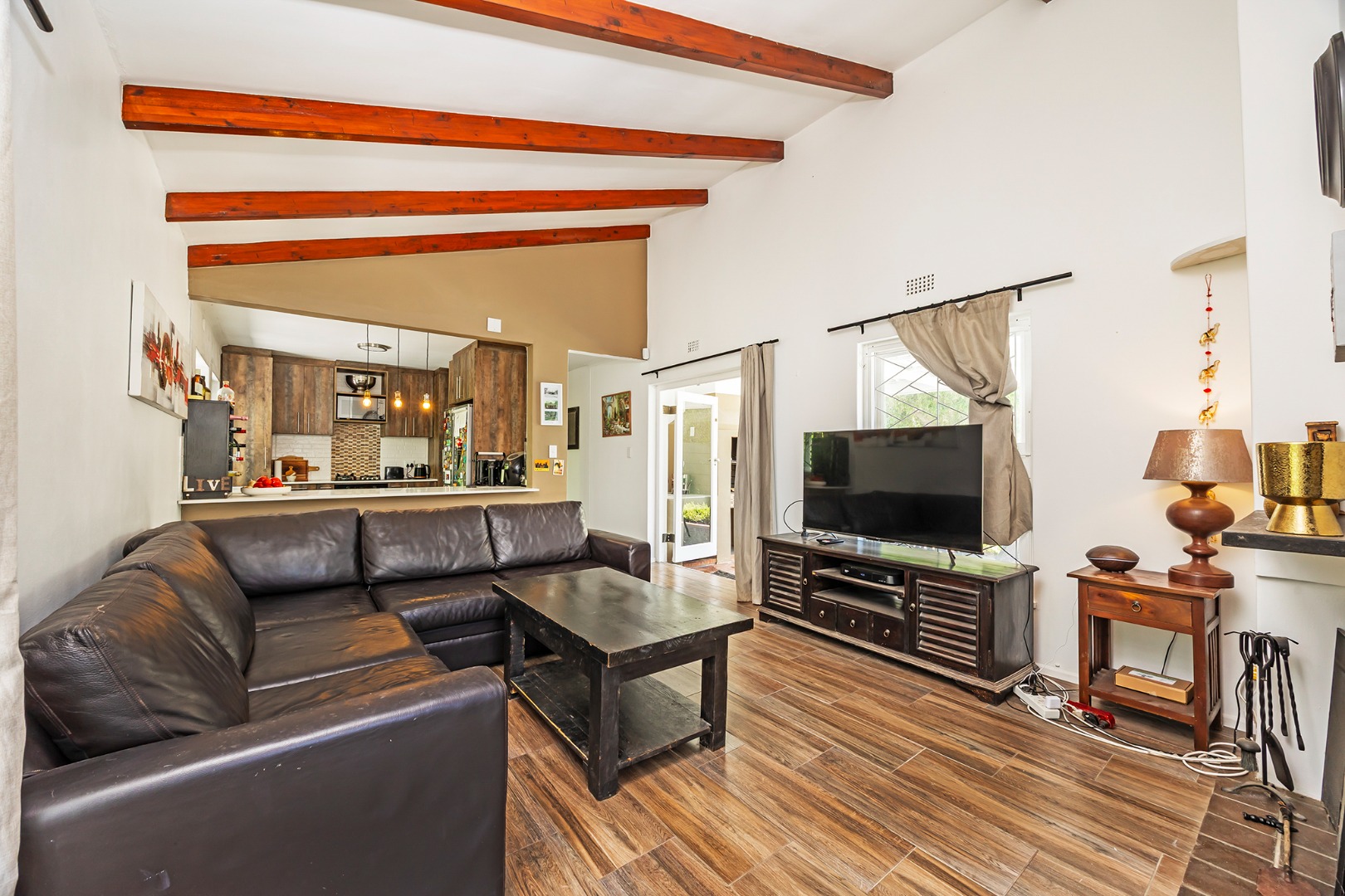 There are three spacious bedrooms, beautifully tiled throughout. The main bedroom has an en-suite bathroom and opens onto a covered patio overlooking the garden. The kitchen features luxurious Caesar Stone countertops, ample cabinetry, a breakfast nook, and fittings for modern appliances—designed for the home chef who values both style and practicality. The open-plan lounge and dining area, with striking exposed wooden beams and a built-in fireplace, add warmth and character. Double doors open onto a covered entertainment patio with a built-in braai, creating seamless indoor-outdoor flow perfect for weekend gatherings or quiet evenings at home. A beautifully maintained garden and a sparkling pool with a water feature complete this inviting retreat.