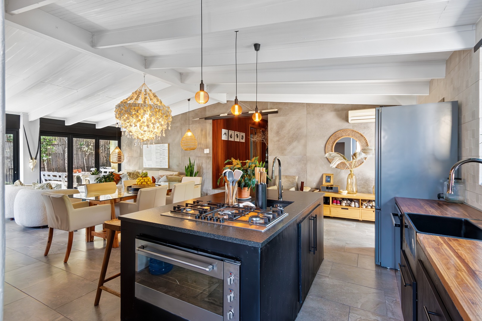 Natural granite sets an exclusive tone in the kitchen, with a Bosch black fridge (worth R21 000.00 – negotiable if included in sale) pairs with subtly integrated matching black appliances in the open-plan kitchen, dining, and lounge area.