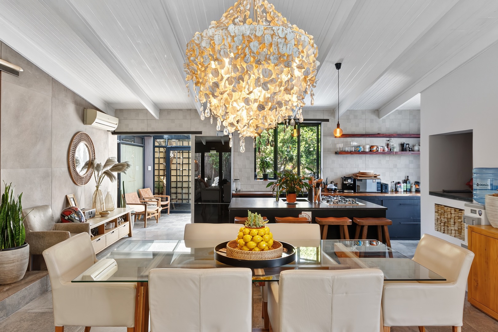 The dappled light dining room chandelier is a Frans Alexander design made from jacaranda pods and crystals worth R35 000.00. All overhead lights are dimmable.