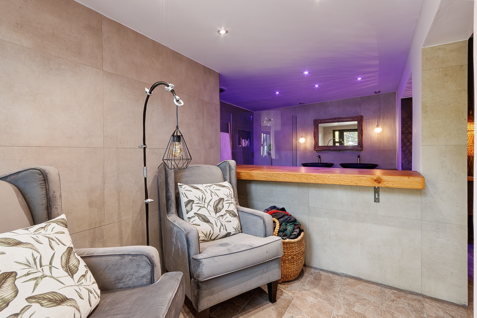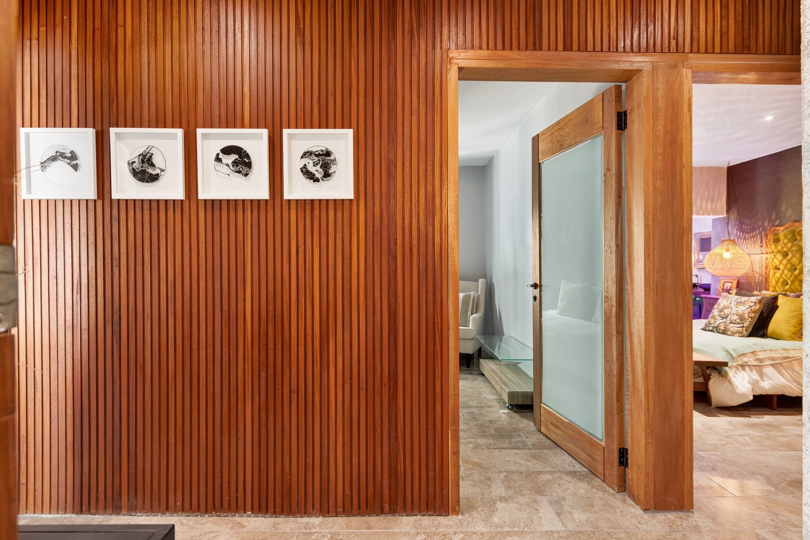 The finition is mahogany, meranti and zebrano with the front door being a pivot 350 Kg zebrano wood that has a striking, bold appearance resembling a zebra's stripes. All windows, French doors and stacking doors are charcoal aluminum providing a contemporary feel.