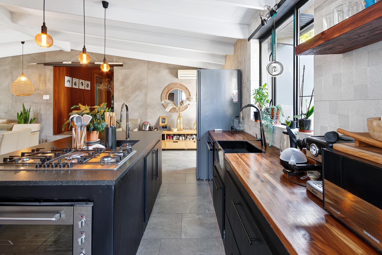Natural granite sets an exclusive tone in the kitchen, with a Bosch black fridge (worth R21 000.00) pairs with subtly integrated matching black appliances in the open-plan kitchen, dining, and lounge area.