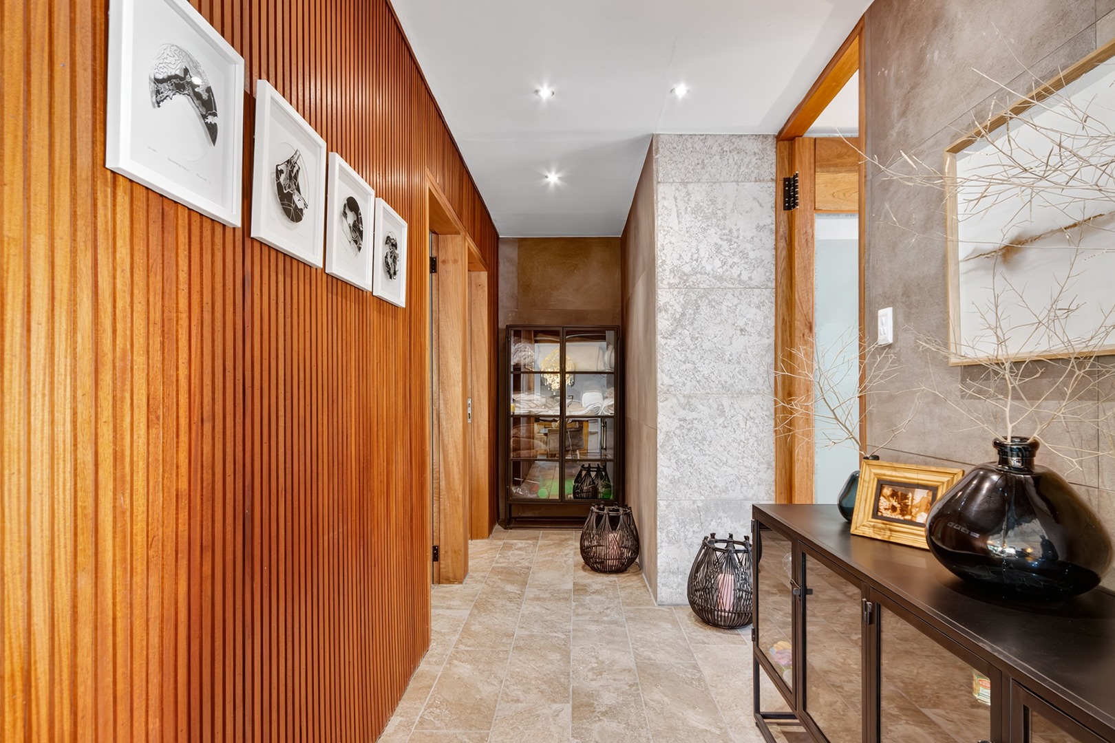 The finition is mahogany, meranti and zebrano (Brazilian wood) with the front door being a pivot 300 Kg zebrano wood that has a striking, bold appearance resembling a zebra's stripes. All windows, French doors and stacking doors are charcoal aluminum providing a contemporary feel.