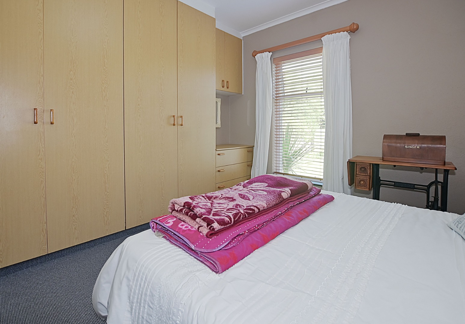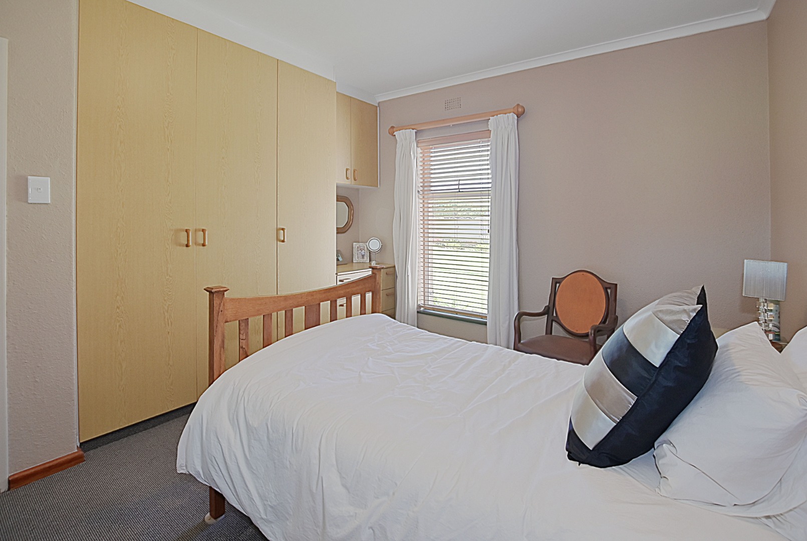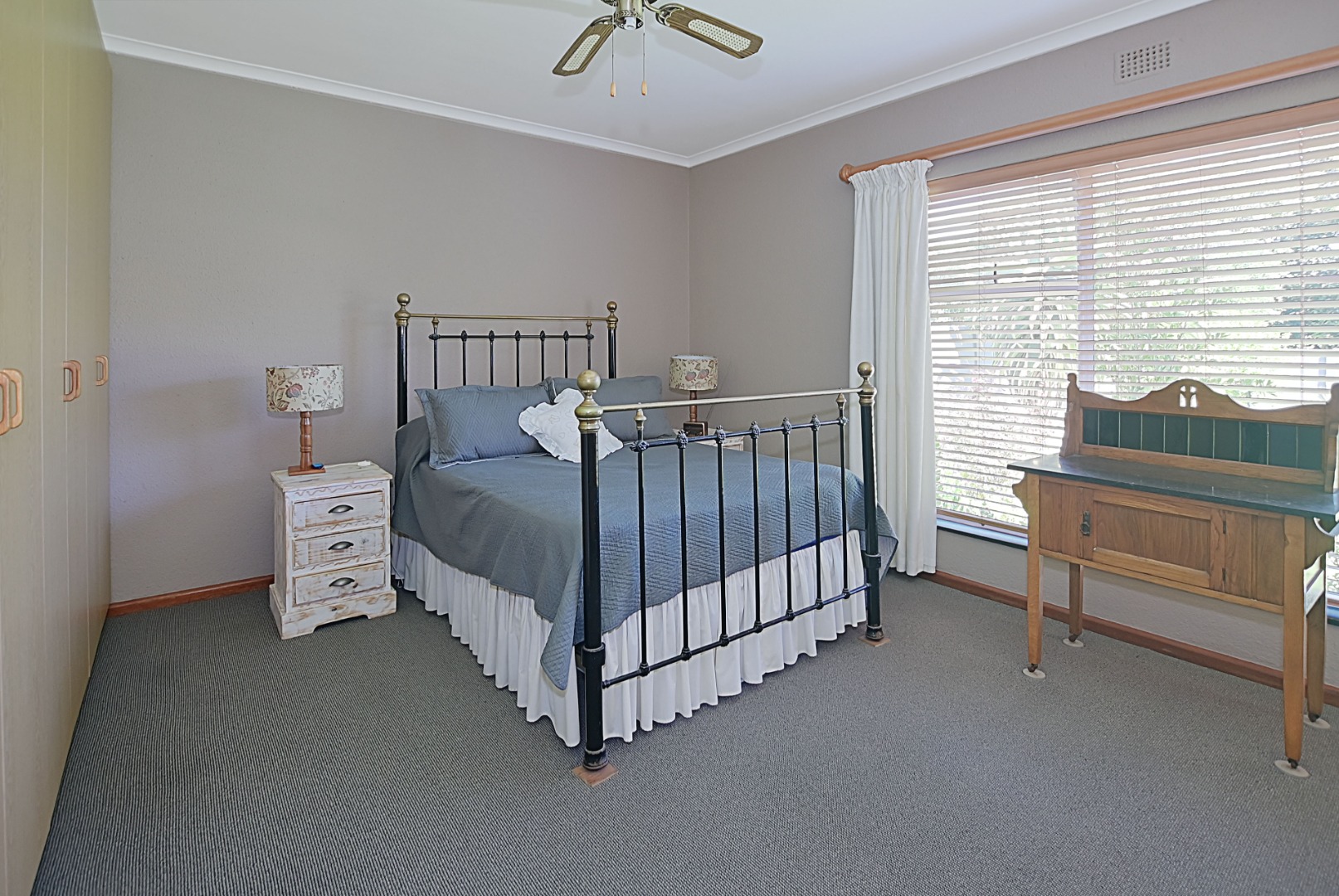 - Bedroom 1 Carpets, Blinds, Curtain Rails, Fan, Internet Port, Built-in Cupboards, King Bed