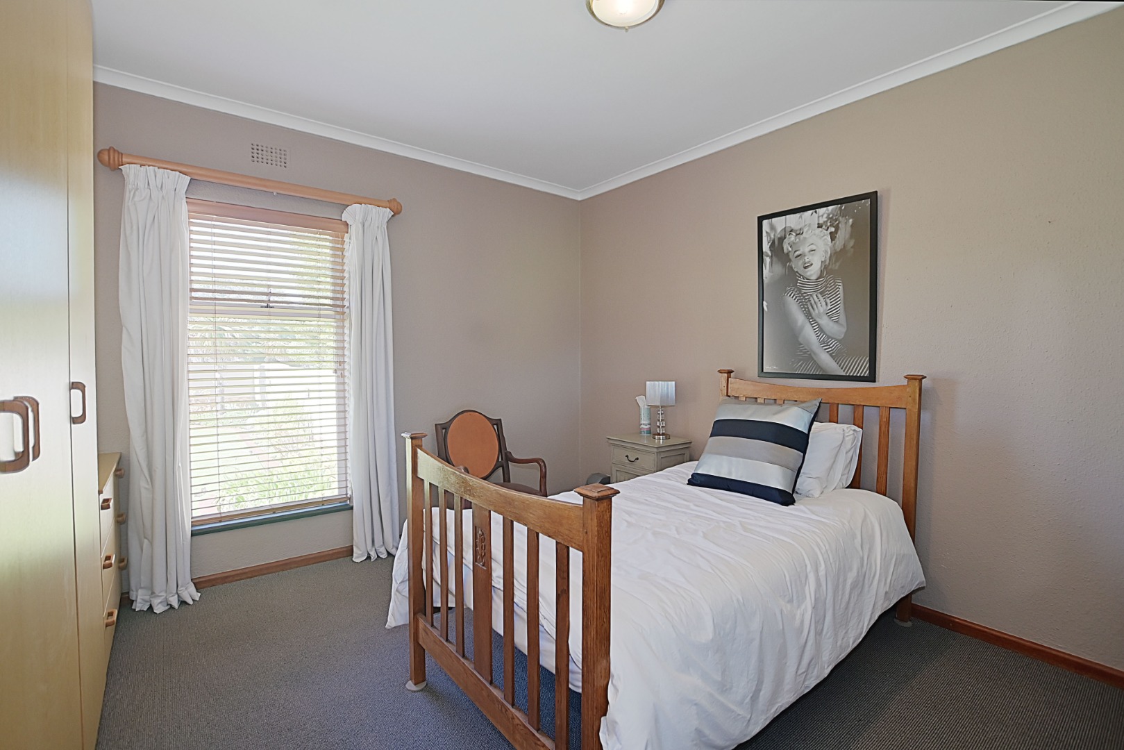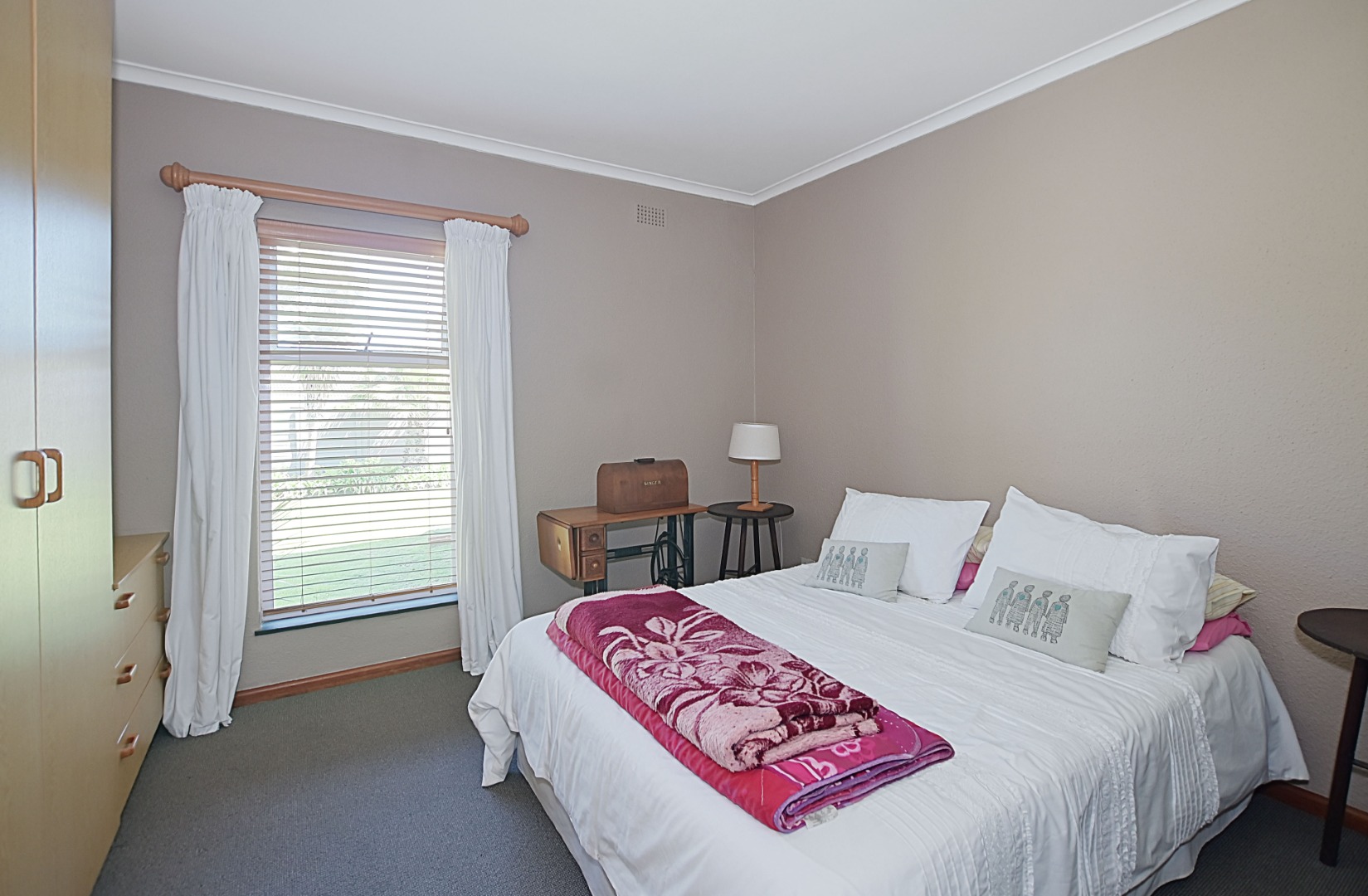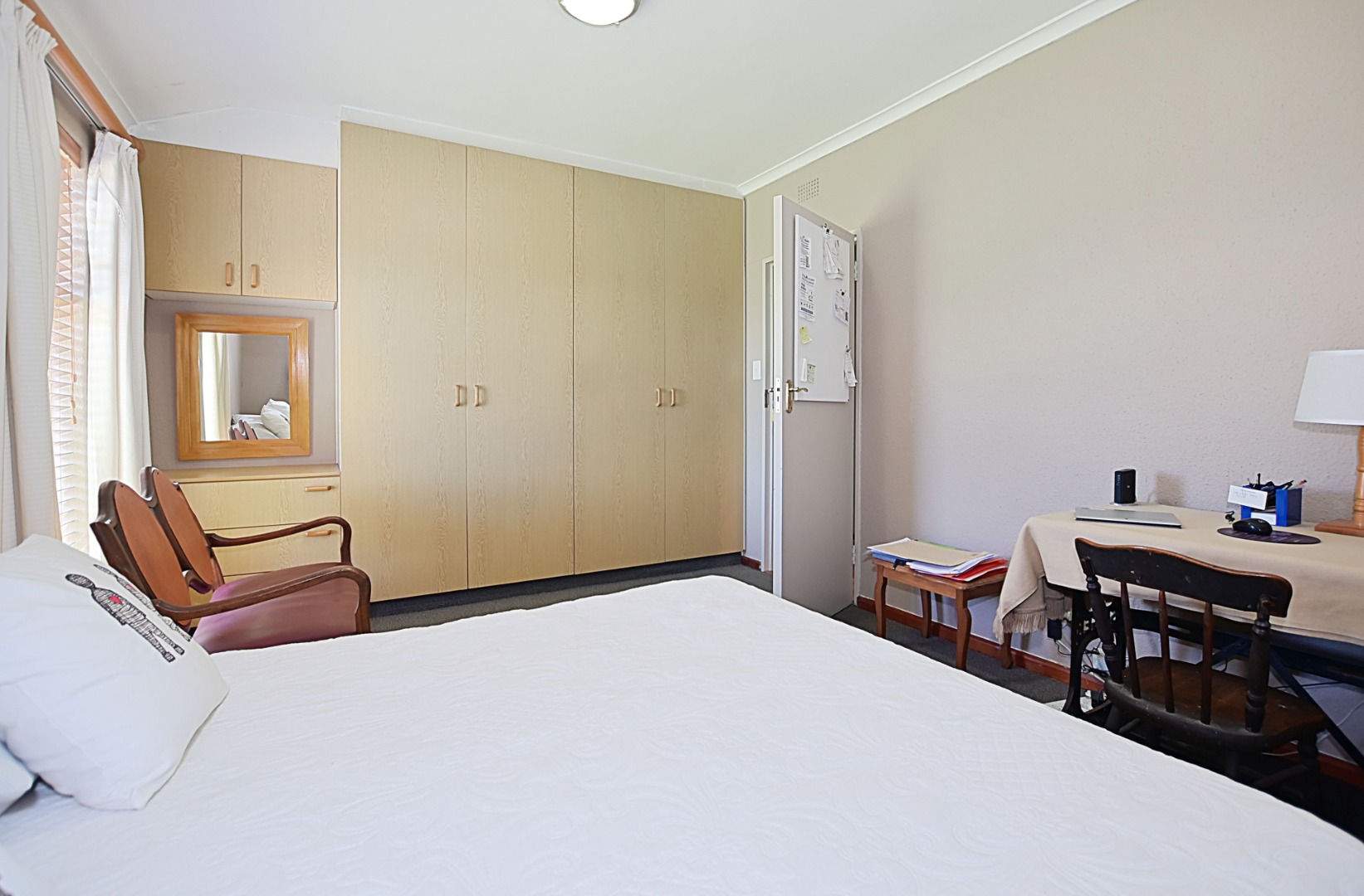 - Bedroom 1 Carpets, Blinds, Curtain Rails, Fan, Internet Port, Built-in Cupboards, King Bed