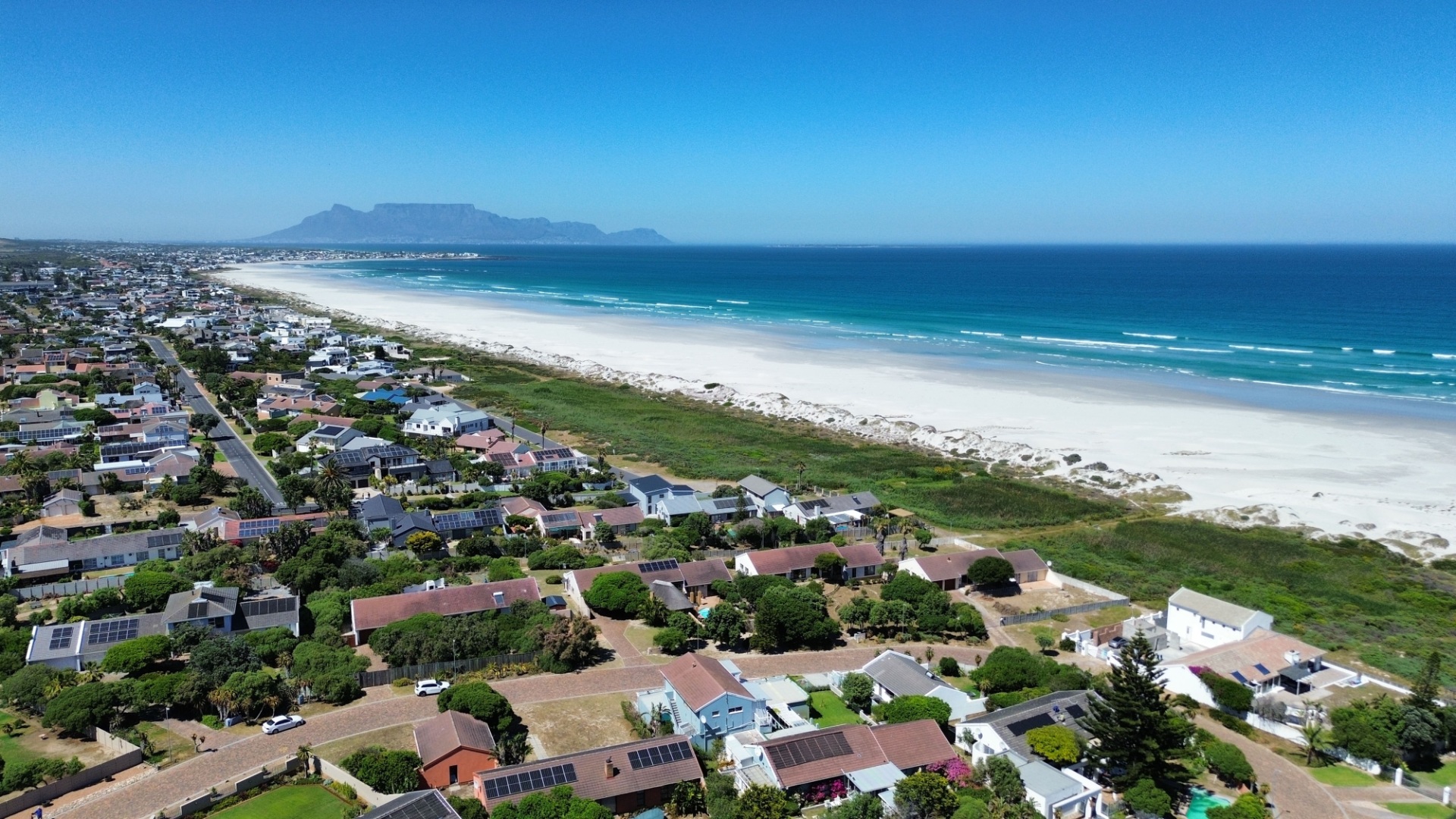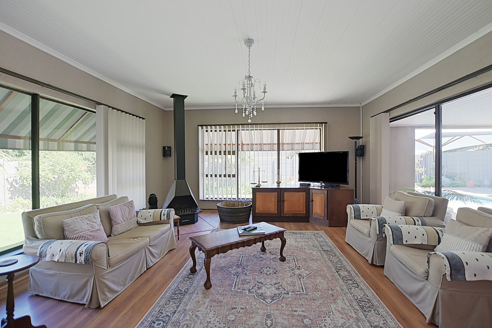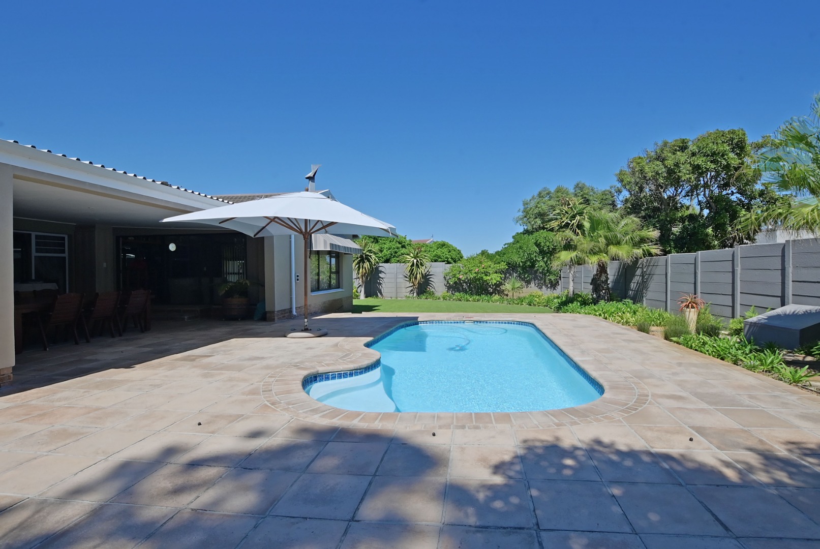The home has a separate dining room and lounge, plus a TV room with a built-in bar — perfect for family time or having friends over. The kitchen is neat and practical, and the covered patio with a built-in braai looks out over a swimming pool with a cover — great for summer days.