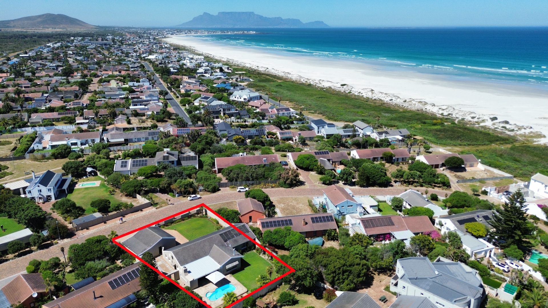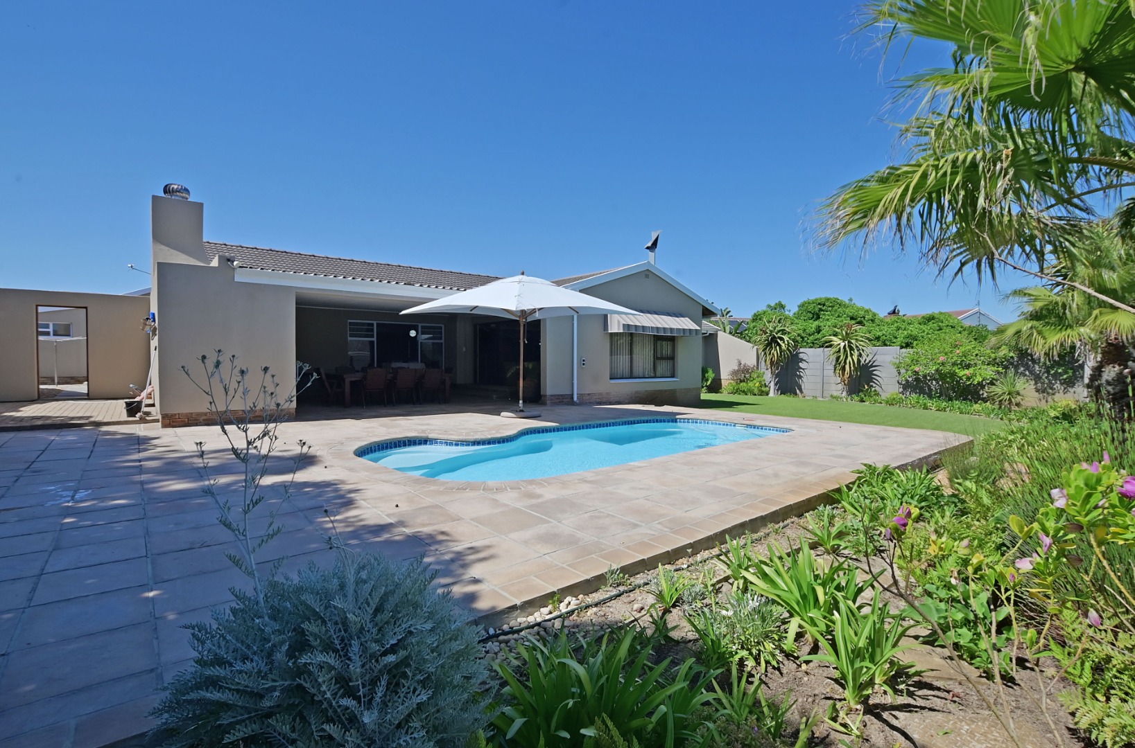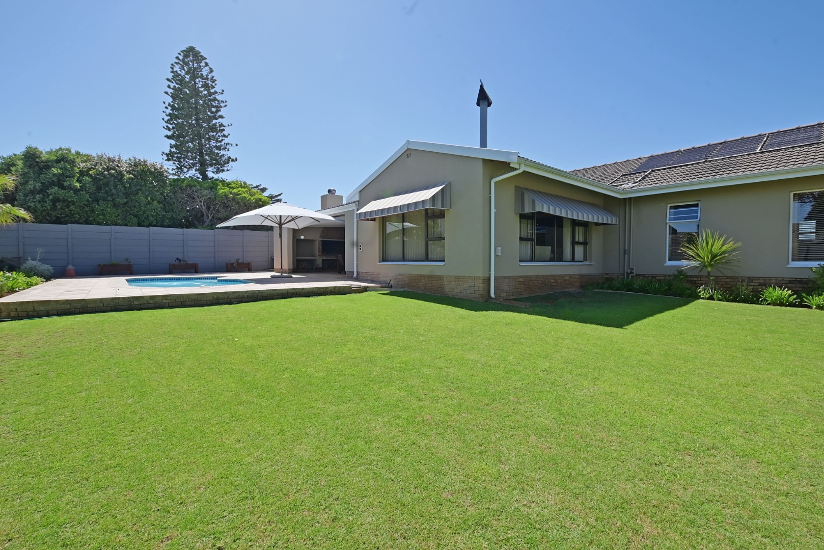 The home has a separate dining room and lounge, plus a TV room with a built-in bar — perfect for family time or having friends over. The kitchen is neat and practical, and the covered patio with a built-in braai looks out over a swimming pool with a cover — great for summer days.