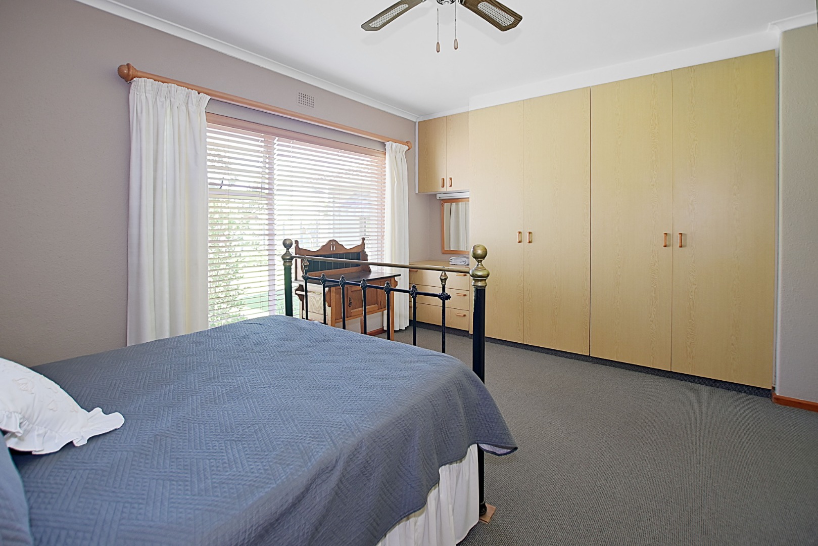 - Bedroom 1 Carpets, Blinds, Curtain Rails, Fan, Internet Port, Built-in Cupboards, King Bed