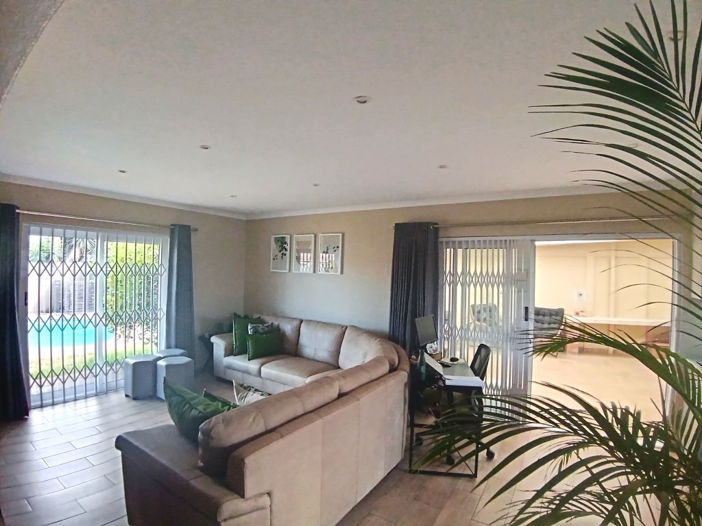 The spacious living area opens via sliding doors onto the garden and swimming pool, creating a seamless indoor-outdoor flow.