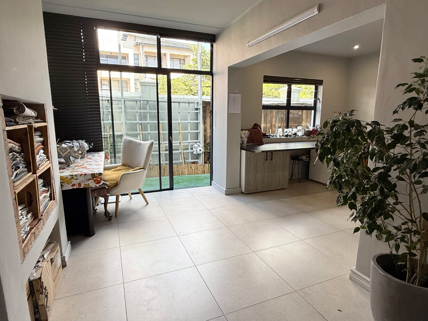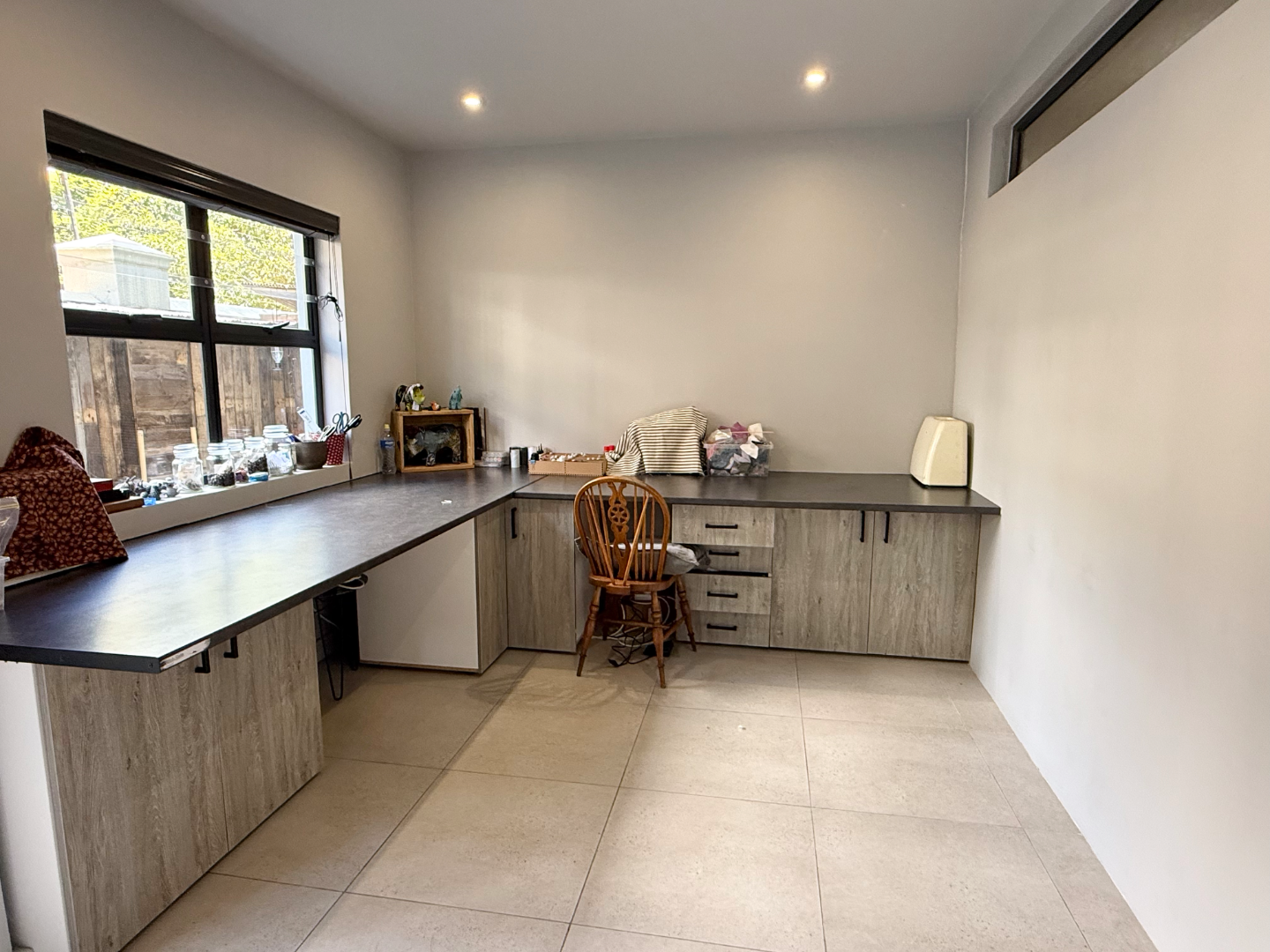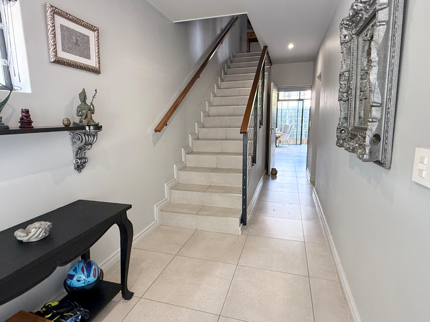 The first floor boasts a beautifully designed kitchen and dining area flowing effortlessly into a large lounge. From here, step out onto the covered patio with a built-in braai, where morning sun fills the space and views overlook the lush garden below. This level also offers a large north-facing bedroom with built-in cupboards and additional counter space, as well as a second sunny bedroom with generous cupboard space. Both are serviced by a tastefully finished bathroom.