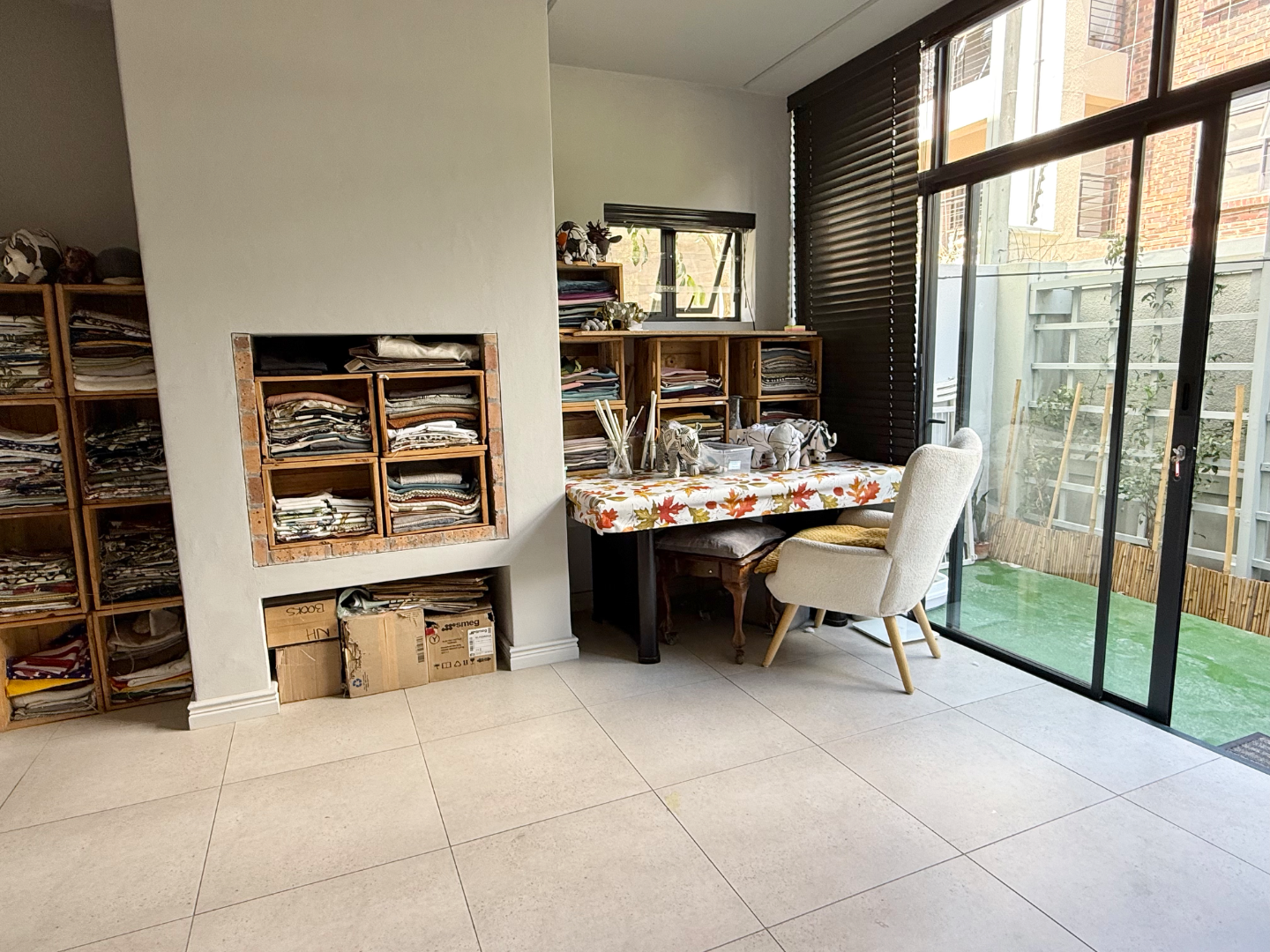 Adjoining this level is an inviting entertainment room with a built-in fireplace, fitted storage cupboards, and sliding doors that open onto a tranquil outdoor area, perfect for relaxed evenings or entertaining.