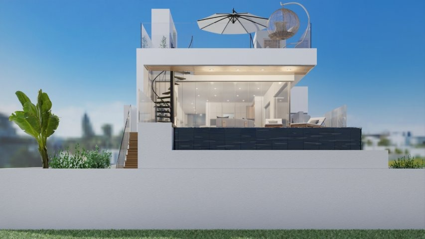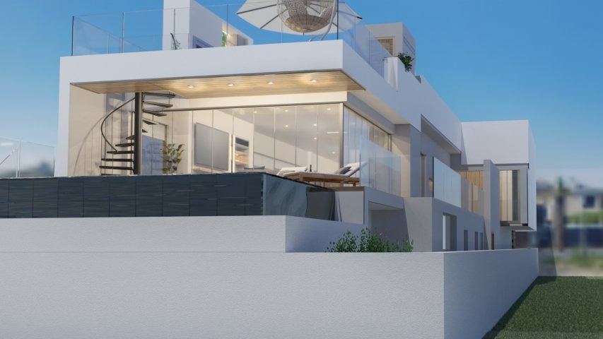 A spiral staircase leads to the roof deck entertainment area, which is fitted with a built-in braai, seating space, and glass balustrades for clear ocean scenery.