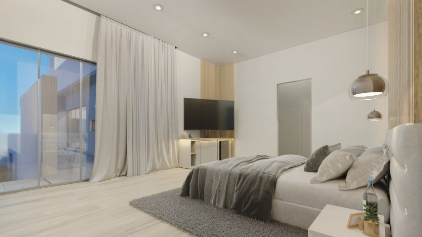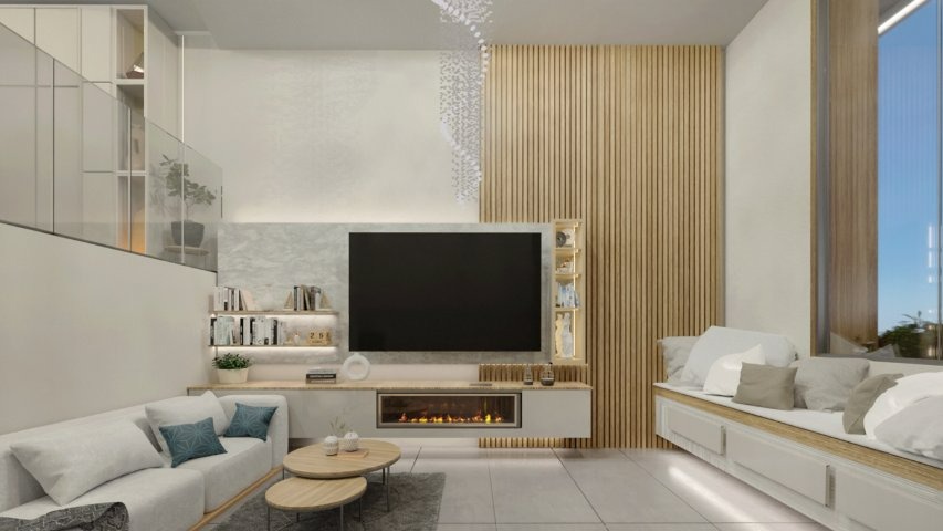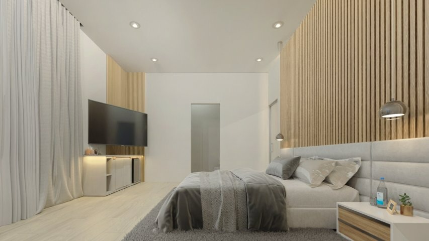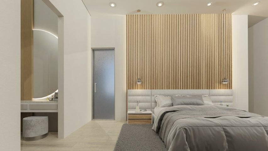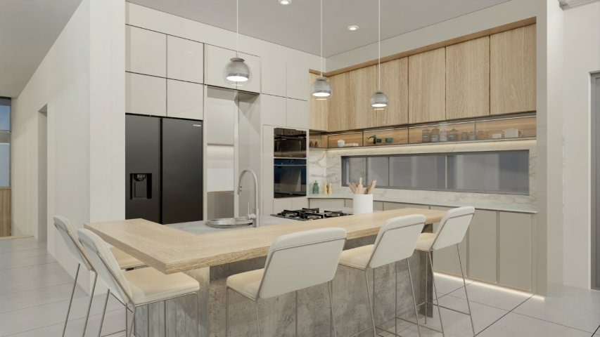 Upstairs, the main bedroom offers a beautiful walk-in closet and a full bathroom. The kitchen will be fitted with modern finishes, a stone-top island, and a separate scullery.