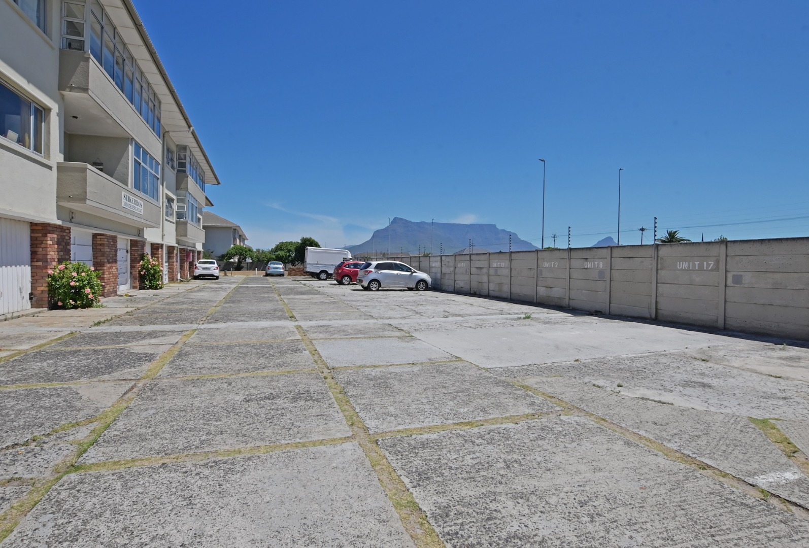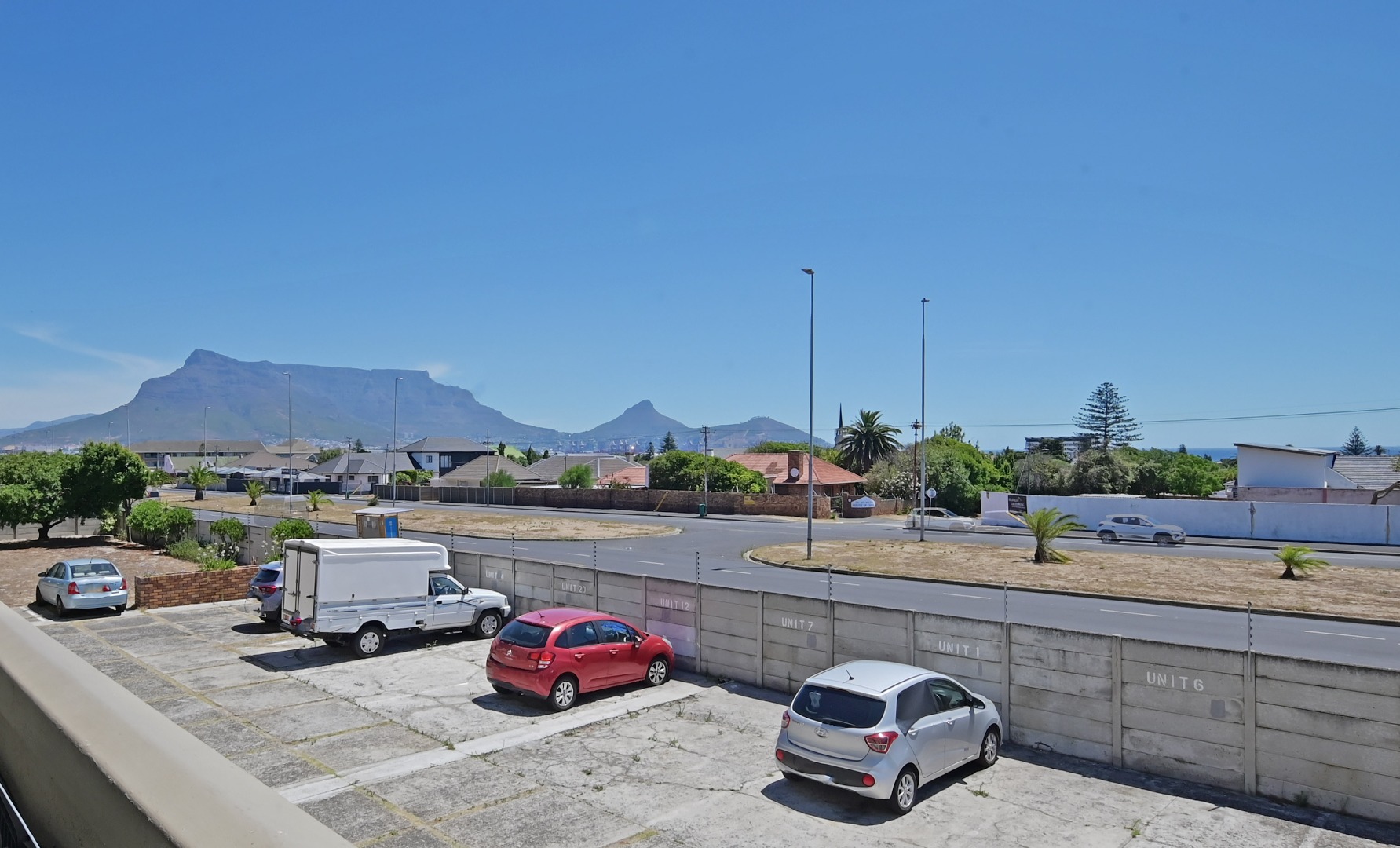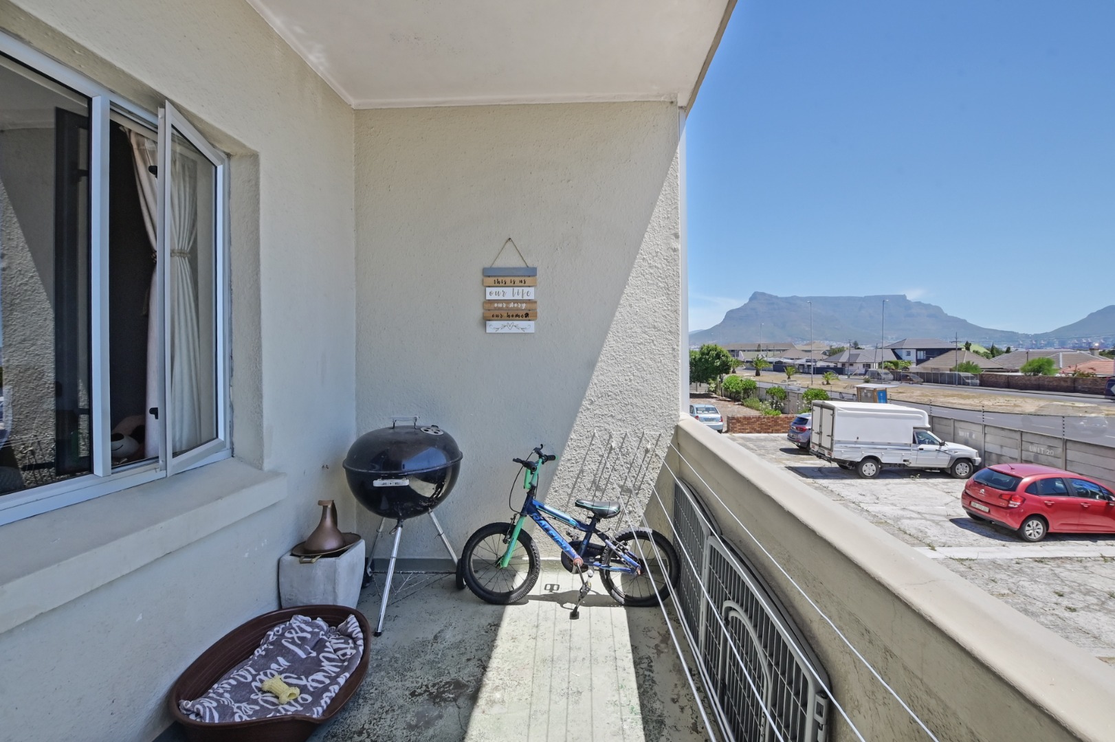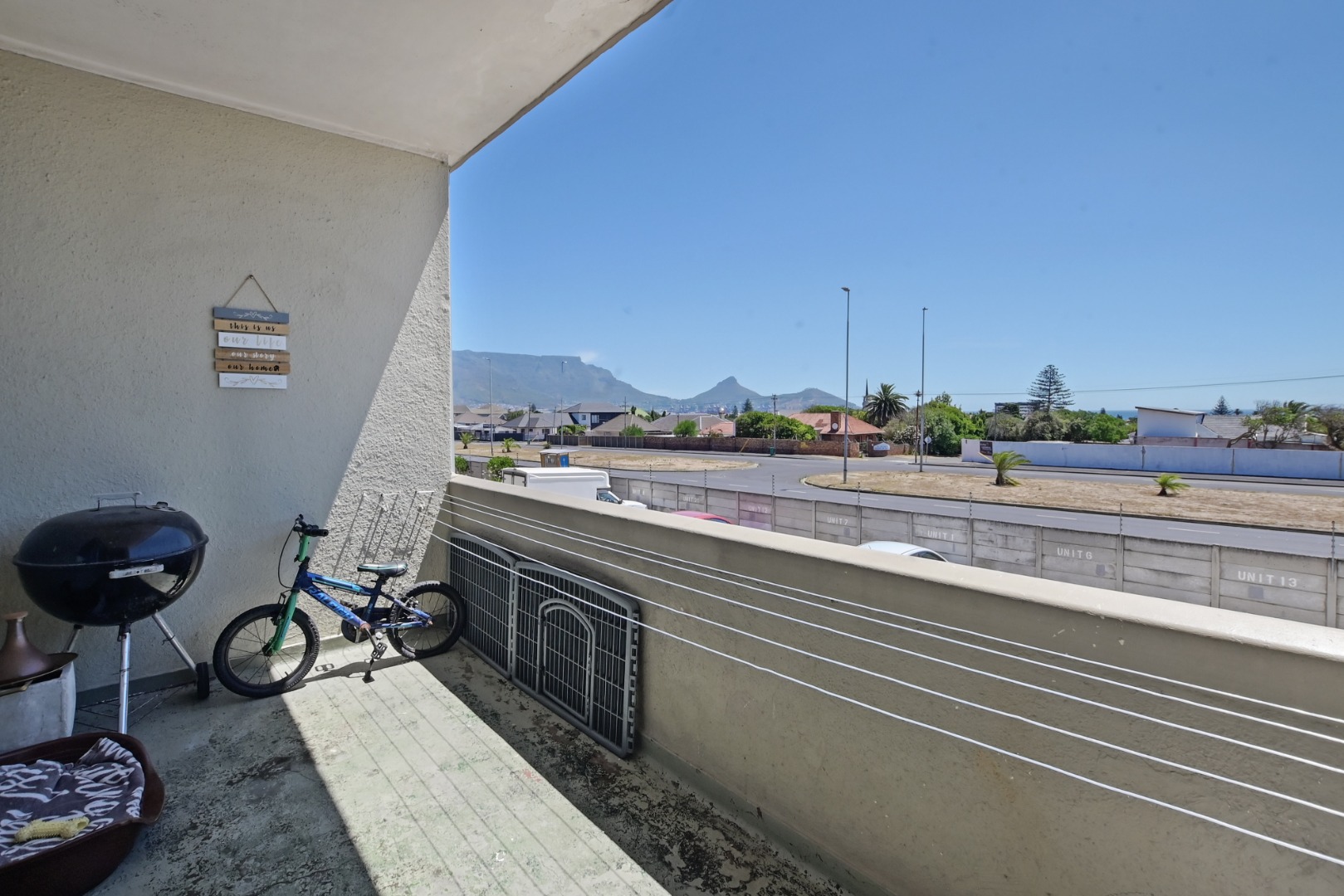 The large bedroom features built-in cupboards and is complemented by a bathroom with a shower over the bath. The expansive lounge area flows effortlessly onto a balcony, where you can enjoy lovely views of Table Mountain — the perfect spot to relax or unwind at the end of the day.