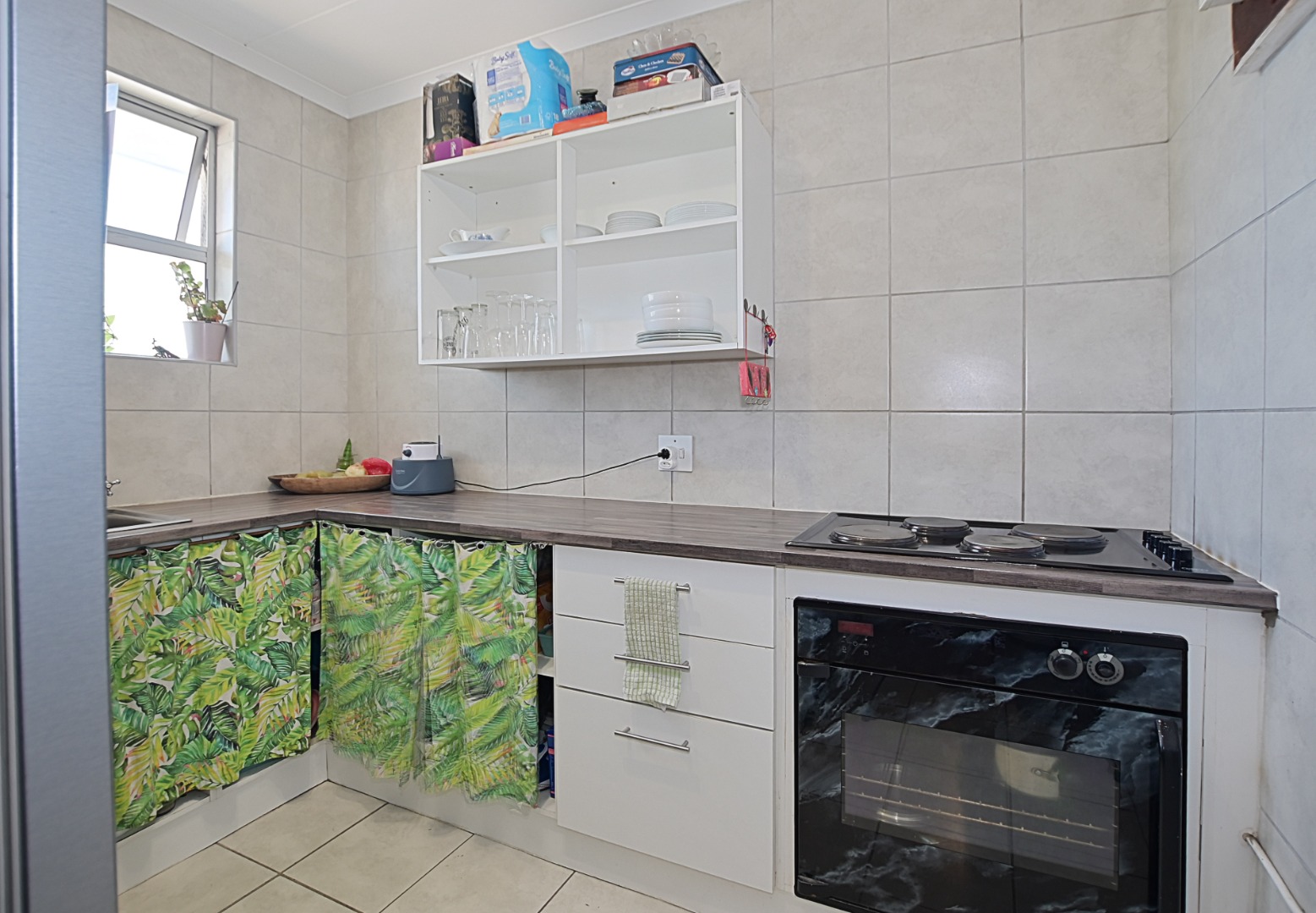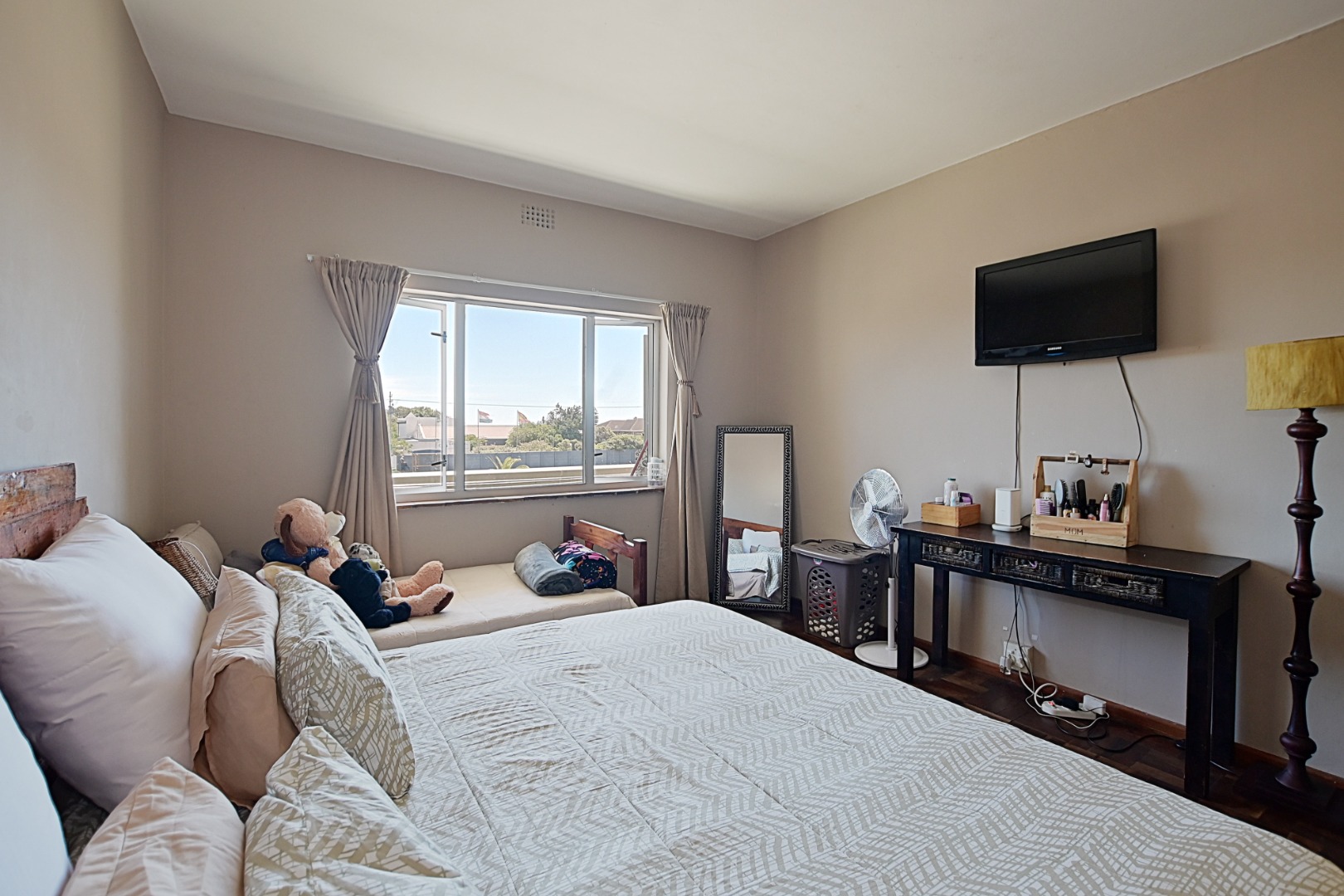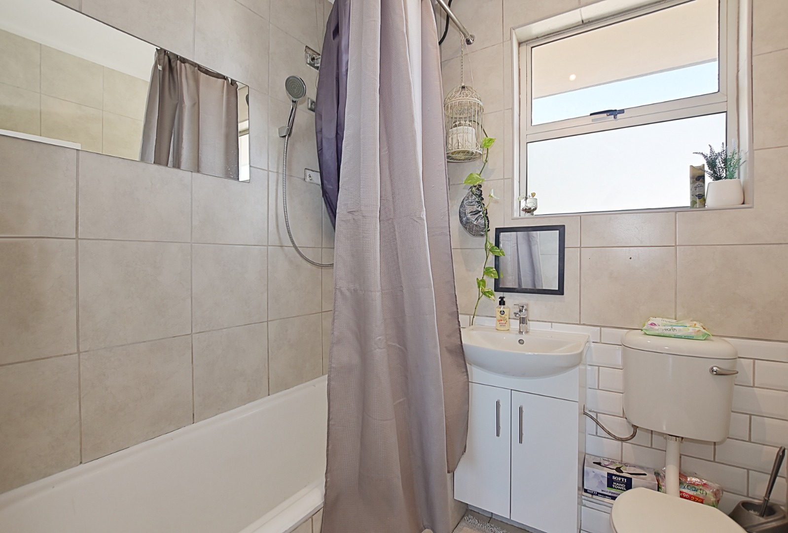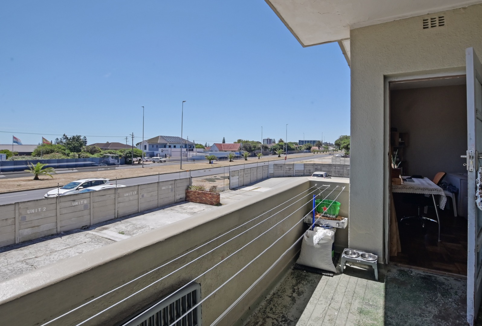 The large bedroom features built-in cupboards and is complemented by a bathroom with a shower over the bath. The expansive lounge area flows effortlessly onto a balcony, where you can enjoy lovely views of Table Mountain — the perfect spot to relax or unwind at the end of the day.