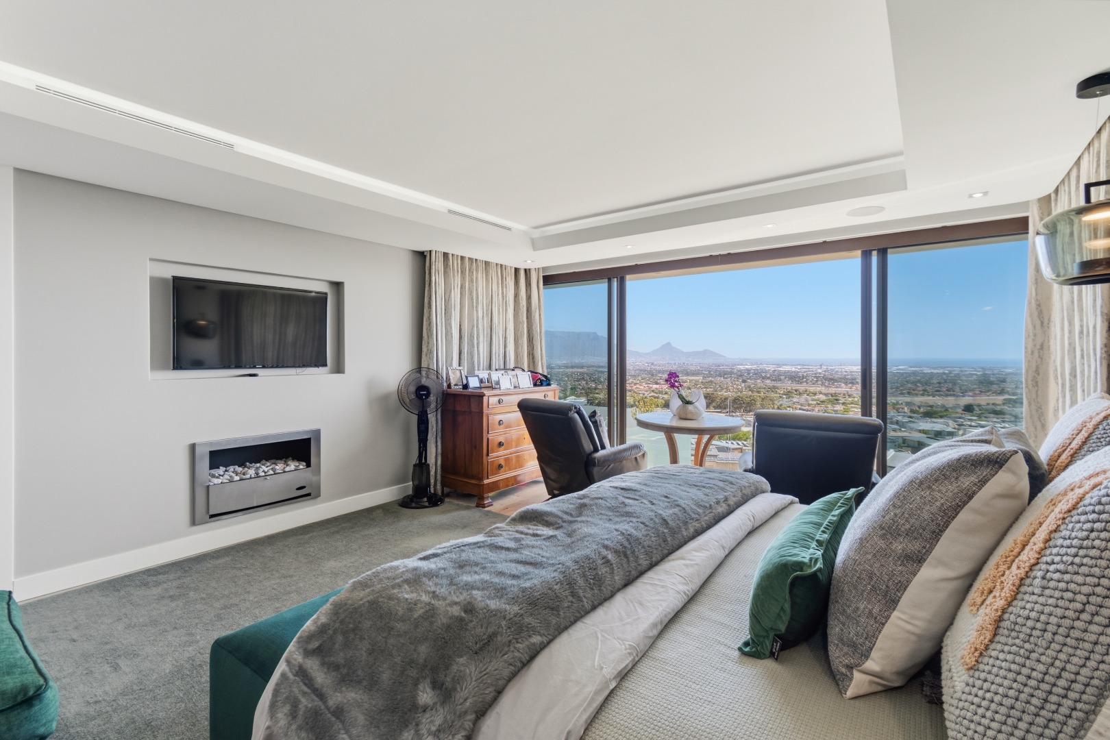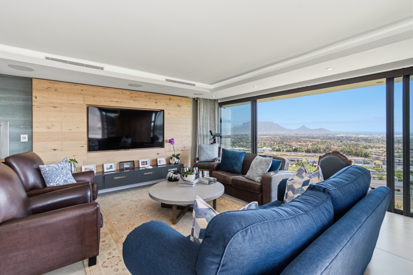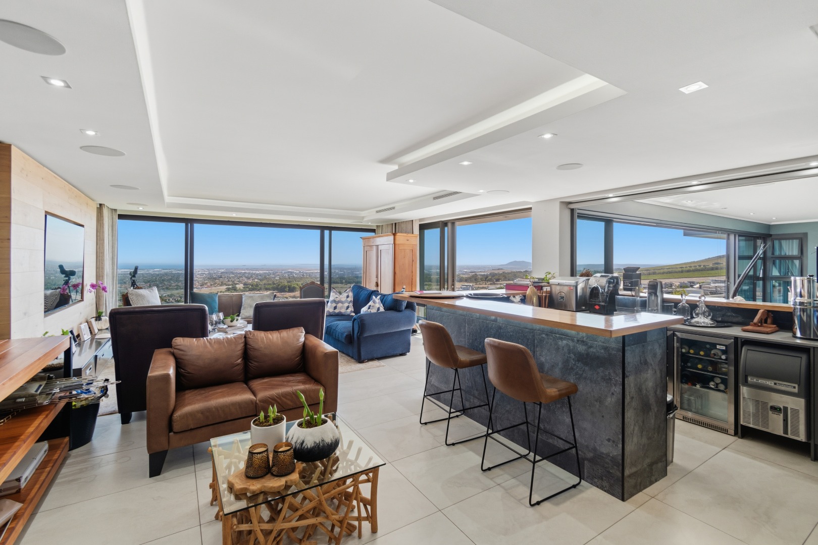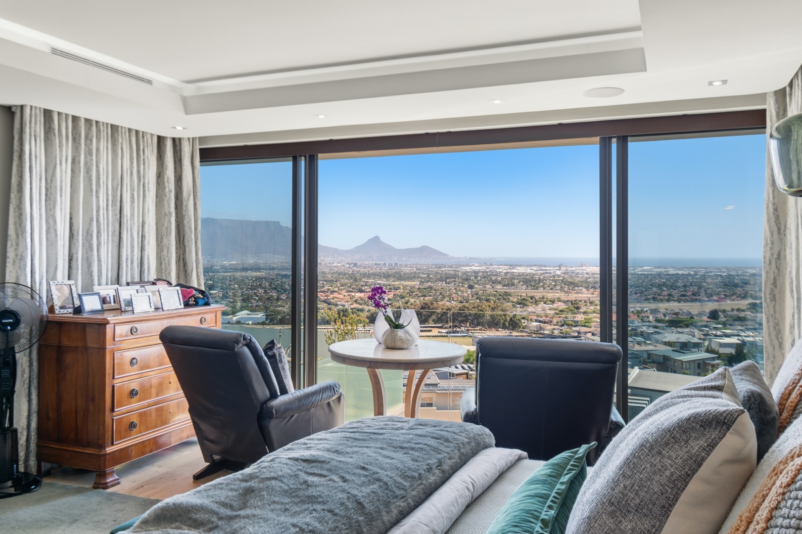 The heart of the home unfolds on the middle level, where a grand entrance foyer introduces a seamless flow of space, light, and panoramic views. Upon entry, one is immediately drawn toward the uninterrupted outlook across Table Bay and Table Mountain.