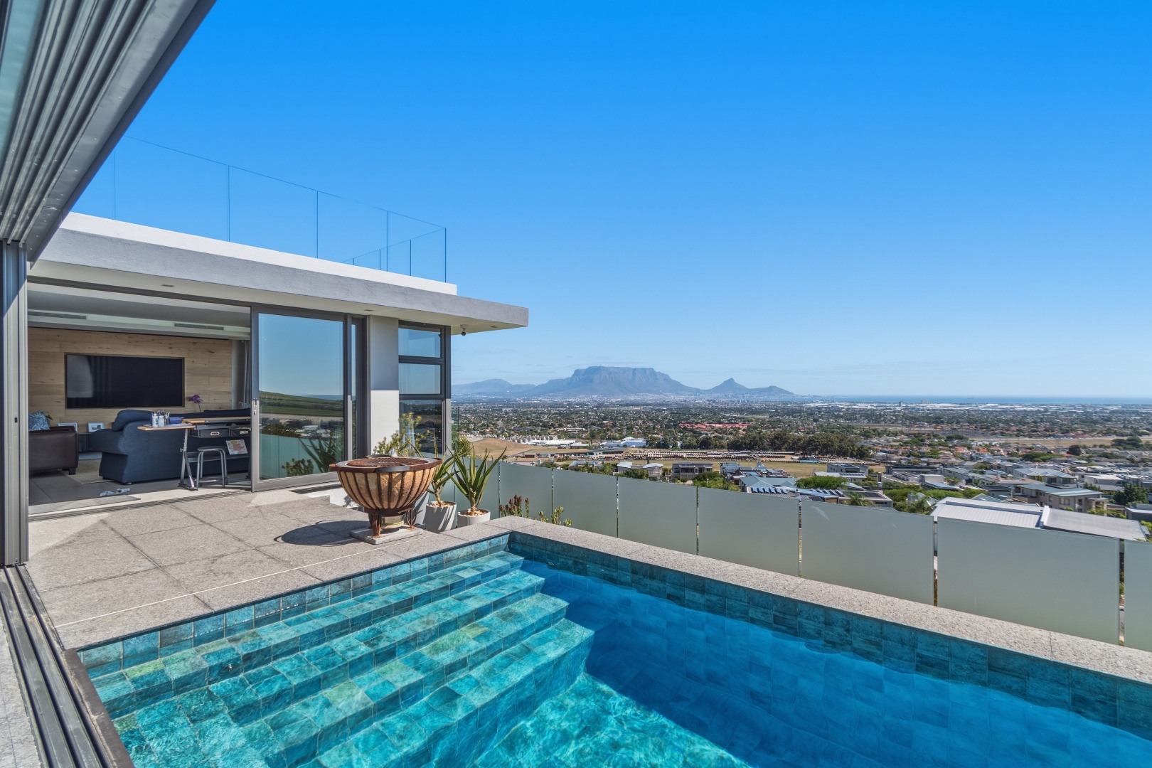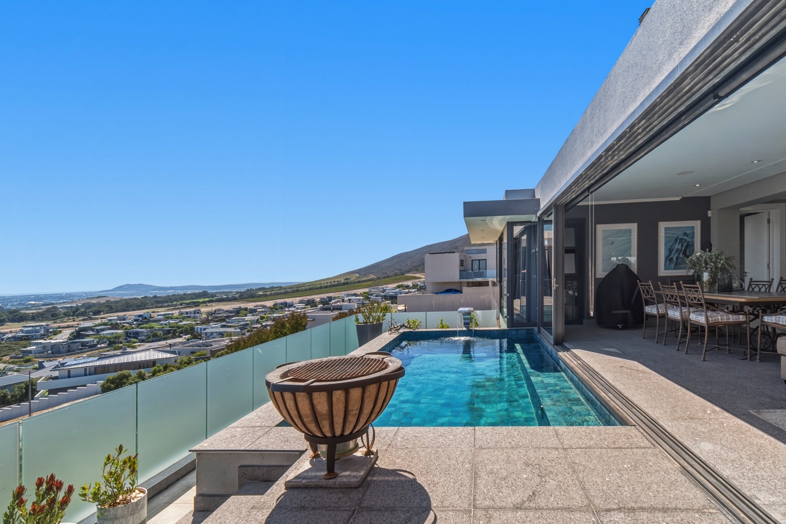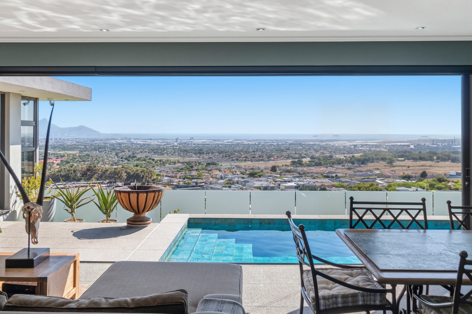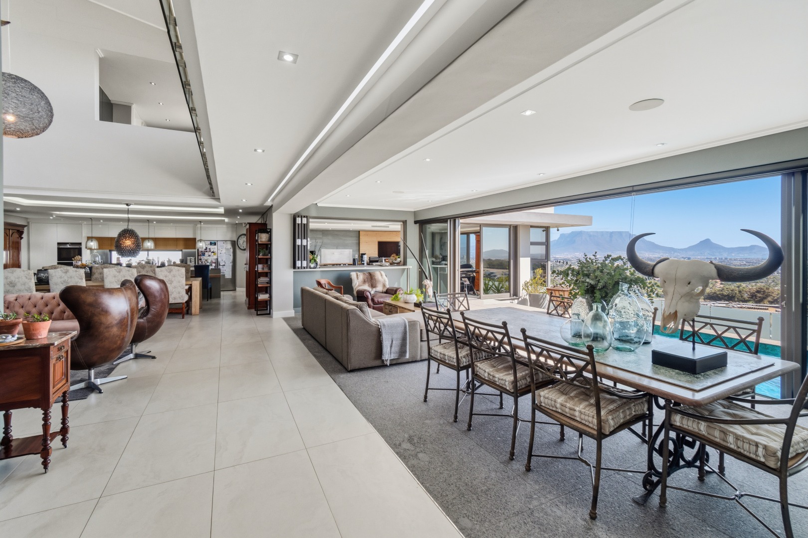 The layout has been masterfully designed to balance formal and informal living. The informal living and dining area sits directly ahead, where expansive sliding doors open effortlessly onto the terraced outdoor space, complete with a rim-flow tiled pool and elegant waterfall feature, all set against a dramatic natural backdrop of the ocean and Table Mountain.