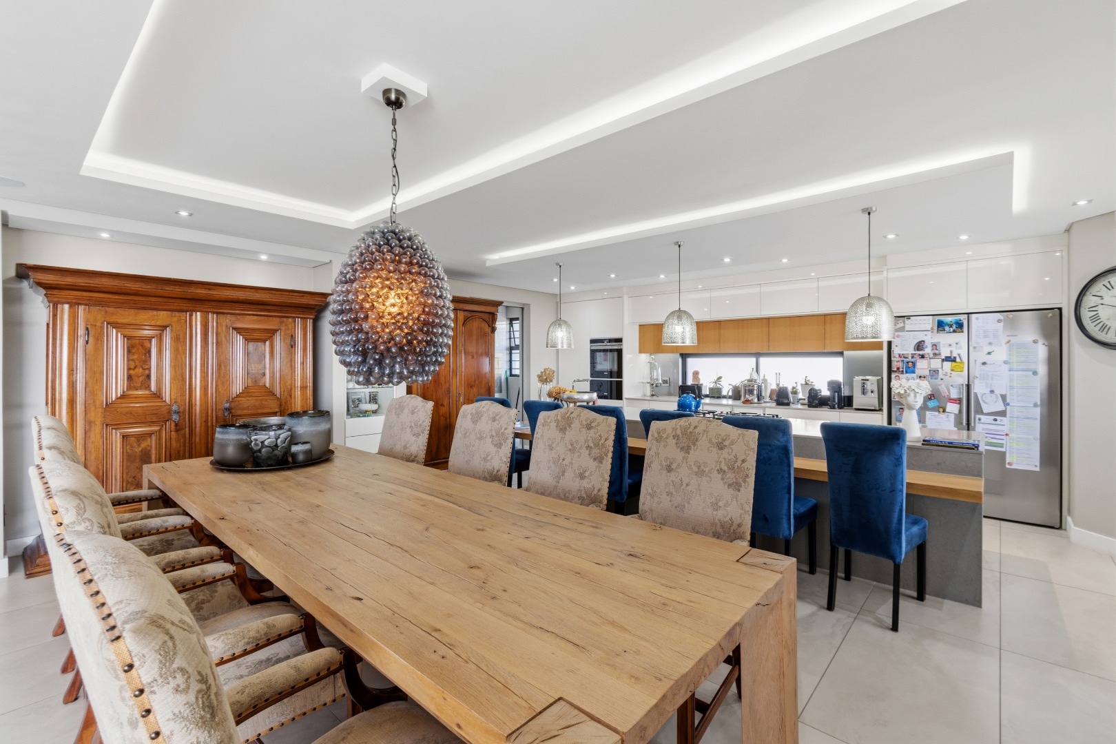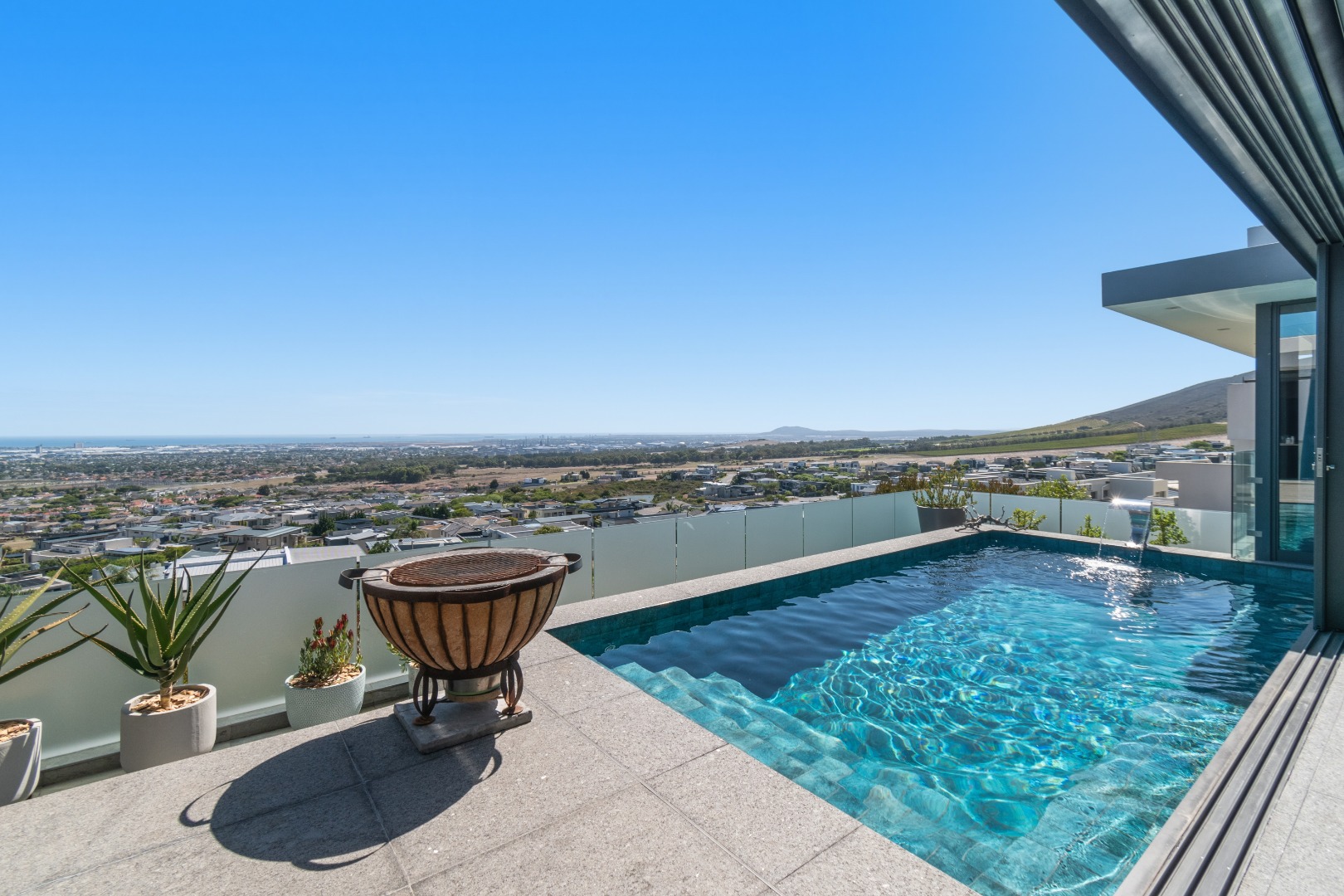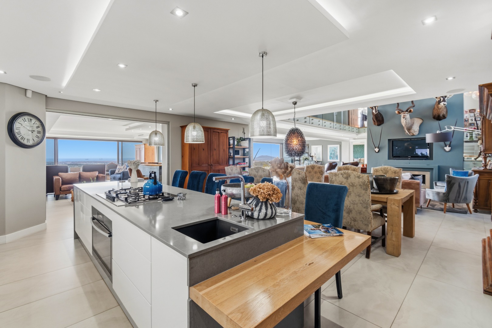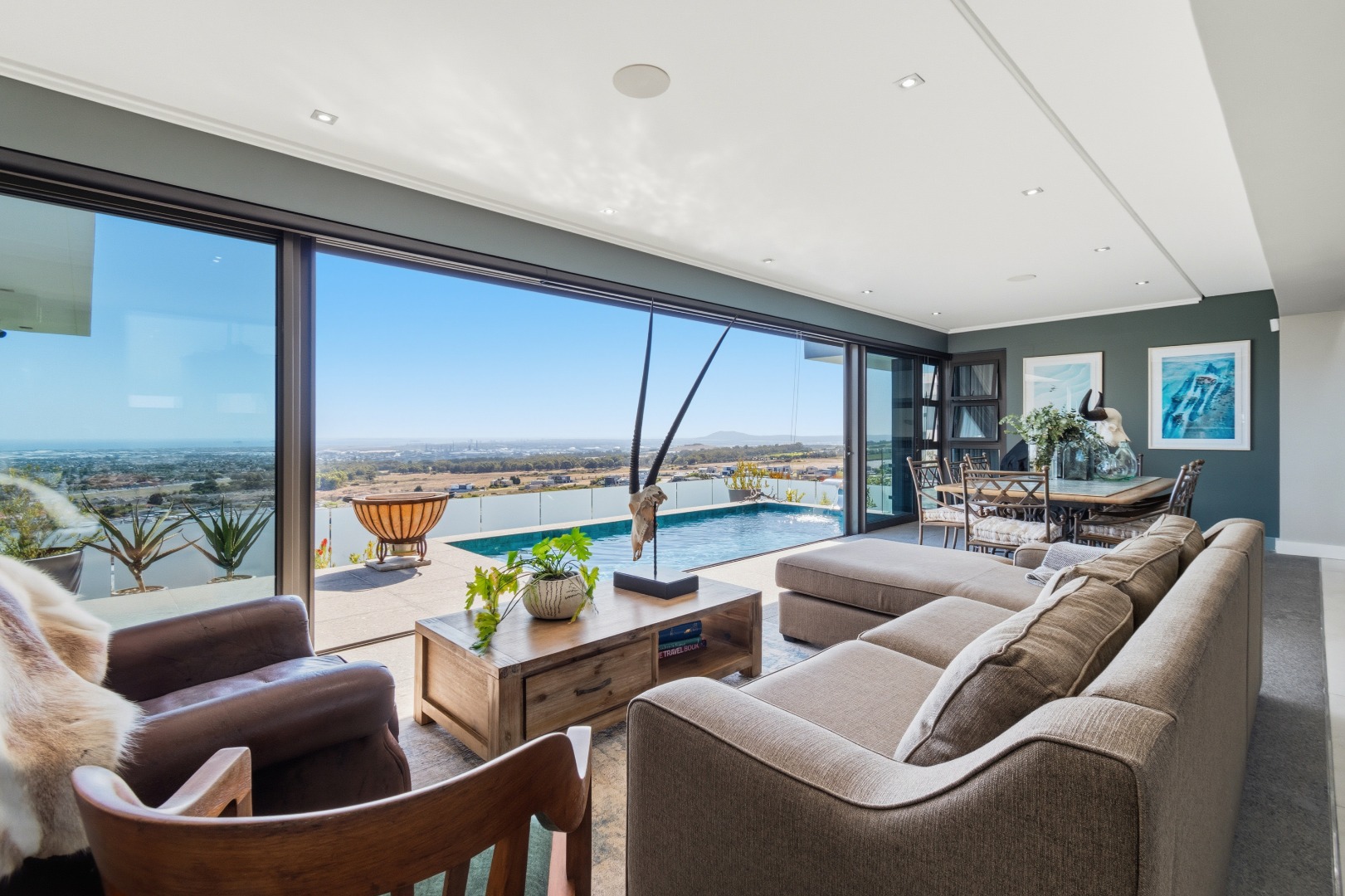 The layout has been masterfully designed to balance formal and informal living. The informal living and dining area sits directly ahead, where expansive sliding doors open effortlessly onto the terraced outdoor space, complete with a rim-flow tiled pool and elegant waterfall feature, all set against a dramatic natural backdrop of the ocean and Table Mountain.