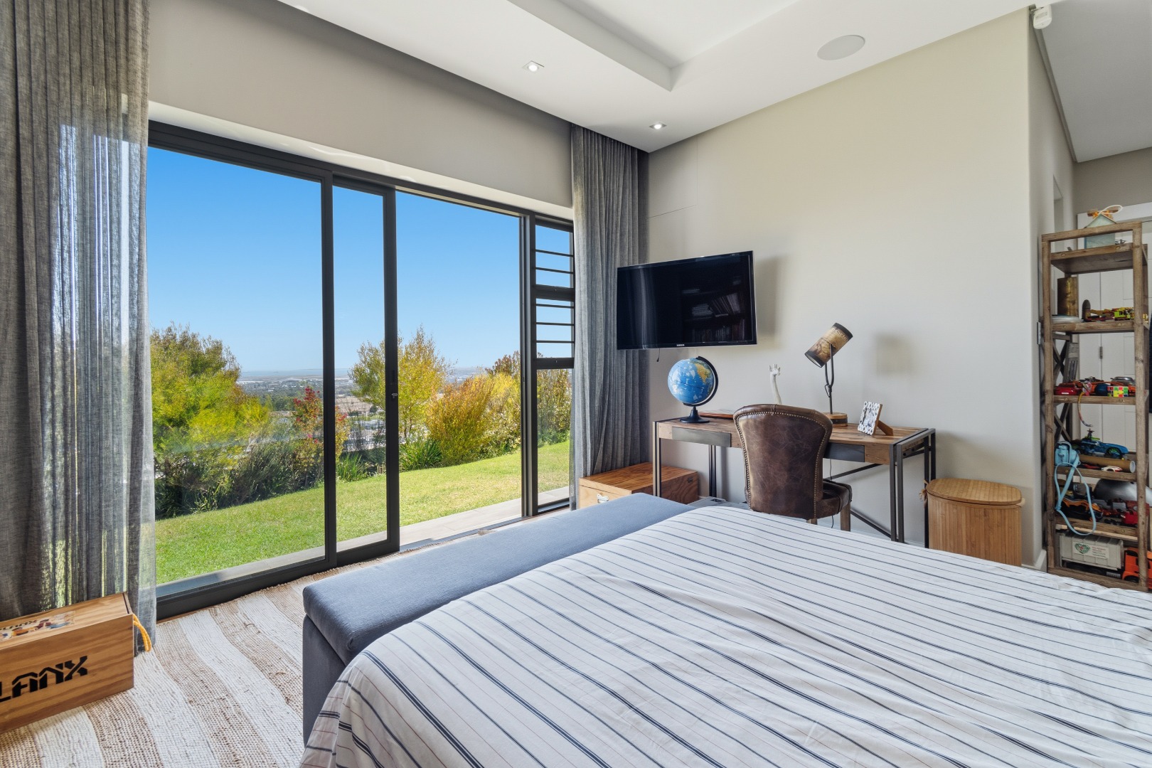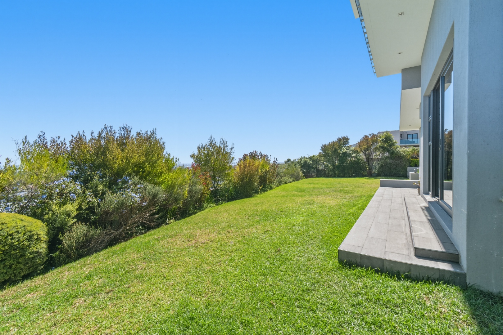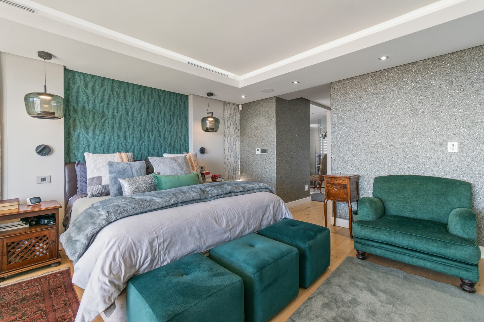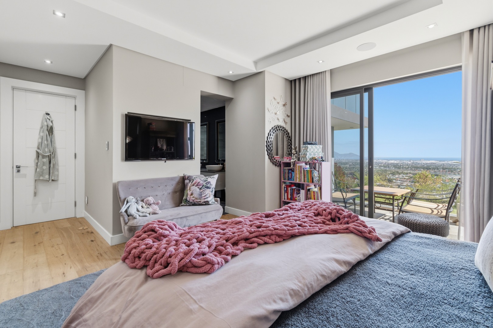 Three additional bedrooms, each with their own en-suite bathrooms, open directly onto a landscaped garden with lush greenery and mature trees. Each room enjoys the same remarkable views, ensuring consistency in luxury throughout the home.