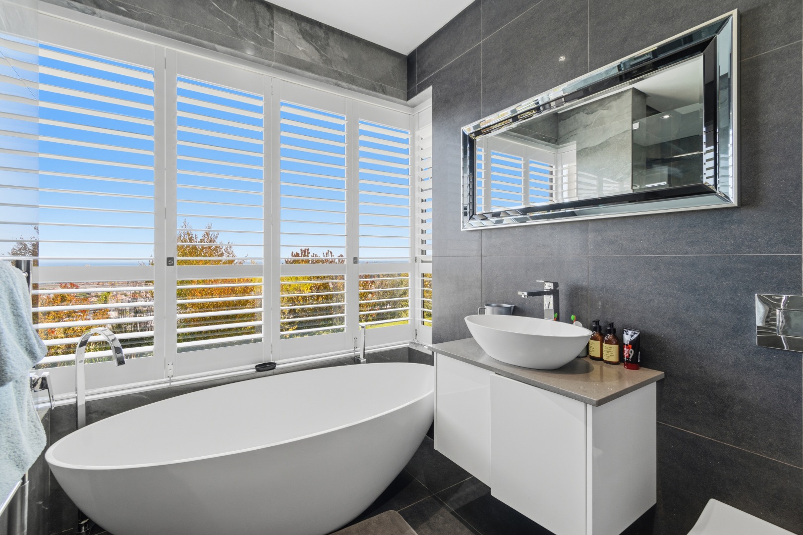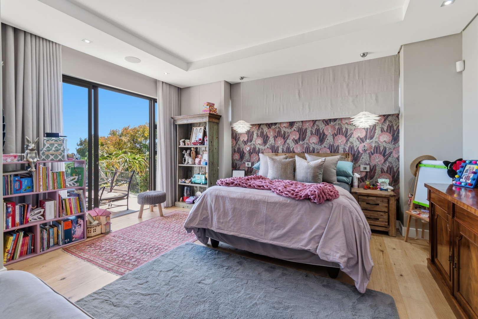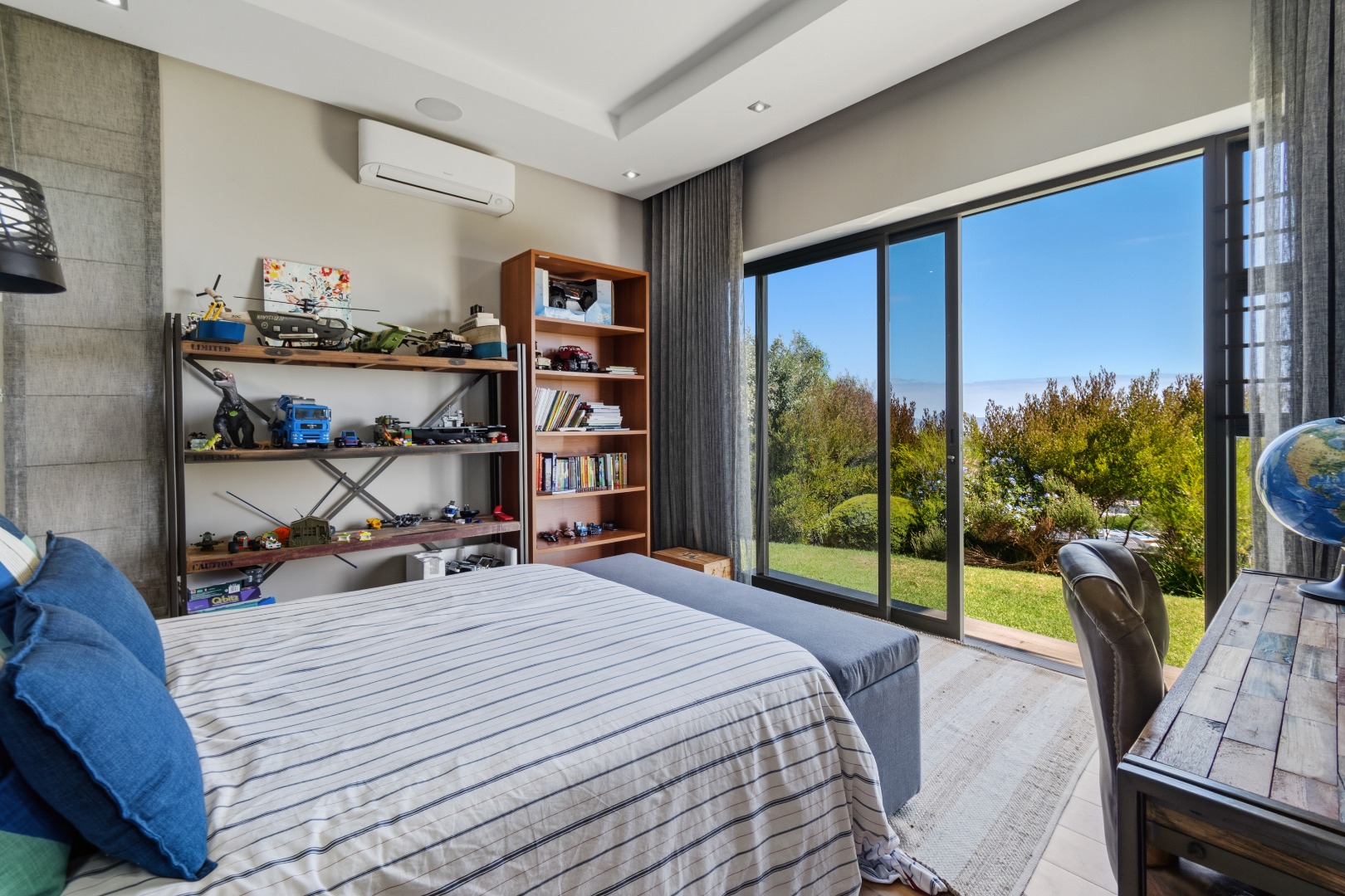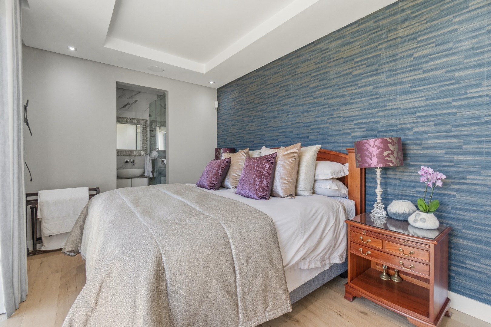 Three additional bedrooms, each with their own en-suite bathrooms, open directly onto a landscaped garden with lush greenery and mature trees. Each room enjoys the same remarkable views, ensuring consistency in luxury throughout the home.