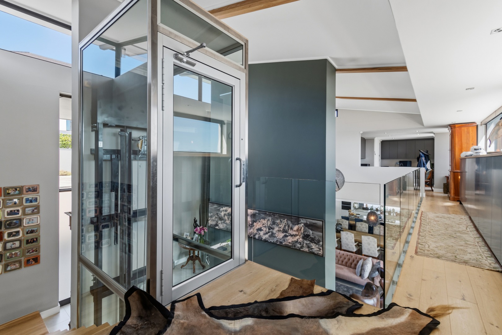 The upper level is defined by convenience and refined design, offering two double garages (accommodating four vehicles), including a dedicated staff bathroom. One of the garages house a dumbwaiter which delivers groceries to the scullery down below. A standout feature of the home is the striking glass-enclosed elevator, seamlessly connecting all three levels while serving as both a functional element and architectural showpiece. A sophisticated landing area opens to breathtaking views, complemented by a spacious, fully fitted study with dual built-in workstations. An expansive terrace extends from this level, providing an inspiring setting to take in the sweeping vistas.