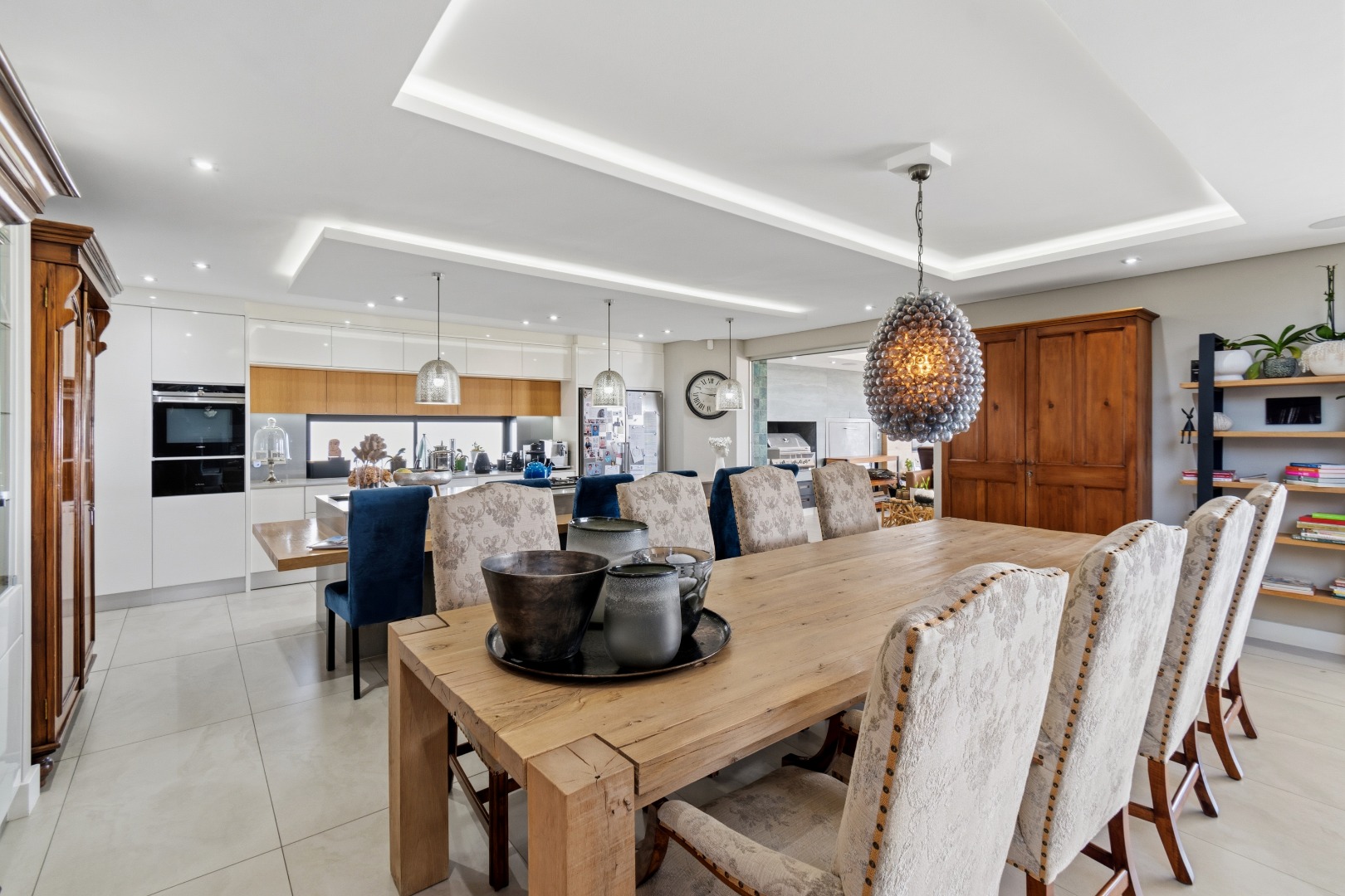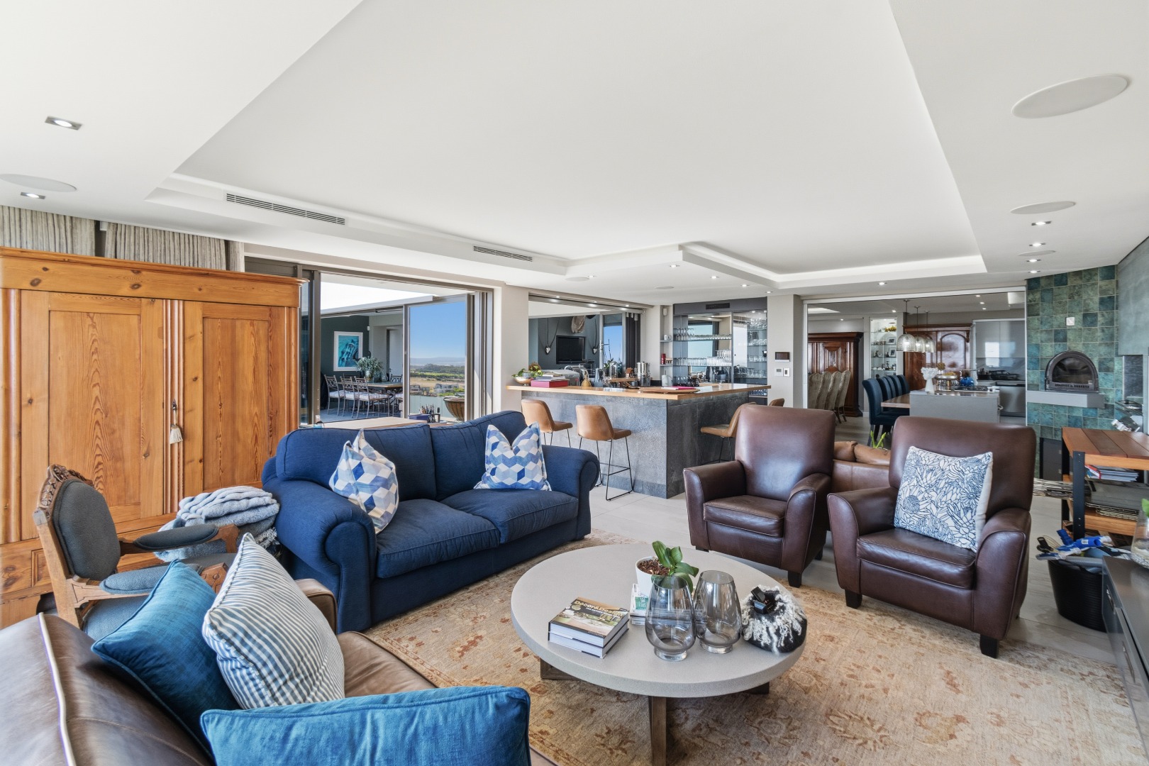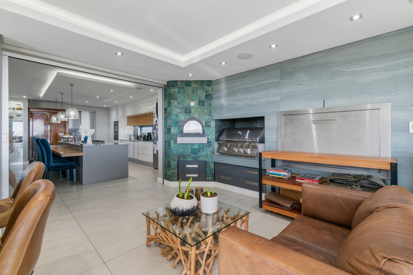 Extending from the kitchen is a dedicated entertainment wing, designed for hosting on any scale. This space features a built-in wood-burning braai, pizza oven, and a built-in gas grill, alongside a sophisticated bar area and generous seating. Sliding doors once again open onto the terrace, allowing for a continuous indoor-outdoor lifestyle centred around the pool and views.