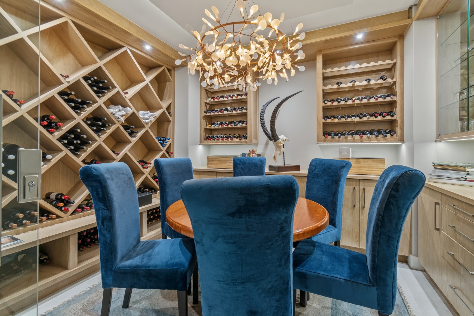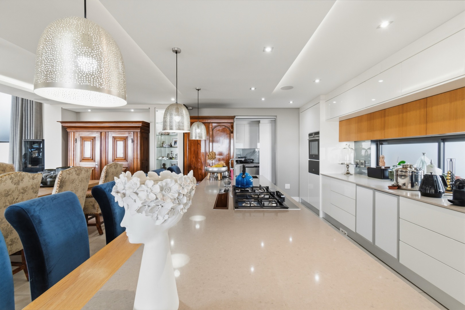 The chef’s kitchen is both functional and beautifully appointed, centred around an oversized island with integrated appliances, a five-plate gas hob, and a pop-up extractor. A breakfast nook enhances everyday living, while a separate scullery, complete with a dumbwaiter connection and a substantial walk-in pantry, ensures seamless practicality.