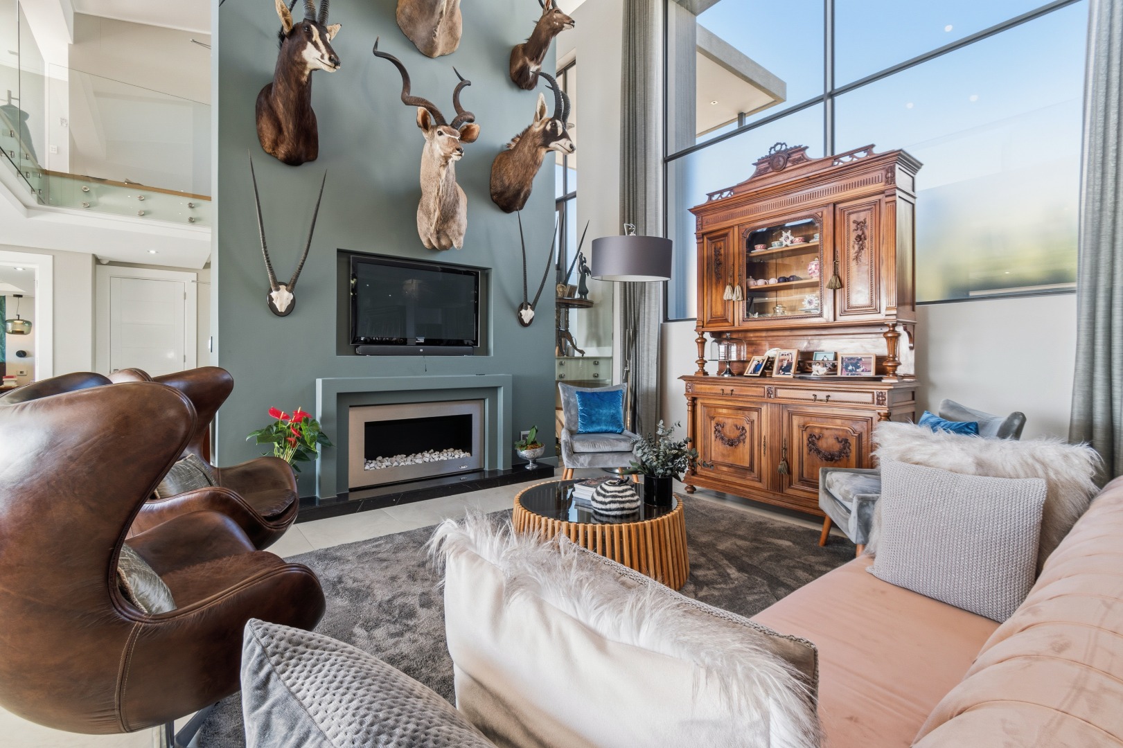 Opposite this, the formal living area is presented in a striking double-volume space, enhanced by a floor-to-ceiling glass façade and a feature gas fireplace, creating both scale and warmth. Adjacent lies the formal dining area, perfectly positioned for refined entertaining.