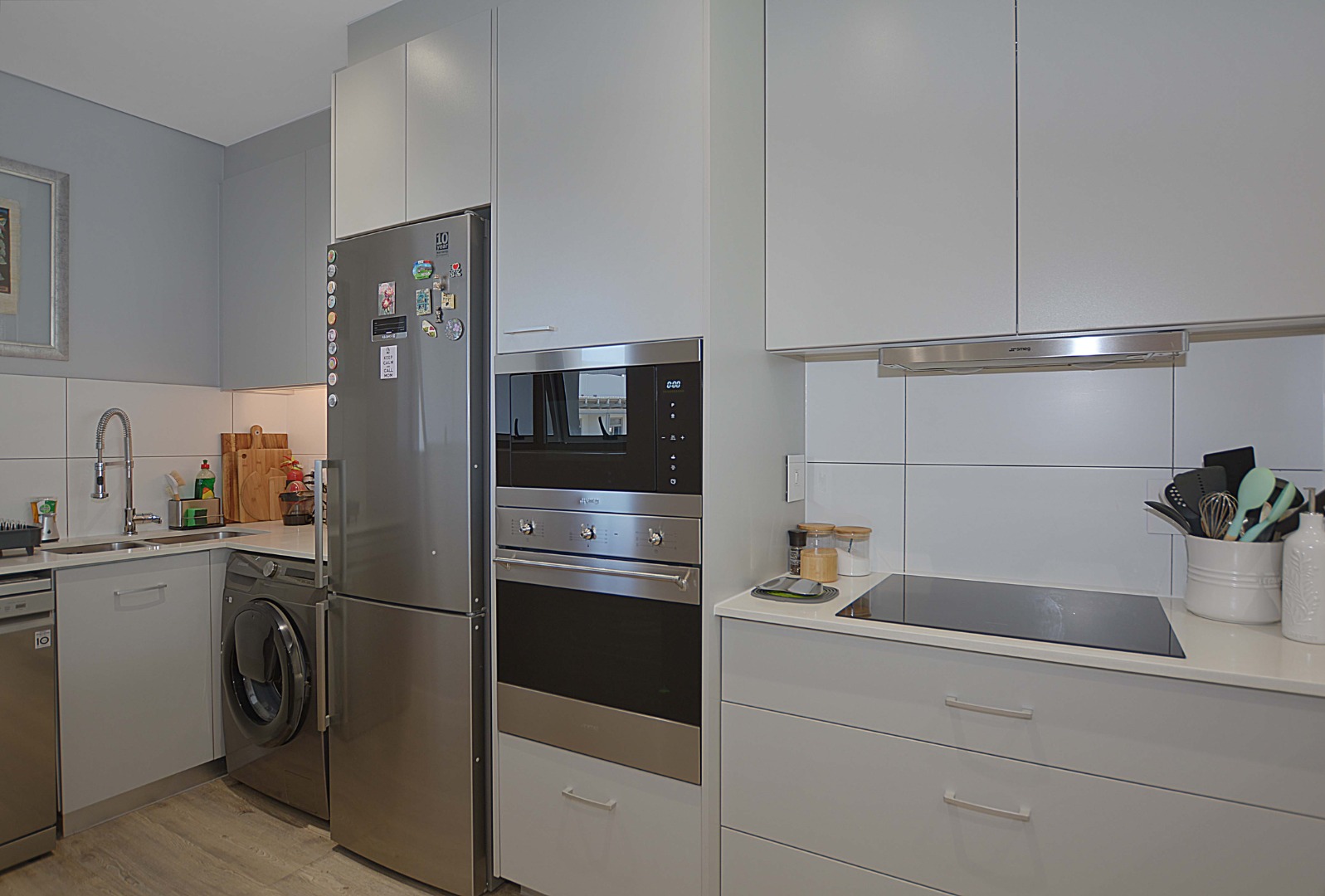 Modern gourmet kitchen with soft touch cupboards, Smeg Hob, oven and microwave.