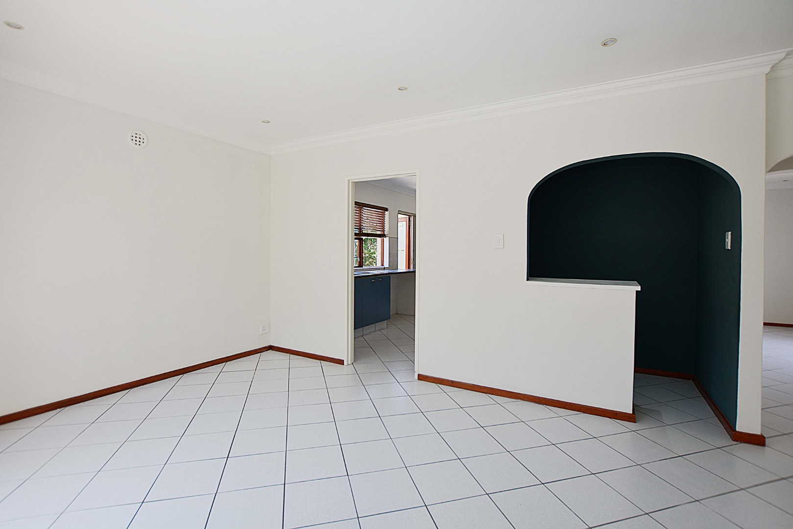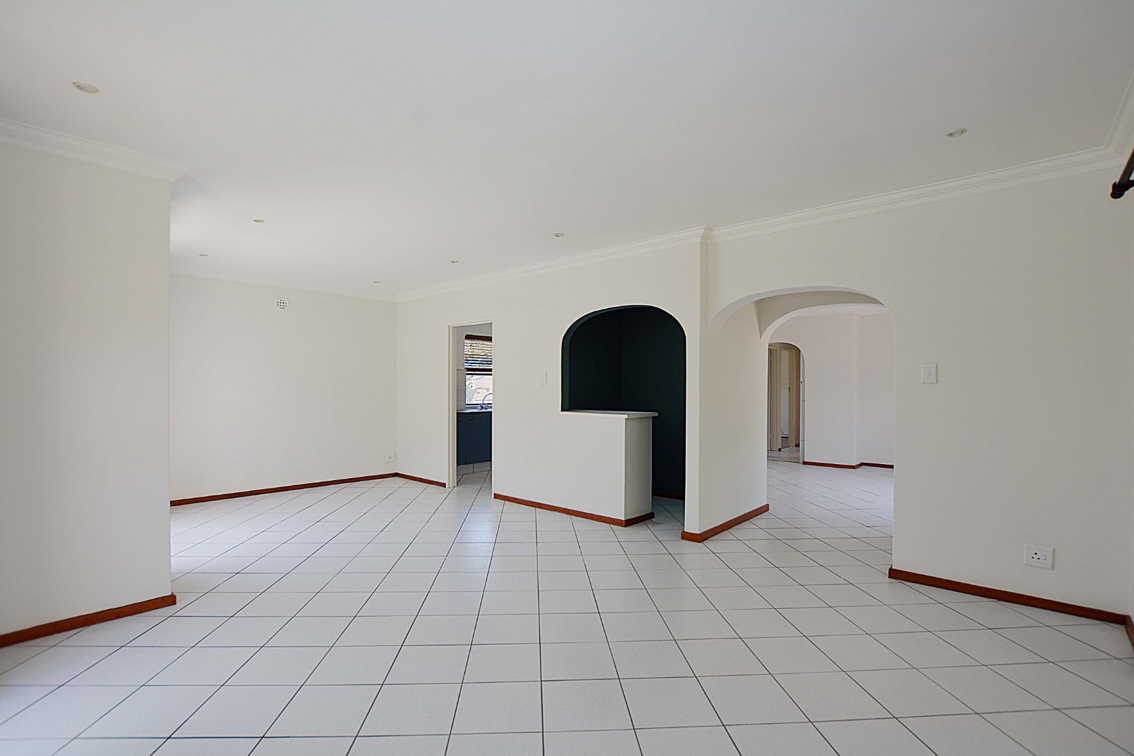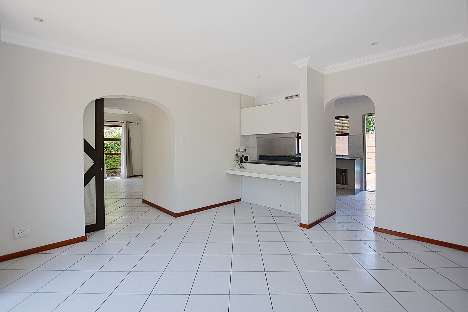 The interior boasts a bright and airy atmosphere with neutral white walls and clean white tiled flooring throughout, providing a versatile canvas for your personal style. The property features two distinct lounges, a dedicated dining room, and an additional family TV room, ensuring ample space for relaxation and entertainment. An entrance hall welcomes you into the home, leading to the well-appointed kitchen, ready for your culinary endeavours. Architectural details like arched doorways and crown molding add a touch of elegance to the living spaces.