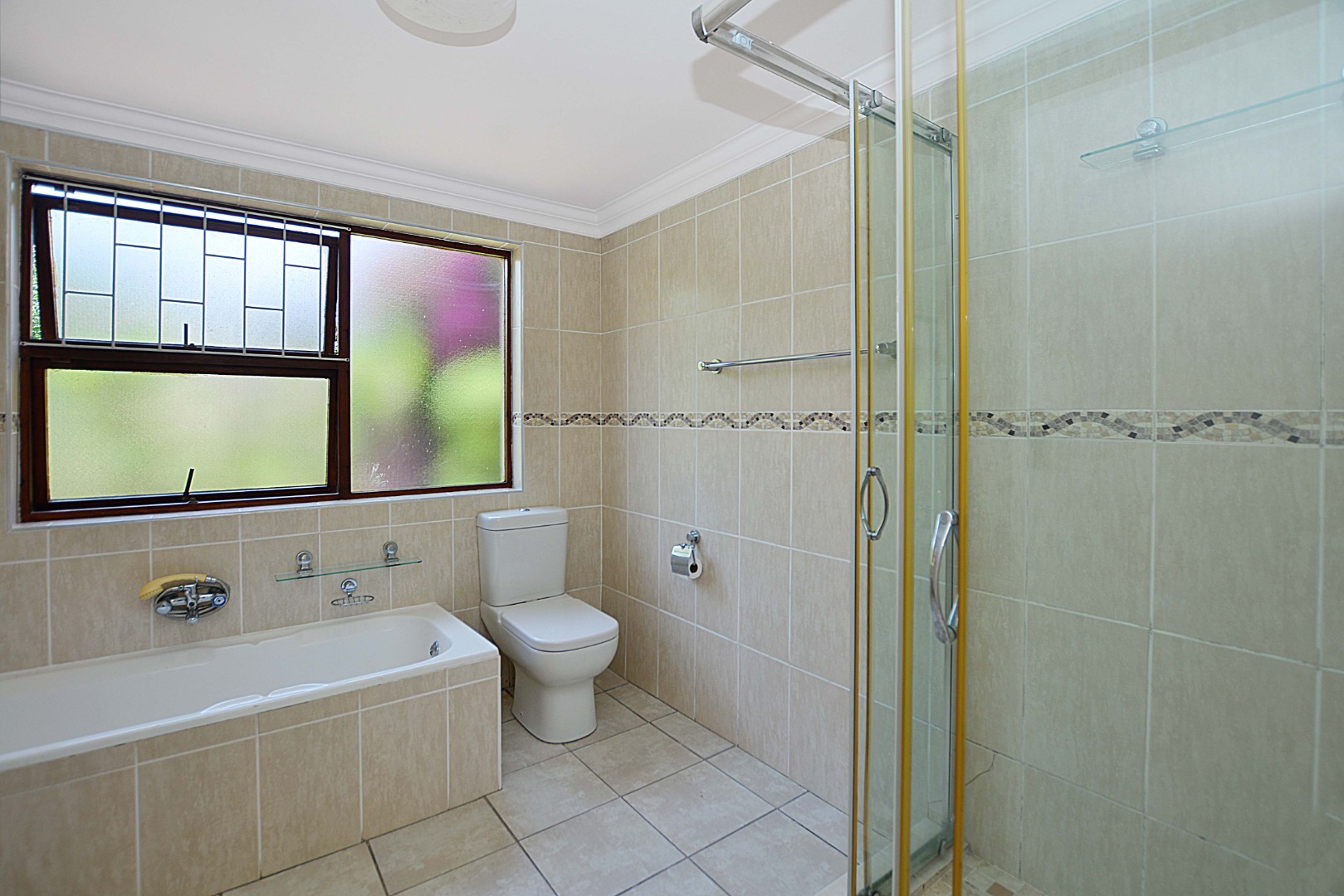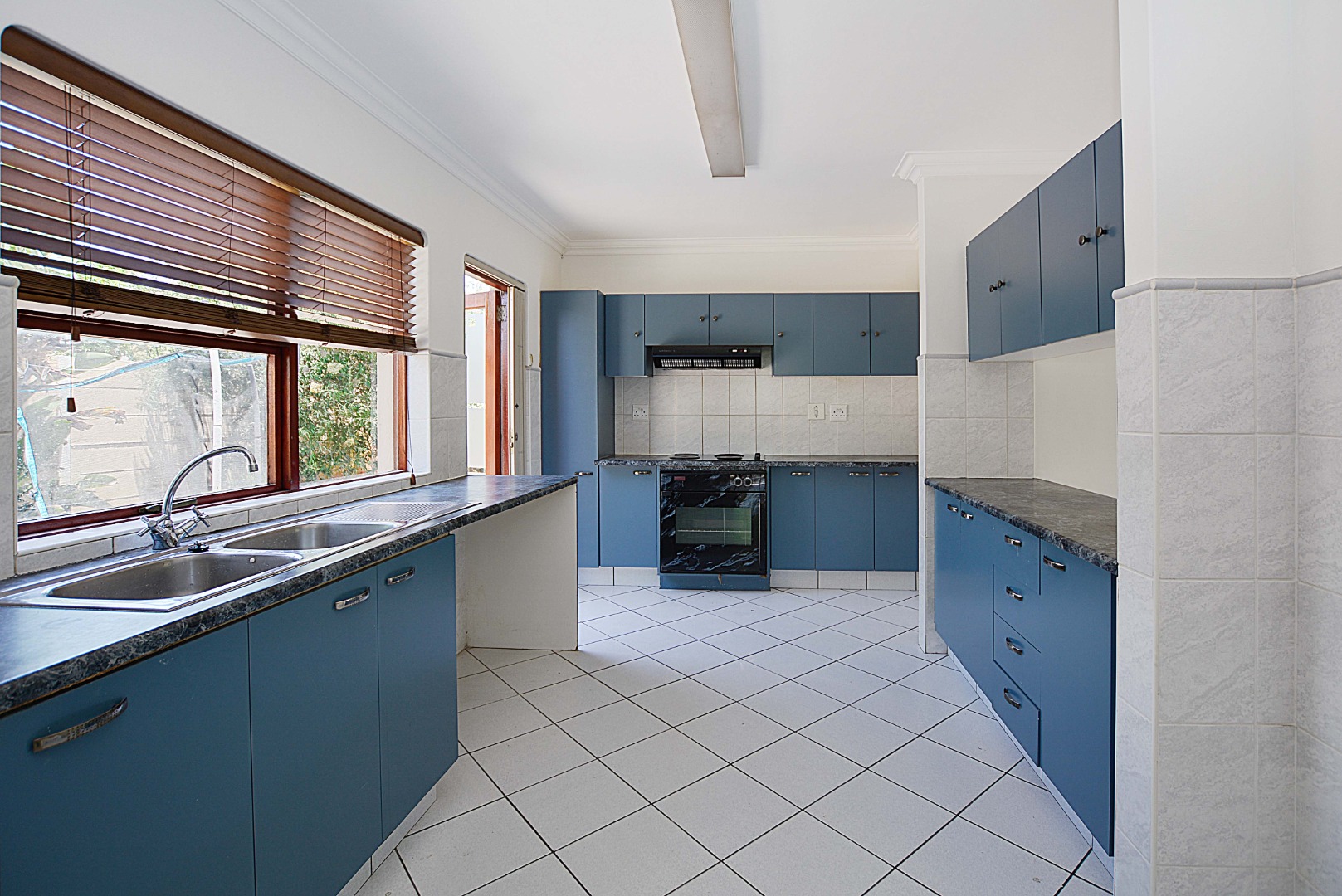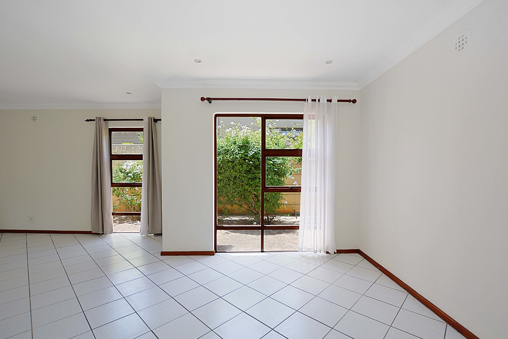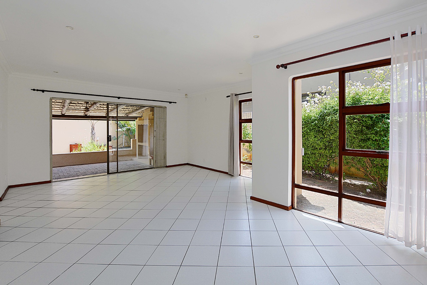 The interior boasts a bright and airy atmosphere with neutral white walls and clean white tiled flooring throughout, providing a versatile canvas for your personal style. The property features two distinct lounges, a dedicated dining room, and an additional family TV room, ensuring ample space for relaxation and entertainment. An entrance hall welcomes you into the home, leading to the well-appointed kitchen, ready for your culinary endeavours. Architectural details like arched doorways and crown molding add a touch of elegance to the living spaces.