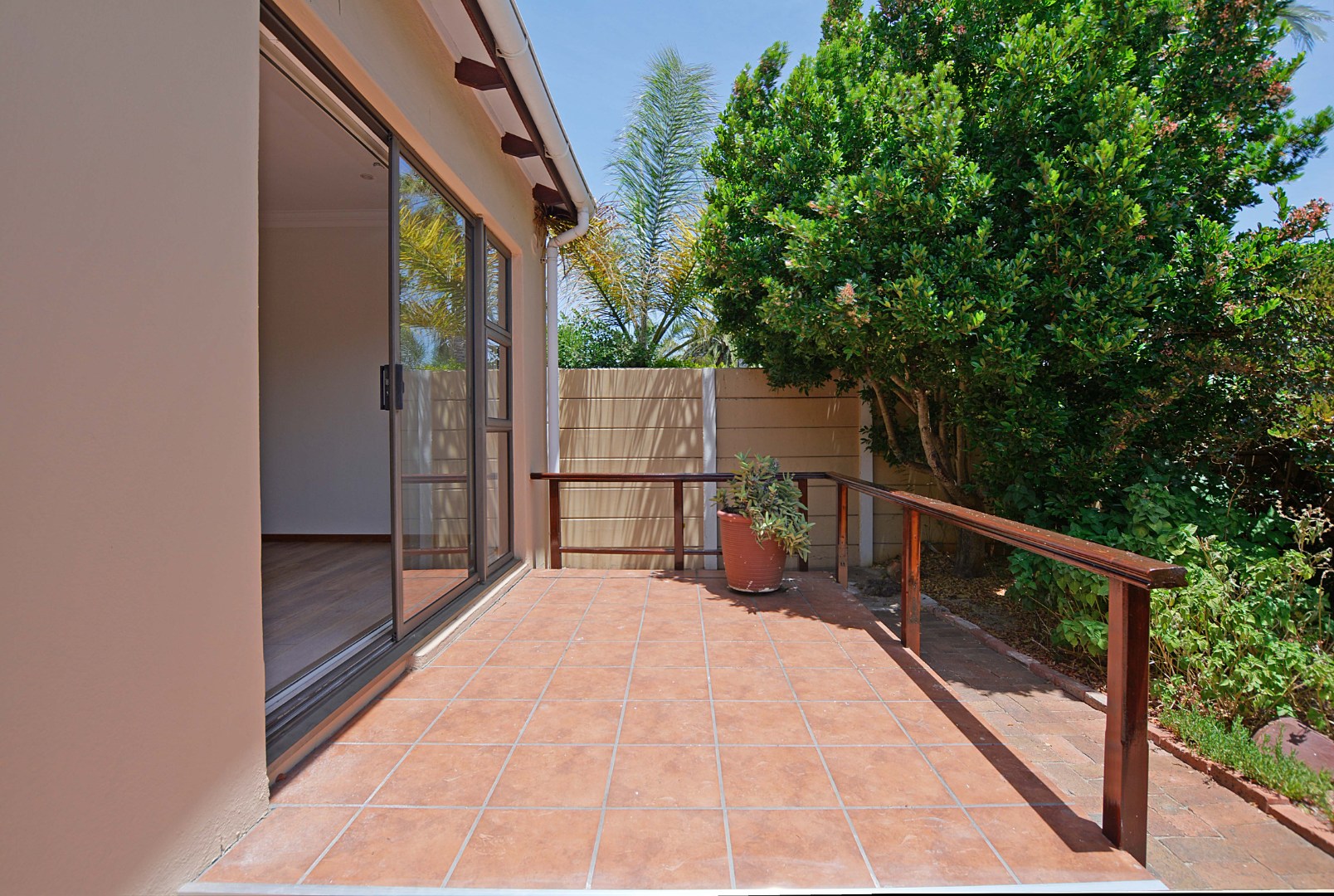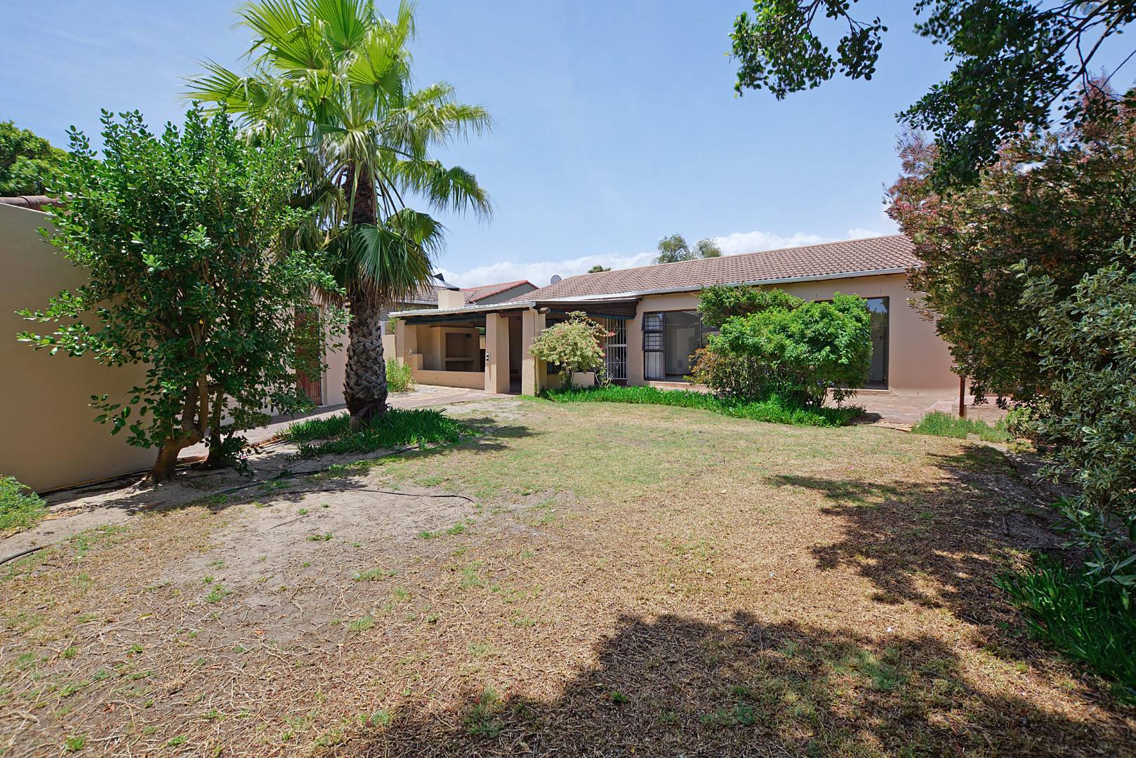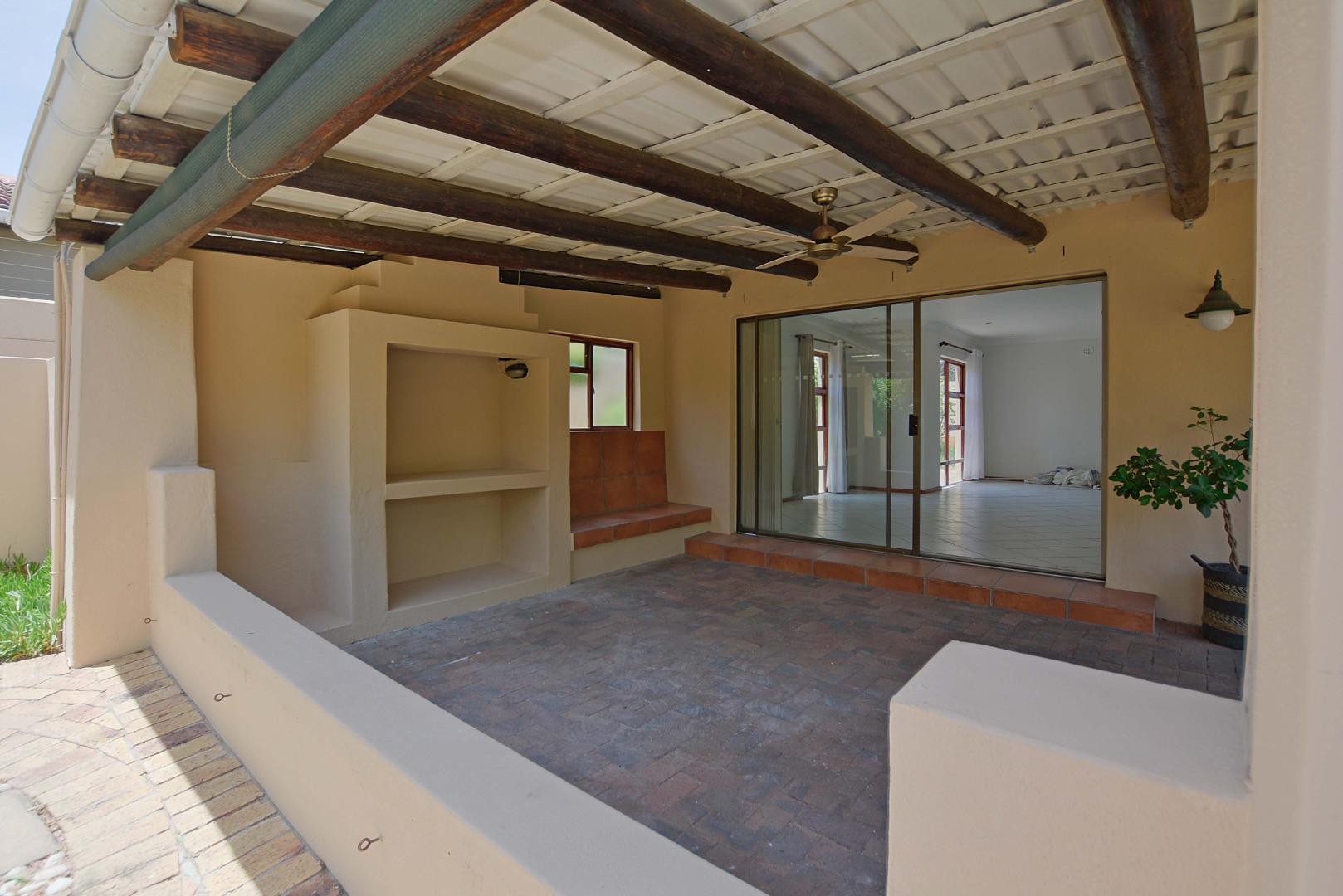 Step outside to a fantastic covered patio, perfect for year-round outdoor living and entertaining. This area includes a built-in braai, convenient tiled seating, and a ceiling fan for comfort on warmer days. Large sliding glass doors seamlessly connect the indoor living areas to this outdoor oasis and the private garden. The property also benefits from a generous 726 sqm erf size, offering a garden space and paving, with pets allowed, making it suitable for those with furry companions.