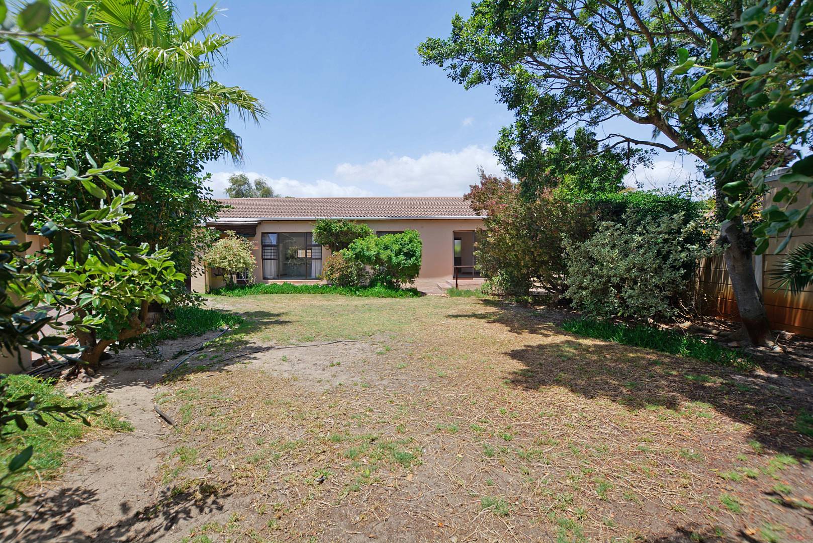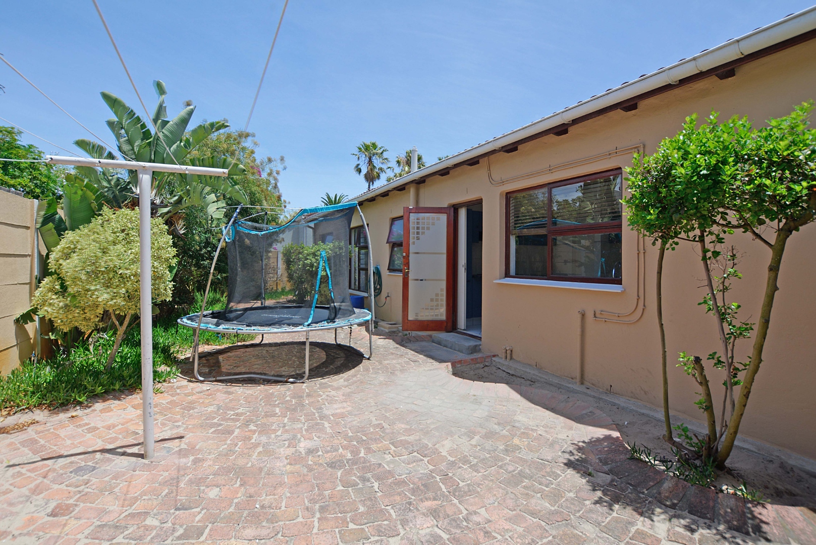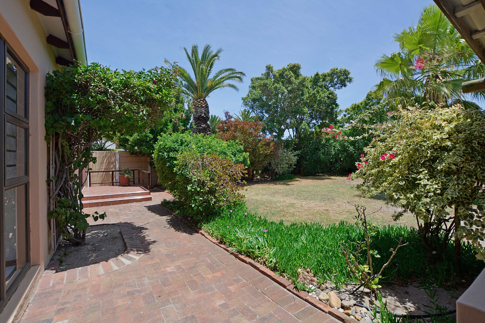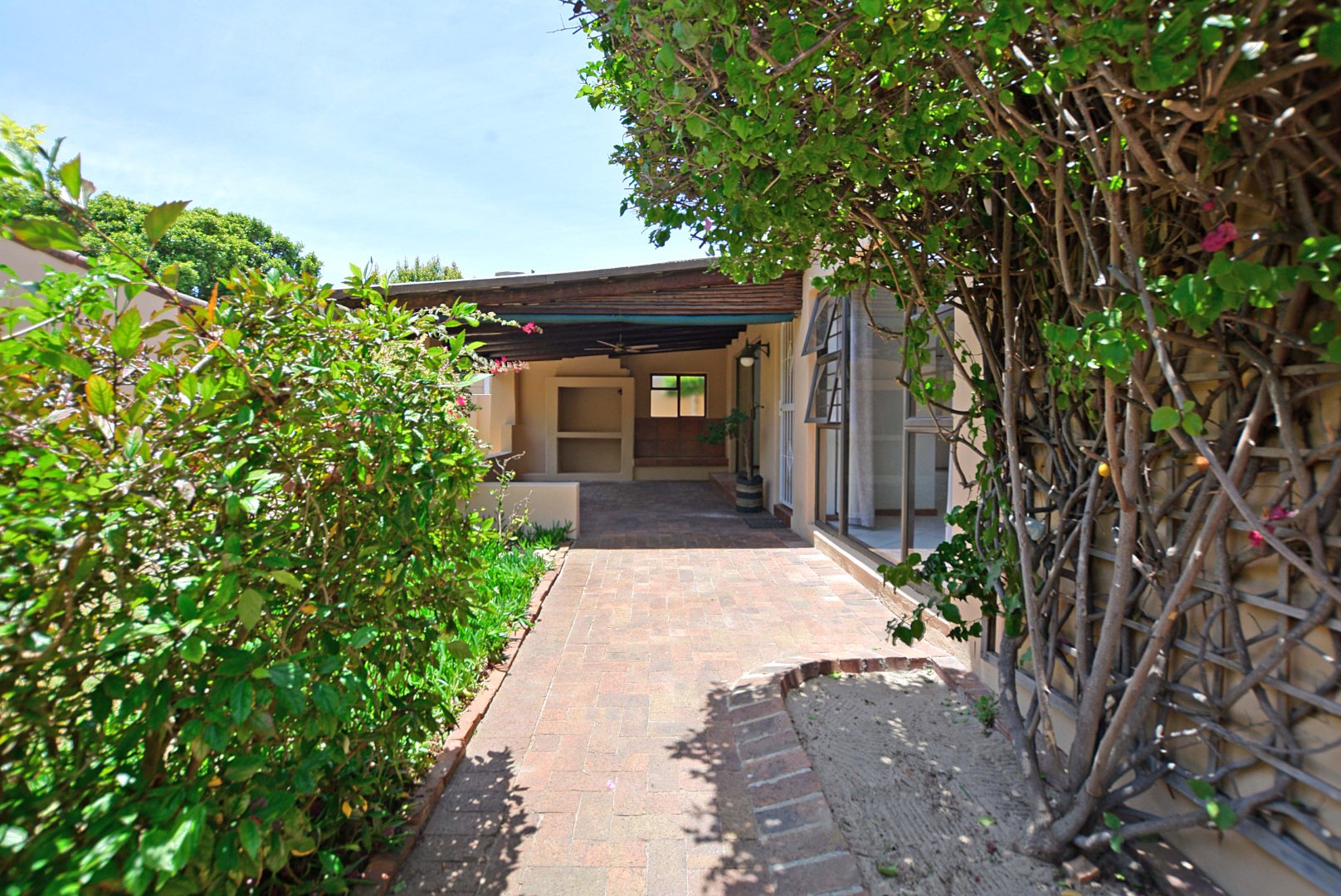 Step outside to a fantastic covered patio, perfect for year-round outdoor living and entertaining. This area includes a built-in braai, convenient tiled seating, and a ceiling fan for comfort on warmer days. Large sliding glass doors seamlessly connect the indoor living areas to this outdoor oasis and the private garden. The property also benefits from a generous 726 sqm erf size, offering a garden space and paving, with pets allowed, making it suitable for those with furry companions.