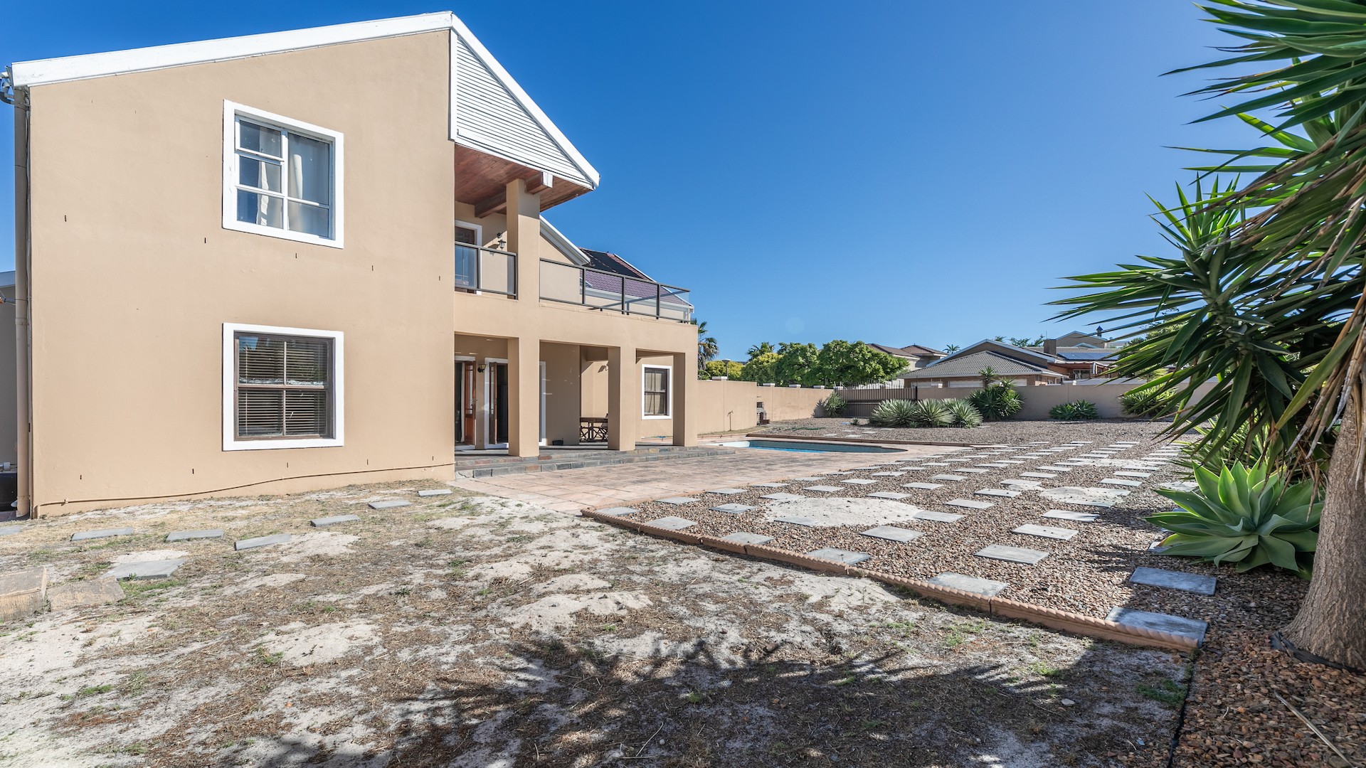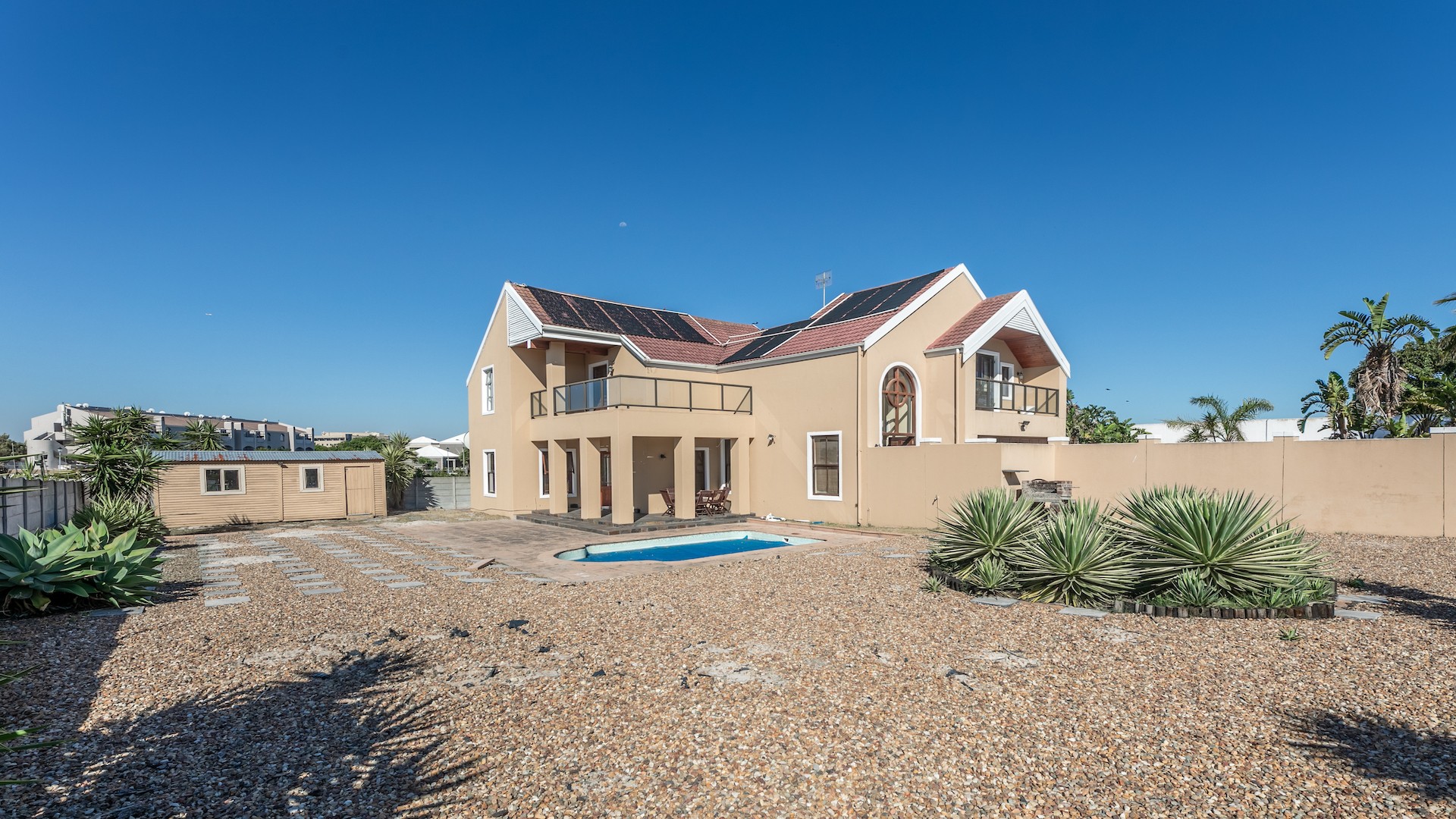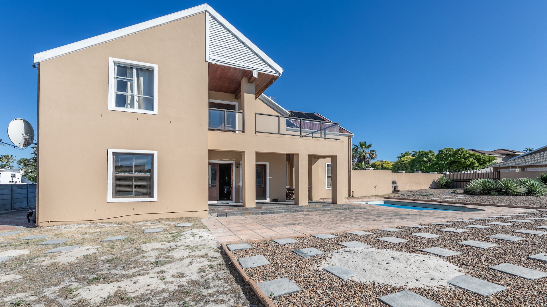 Stunning, spacious well positioned home with great finishings in all of its rooms. This home is perfect for a family looking to live close to the beach and is conveniently located to great schools and malls like Table Bay Mall and Eden on the bay. The My City bus is only a short walk away making transportation a breeze. As you enter into the spacious Entrance hall you are captivated by the charm of the open lounge, kitchen and dining room areas. The Kitchen has granite toppings, lots of cupboard space and a scullery. The Dining room has Patio doors leading to the spacious gardens that boast a swimming pool and entertainment area with a built in braai. Upstairs you will find another sunny lounge with a beautiful newly installed bar area. This lounge also opens up to a balcony that’s perfect for relaxing with family and friends on Summer nights. There i s an entertainment lounge that can also be converted into a tv lounge with doors that open up to another balcony. There are two ensuite Bedrooms upstairs and another located downstairs.