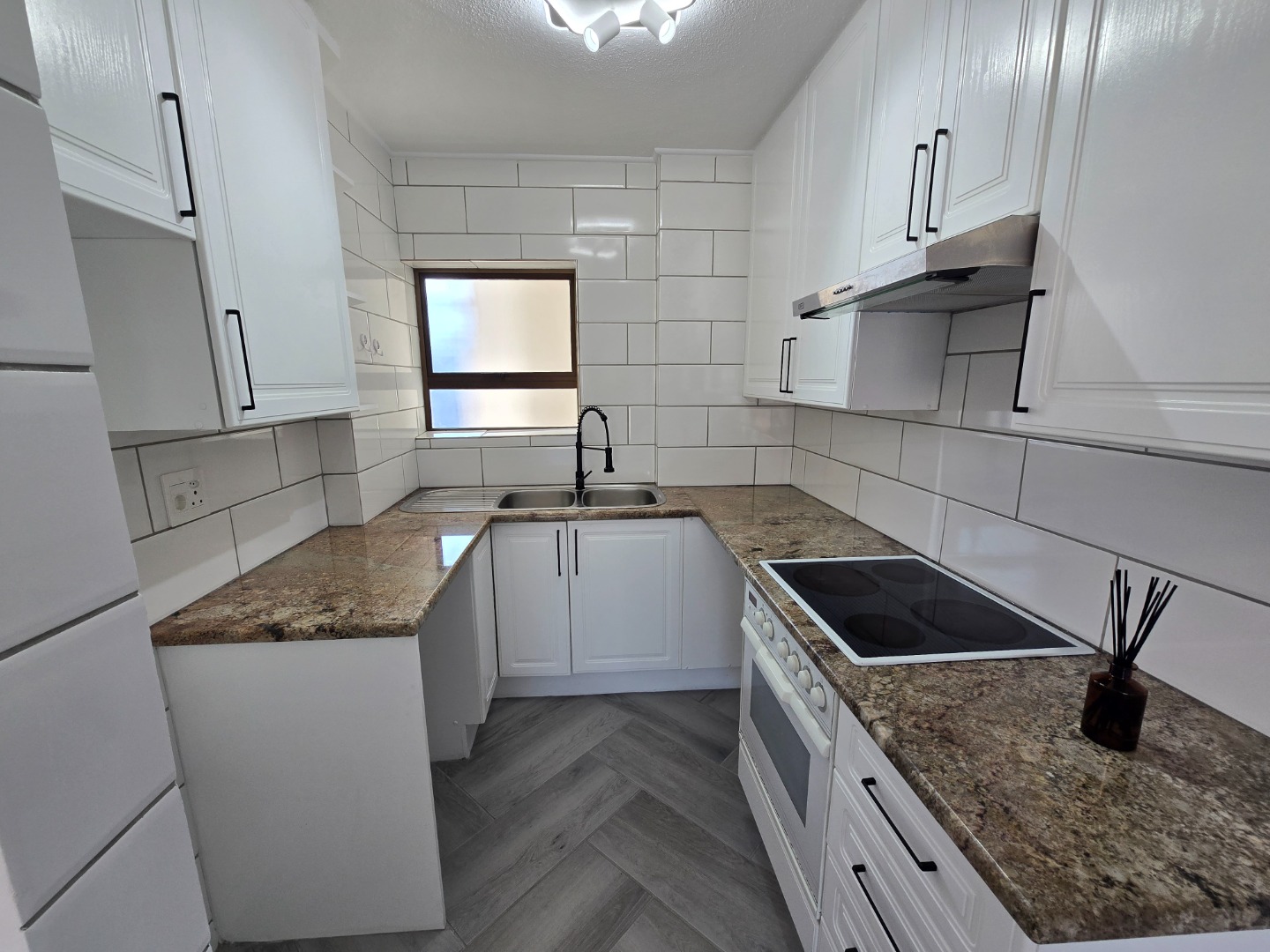 Offering lift access, this 2nd floor apartment is newly renovated and move in ready! The lounge and diningroom is open plan and flows out onto a very spacious balcony with sea views. The kitchen is well fitted and offers ample built-in cupboards as well oven, hob & extractor fan, and plumbing for appliances.