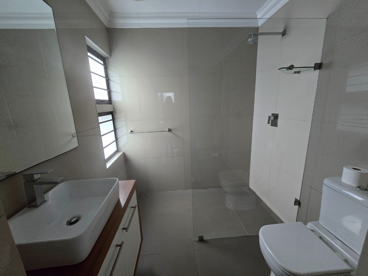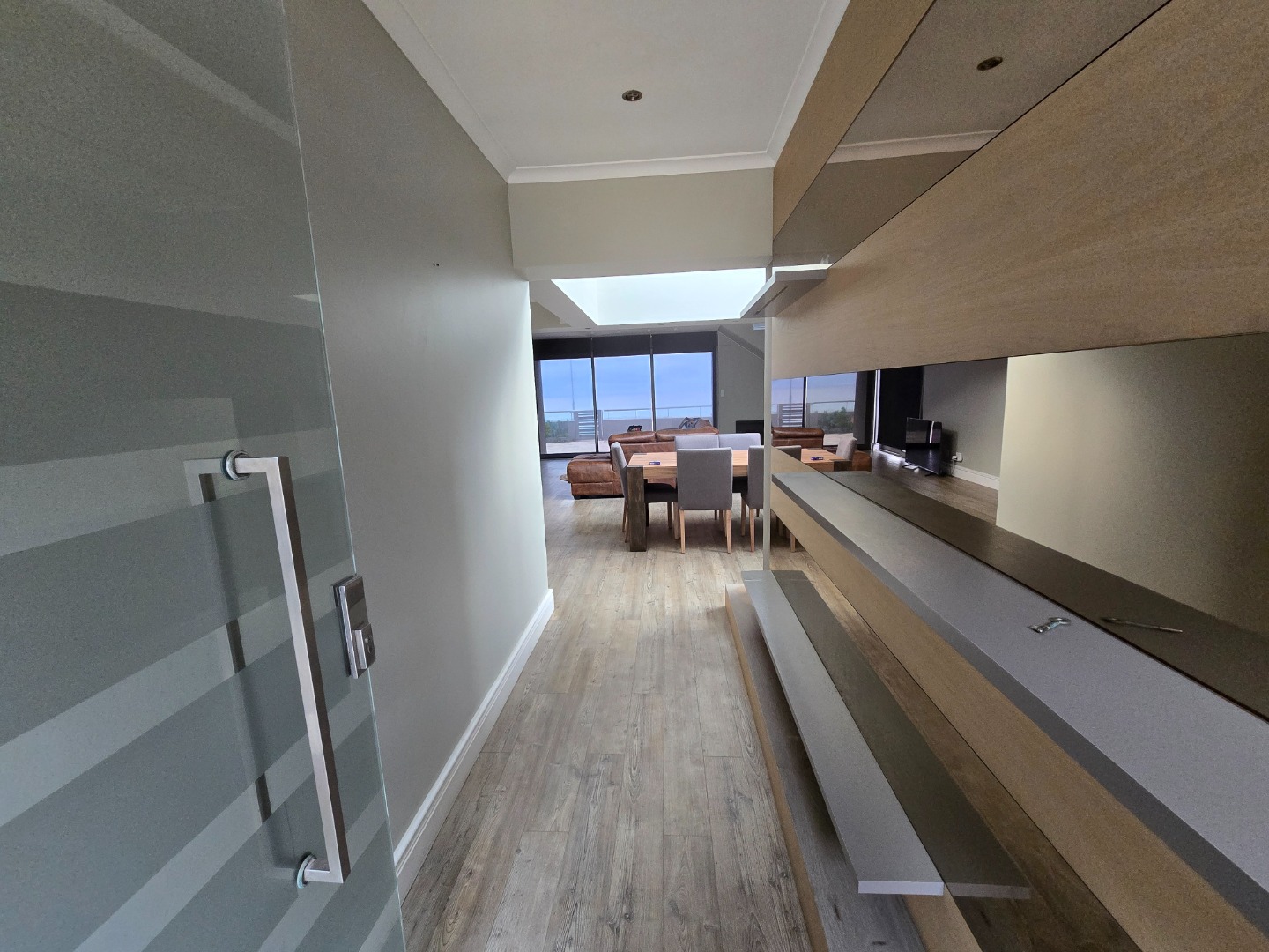 Modern bar open plan to expansive living area with stacking sliding doors opening up to the outside built-in braai area and sparkling pool. The lounge is spacious and open plan and fitted with a fireplace to warm the house on a chilly evening . The dining area offers double volume ceilings with windows, allowing the